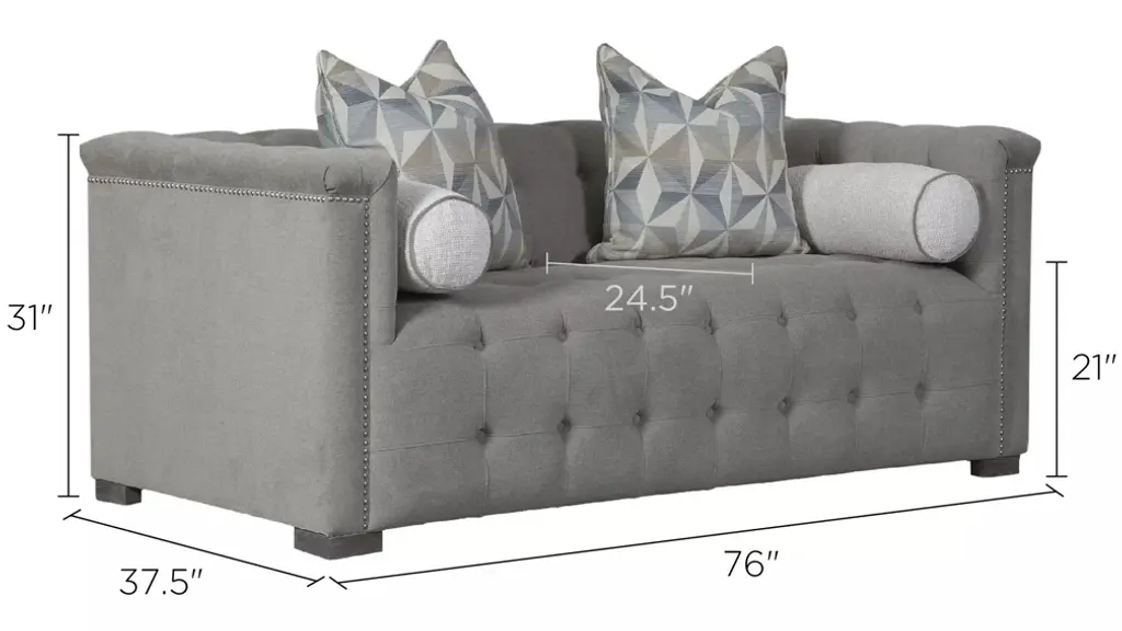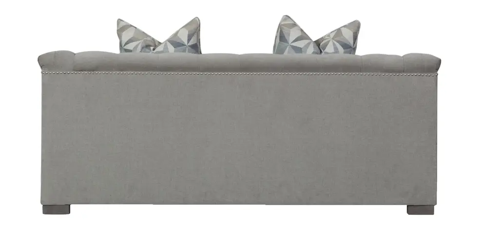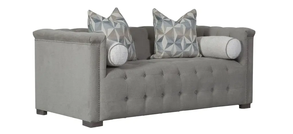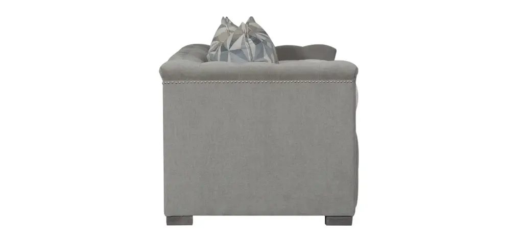The Diana loveseat is exotic, adventurous and glamorous. Rich hues in smoke and beautiful nailhead trim create a distinctive, unique and daringly sensuous look. Button-tufted plush polyester adorns this piece, while the accent pillows add fabulous flair.