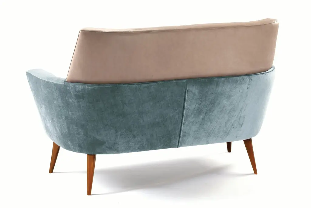 Round, smooth lines, with a combination of leather and velvet create the delicate balance of Doble settee. A spirit of class and tranquillity emanates from this comfortable settee.Materials chosen carefully for an elegant and refined result. Made to Order.