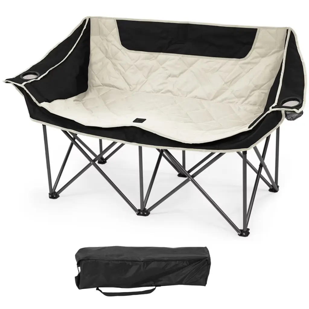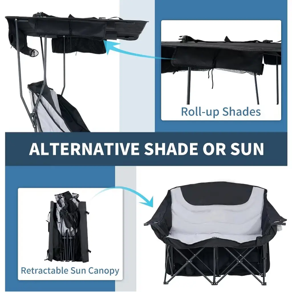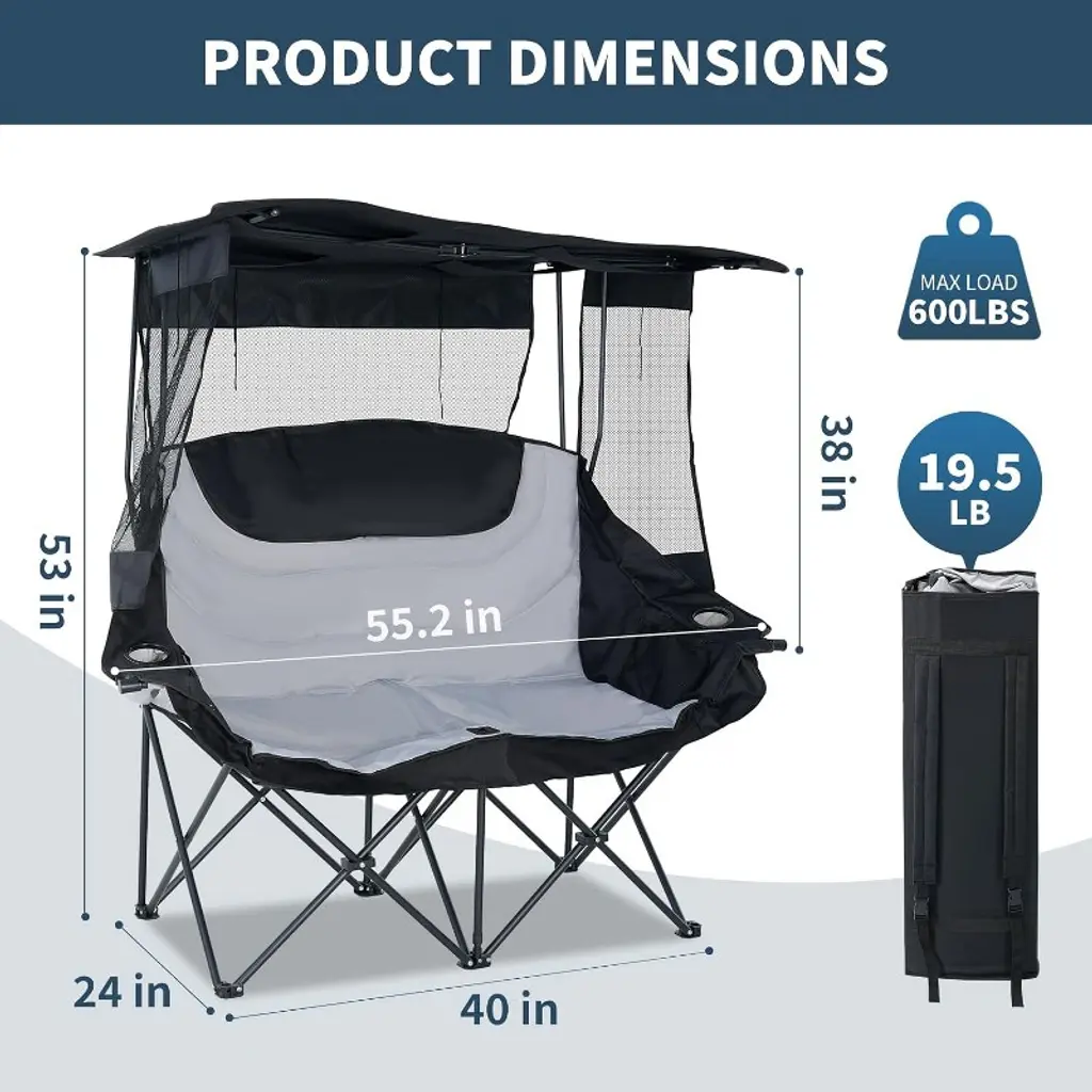 Ultimate Sun & Rain Defense:Our two-person chair features an oversized adjustable canopy with side shades, delivering 360° protection from harsh sunlight Heavy-Duty Durability:Built with a reinforced powder-coated steel frame, this double camping chair supports up to 250 lbs per seat (600 lbs total capacity). The 600D Oxford fabric combines breathability with rugged performance - quick-drying, tear-resistant All-Day Comfort, Effortless Portability:Experience ergonomic relaxation with our widened, contoured seat design that cradles your body. Despite its robust construction, the beach chair with canopy folds down to a backpack-friendly 19 lbs (10"x10"x38"), making it ideal for travel, camping adventures, or backyard gatherings Smart Storage Solutions:Stay organized with dual insulated cup holders (fits most tumblers/wine glasses), a front pouch, and a large rear storage pocket. Keep camp essentials within reach while maintaining a clutter-free space Your Go-Anywhere Outdoor Hub:From sandy shores to sports sidelines, festival fields to fireside chats, this versatile chair adapts to every adventure. The perfect blend of coverage, comfort, and convenience for shared moments outdoors