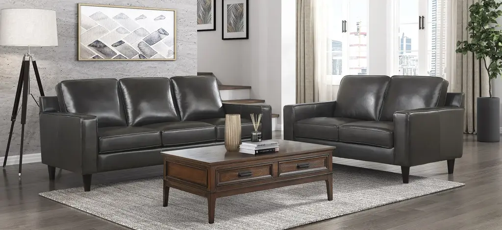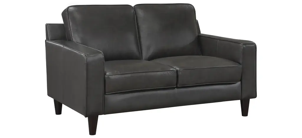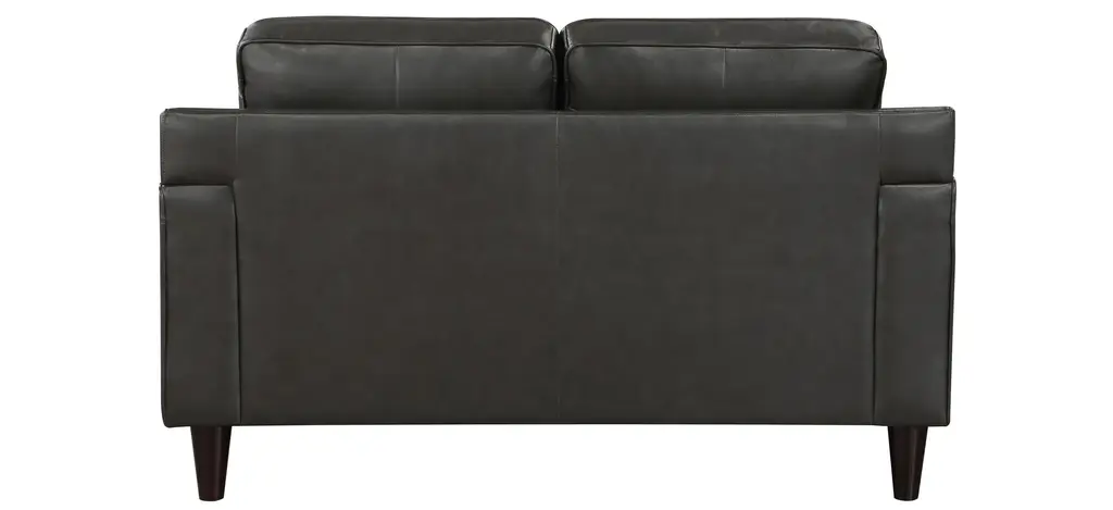 The tailored lines of the Donnell Loveseat harken to the retro-inspired refinement of mid-century design, their understated elegance a perfect pairing for your living room. Gray genuine leather covers the frame of the love seat, where the body touches, with faux leather match everywhere else. The modern profile of the collection is supported by conical legs, while track arms define the timeless look.