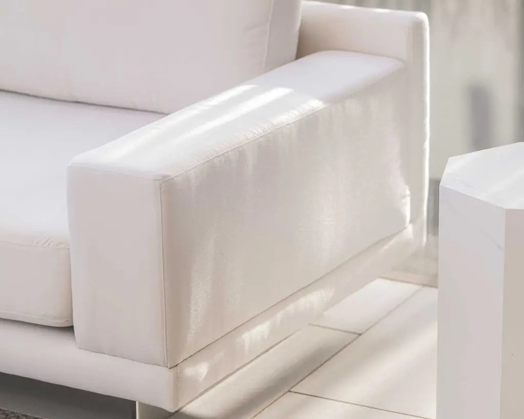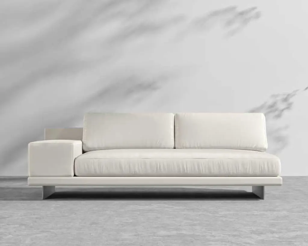 Compelling in its simple yet cutting edge style, the Dresden Outdoor Armless Sofa with Armrest brings a fresh perspective to contemporary outdoor living. The sleek, low profile frame is met with grand cloud-like seat cushions to create the statement making structure. The Dresden also balances the expansive seating with an interchangeable side table insert that is offered in white ceramic or black ceramic finishes. Grounded on aluminum metal legs, this piece's thoughtful composition demonstrates an exceptional opportunity for modern luxury in any outdoor space.