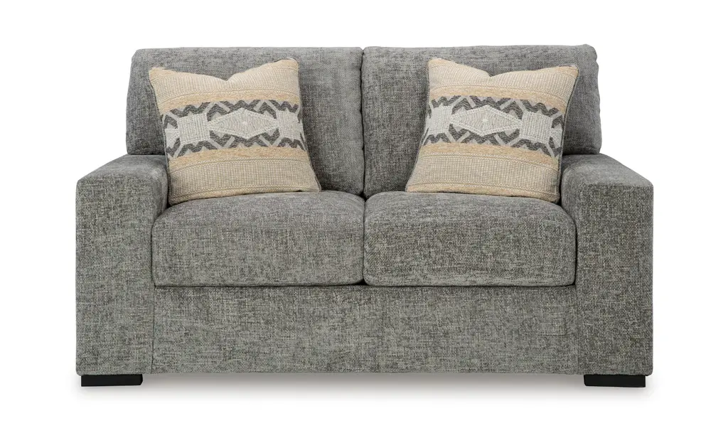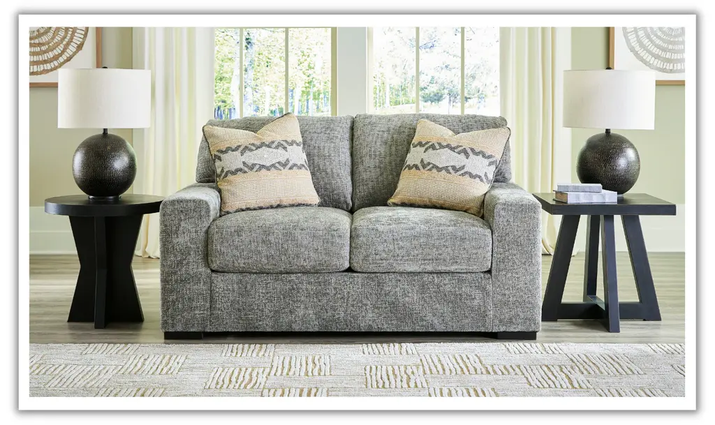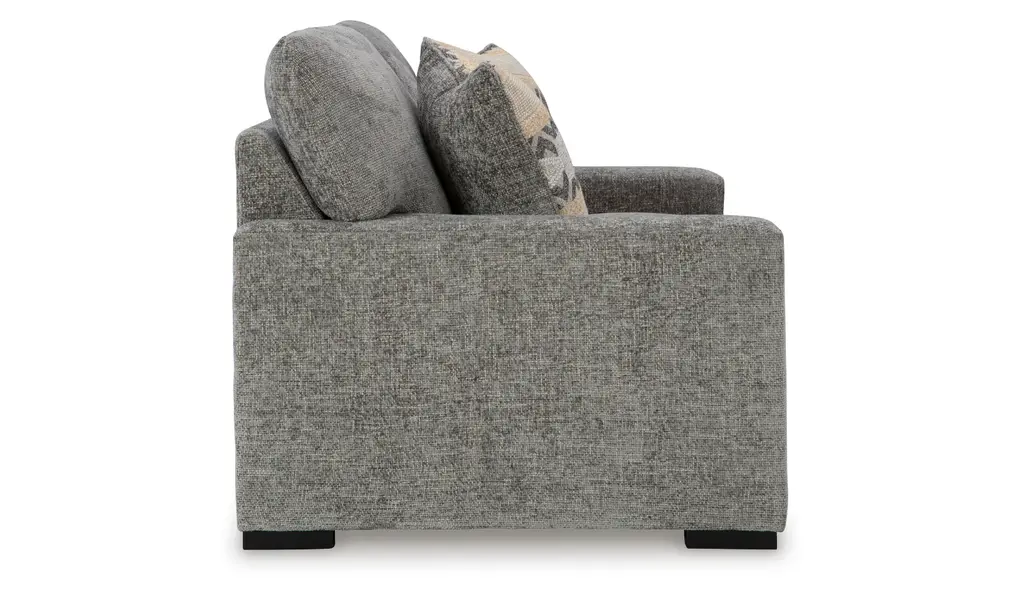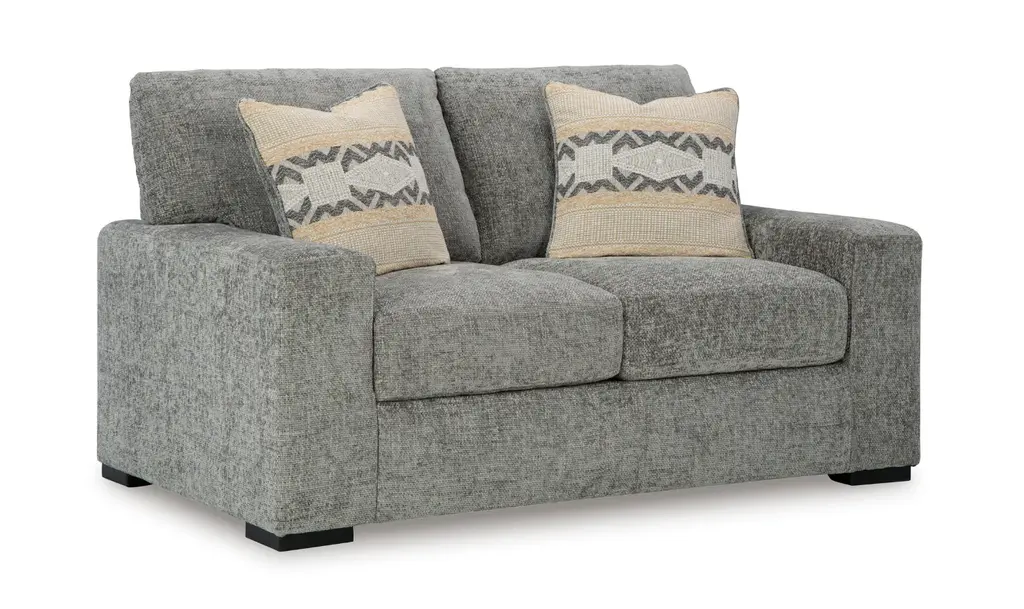 Introducing the Dunmor Loveseat in Graphite, a sanctuary for relaxation in your living space. Designed for those who prioritize unwinding over reclining, this loveseat offers a cozy retreat with its deep seating and luxuriously plush upholstery. Sink into comfort as the loose reversible seat and back cushions cradle you in softness, while the high-resiliency foam cushion, wrapped in a feather-fiber blend jacket, ensures enduring support. Included accent pillows, filled with a feather-fiber blend, add a touch of charm and coziness to your lounging experience. The polyester upholstery in sophisticated graphite effortlessly complements any decor, while the exposed feet with a faux wood finish lend a touch of elegance. Crafted with durability in mind, this loveseat features a corner-blocked frame and a platform foundation system that resists sagging three times better than traditional spring systems. Say goodbye to wrinkles and sags with the smooth platform foundation, maintaining a tight, wrinkle-free look over time. Whether you're curling up with a book or enjoying quality time with loved ones, the Dunmor Loveseat promises unparalleled comfort and style. Upgrade your relaxation space with this inviting addition today.