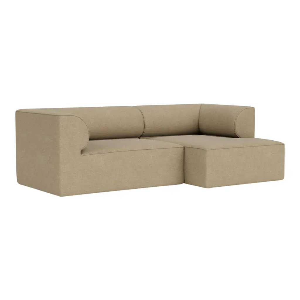 The Eave Modular Sofa 2-Seater Configurations 5-6 from Audo Copenhagen transform living spaces through architectural forms enhanced with extended lounging capability. Created by the visionary Norm Architects studio, these thoughtfully composed arrangements pair a corner module with a chaise lounge module to create dynamic two-seaters that balance intimate conversation with luxurious relaxation. The distinctive design takes its name from the "eaves" of a roofa concept elegantly expressed in the curved backrests that create a protective, embracing sensation. Configuration 5 positions the corner module on the left with the chaise extending to the right, while Configuration 6 reverses this orientationallowing you to select the perfect arrangement for your specific floor plan and traffic flow. Both configurations create substantial seating that invites different postures and activities. The L-shaped composition defines space with architectural precision while providing versatile functionality for contemporary living patterns. Exceptional craftsmanship defines every aspect of these configurationsfrom the robust internal structure of pine, plywood, and MDF to the system of no-sag springs and high-resilience foam that maintains consistent comfort while preserving its shape through years of use. The thoughtfully designed seat height and depth create an ideal balance between support and relaxation, while the extended chaise section invites full-body lounging for reading, conversation, or contemplation. Available in a range of premium upholstery options, these configurations allow for personalization while maintaining their distinctive architectural character. Perfect for creating primary seating in living rooms, defining relaxation zones in open-concept spaces, or establishing sophisticated lounge areas in hospitality settings, Configurations 5-6 exemplify Norm Architects' "soft minimalism" approachwhere nothing can be added or taken away without compromising the design's integrity. These complete arrangements offer turnkey solutions while maintaining the flexibility to reconfigure your seating over time, embodying the thoughtful versatility that defines the entire Eave collection.