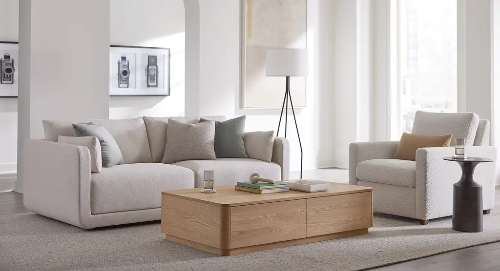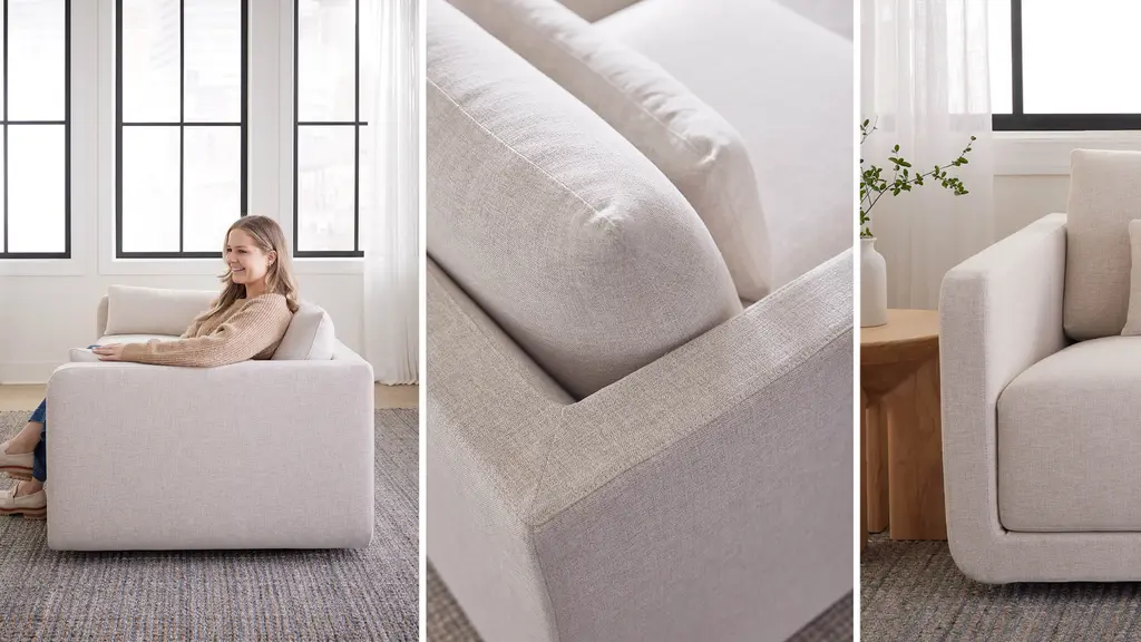 DESIGN The Eva loveseat has all the right curves in all the right places. This Scandi-inspired design creates a sheltering silhouette that's anything but ordinary. Plush deep seat cushions, casual pillowy-soft back cushions, and canted seat and back construction make Eva our most comfortable sit yet. Sculptural and cozy proportions effortlessly strike the balance between formal and lounge-y. Included accent throw pillows allow you to customize how you relax; use them for extra lumbar support or added cushion against the loveseat arms. Eva's lower seat height, canted seat, and full back support offer a modern look that's designed for comfort. Hidden legs make Eva appear to float and accentuate the fluid lines of its curved frame. Handcrafted in the USA. FEATURES Solid Foundation: Our frames are constructed from precision-cut, FSC-certified engineered wood for unmatched strength and stability, featuring reinforced, interlocking joinery for added durability. Crafted for Coziness & Durability: Foam & fiber cushions offer our most supportive yet comfortable sit with a sleek, tailored look that requires minimal fluffing. These cushions feature high-quality, high-resiliency CertiPUR-US® foam core seats wrapped in premium fiber with fiber-filled back cushions. CertiPur-US® foam is held to the highest standards of product safety and durability, so you can rest easy. Supportive Webbing Suspension: Designed to maximize comfort, our premium webbing system provides a resilient foundation. Customizable Upholstery: Choose from a vast selection of durable premium and performance fabrics and genuine Italian leather to personalize your Eva Loveseat's look.
