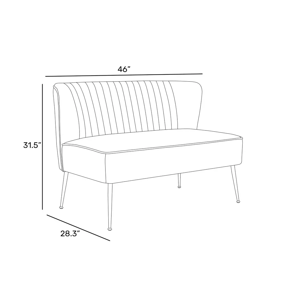 Step into your haven of relaxation with the Farrah Upholstered Velvet Polyester 46" Wide Loveseat - Armless/ Scalloped Back. Sink into the sumptuous comfort of the channel-tufted backrest and luxurious velvet fabric, creating an atmosphere of tranquil escape. The metal legs, elegantly flared and adorned with a gold finish, add a touch of sophistication to this intimate retreat. Crafted with care, the loveseat features dense polyurethane foam and sinuous springs, ensuring enduring comfort and support. Ideal for your bedroom, cozy nook, or any spot where you seek intimate solace, the Farrah Loveseat is your invitation to a space where quiet respite and personal leisure converge.Features: Dimensions: Additional Details: