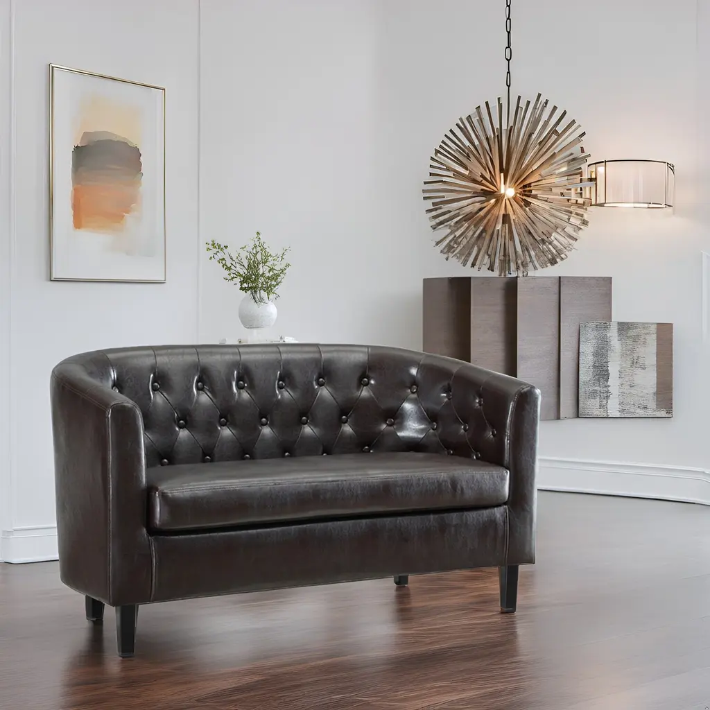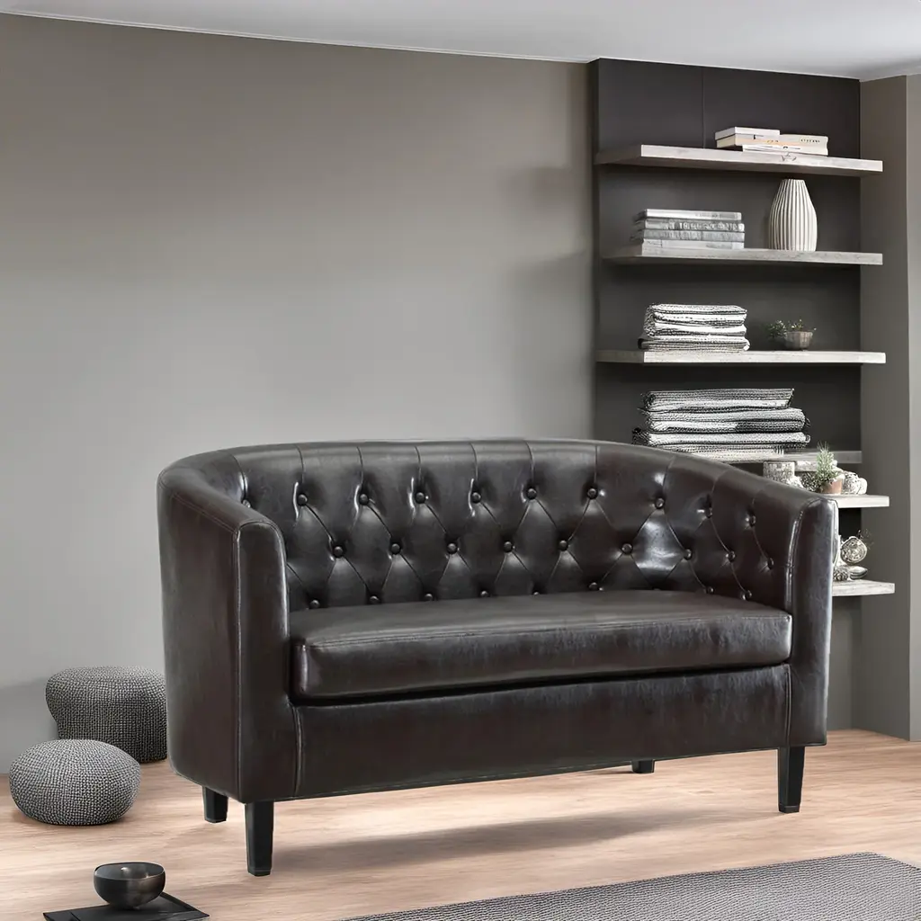 Faux Leather Button Tufted Barrel Loveseat, Mid-Century 2-Seater Sofa - Espresso