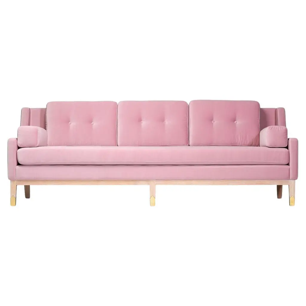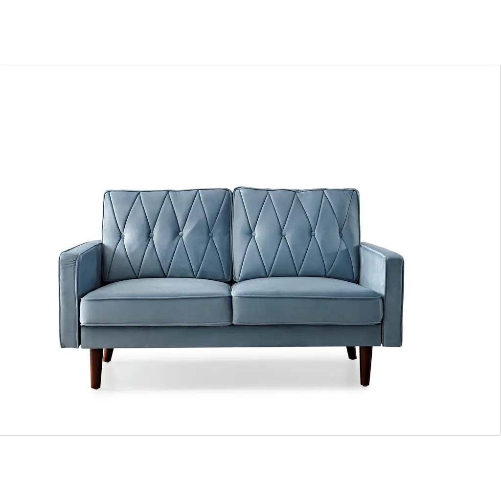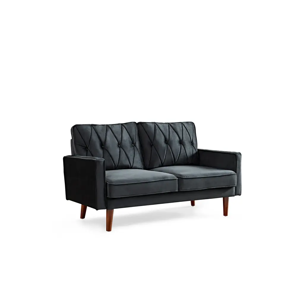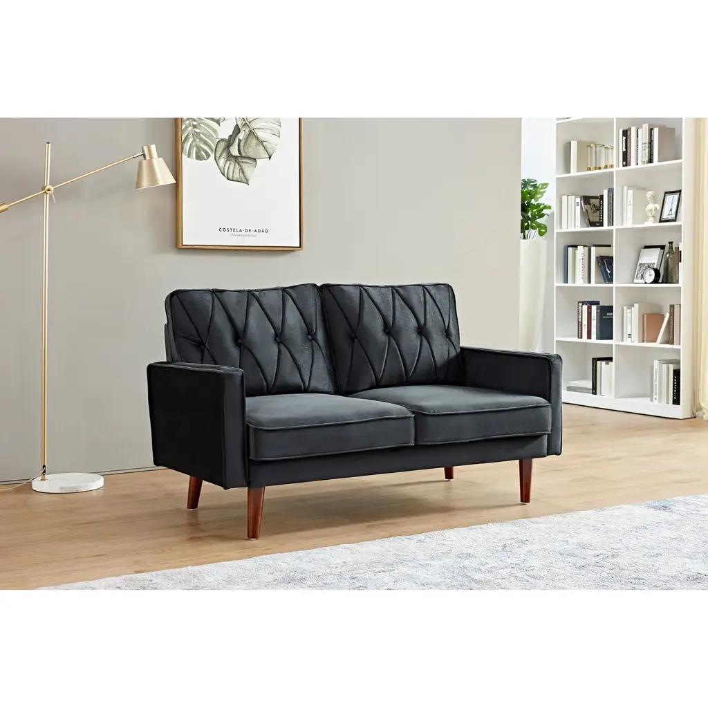 Get comfortable in style with the Feemster Velvet Tufted Cushion Back Loveseat. This modern mid-century loveseat has a streamlined silhouette, round tapered legs, and a solid wood frame. The velvet fabric upholstery is accented with corded edges and button tufting for a tailored touch. With web suspension, a single firm foam-filled seat cushion, and a pair of velvet fabric bolster pillows, this loveseat provides optimal comfort for your relaxation needs.Features: