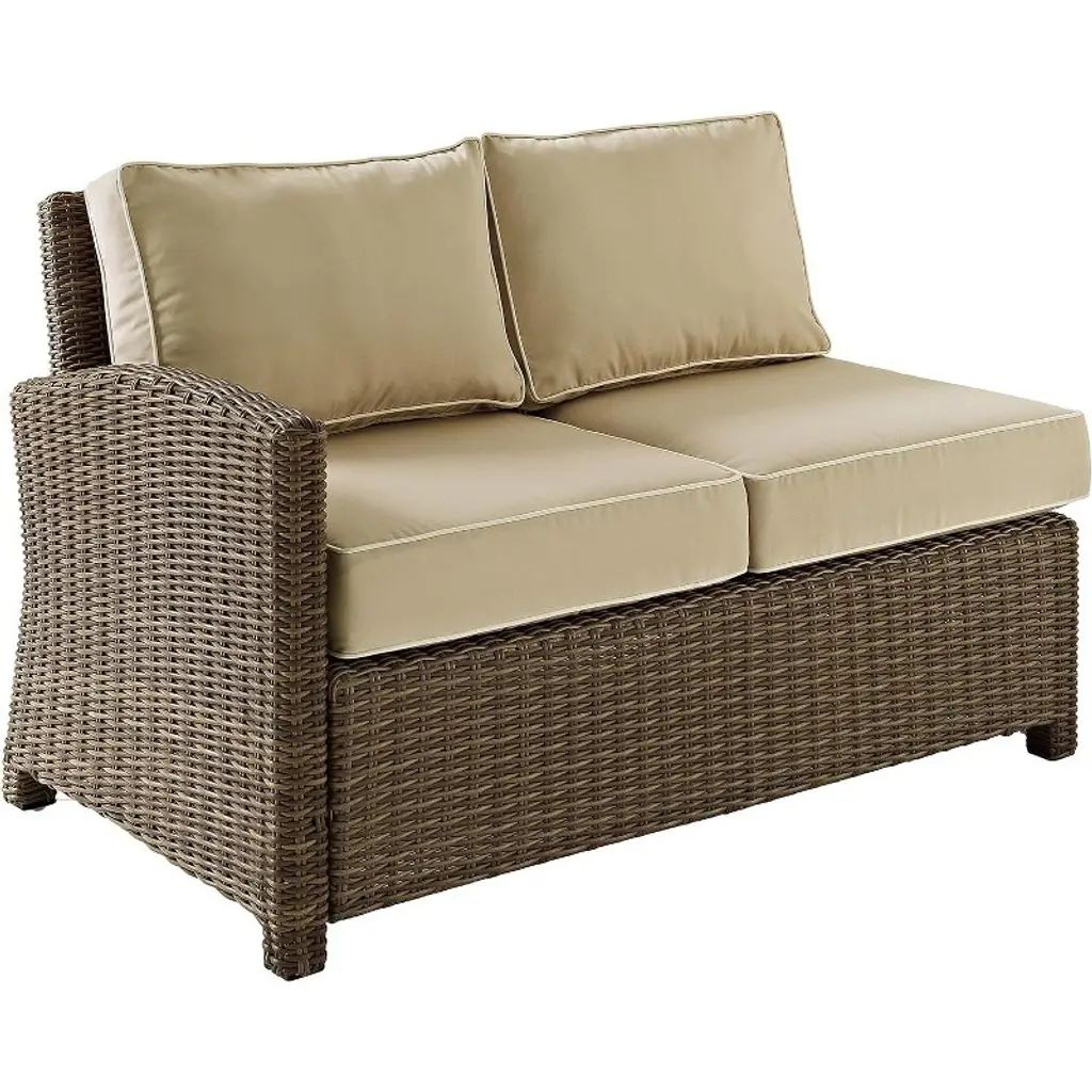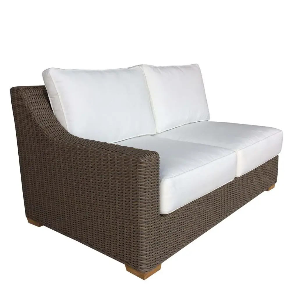 Create an amazing outdoor space with this comfortable and stylish chocolate brown patio loveseat. The durable resin frame offers a stylish appearance which replicates rattan. Deep seating enhances the comfort level. Beige all-weather cushions will hold up all season long. Clean spills with a water-based cleaner or the cushions are zipper removable for washing purposes. Curl up with your latest read, or just relax and enjoy the outdoors with family and friends and create lasting memories! Additional Features: CAL 117 Fire Retardant Foam, Deep Seated Comfort, Durable Resin Frame Construction, Plastic Block Feet, Overall Height Without Cushion: 30"; Back Height From Seat Without Cushion: 16.25"; Seat Depth Without Cushion: 21"