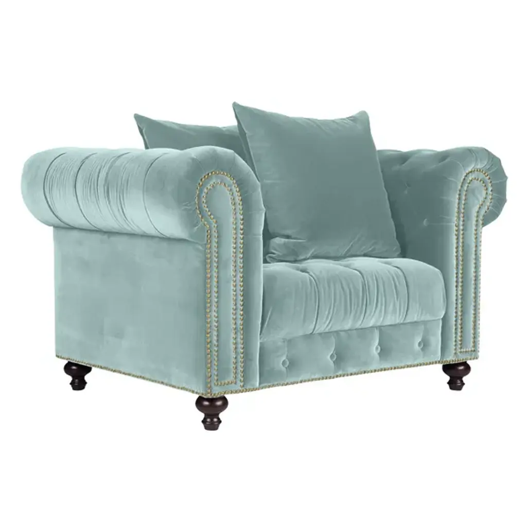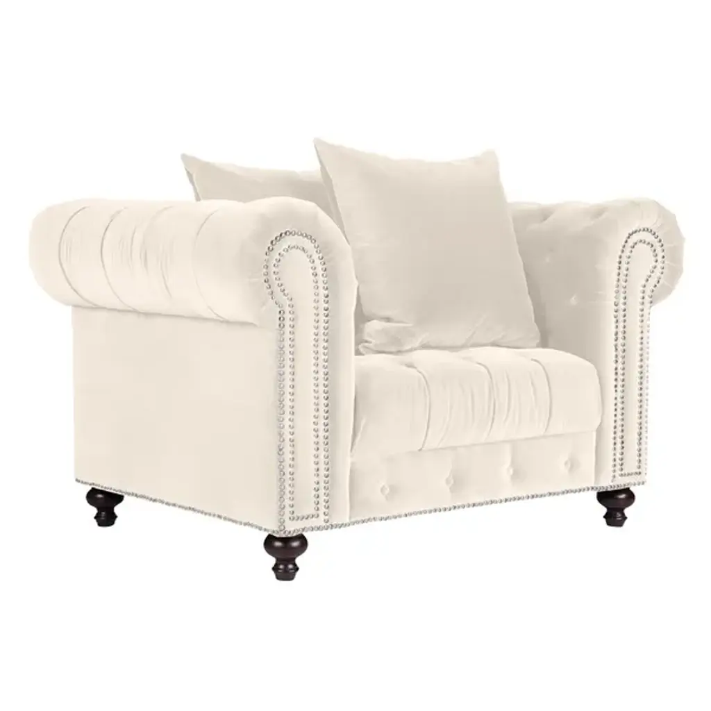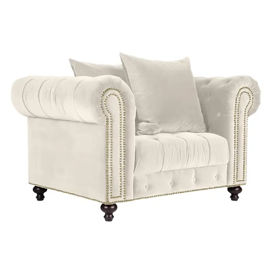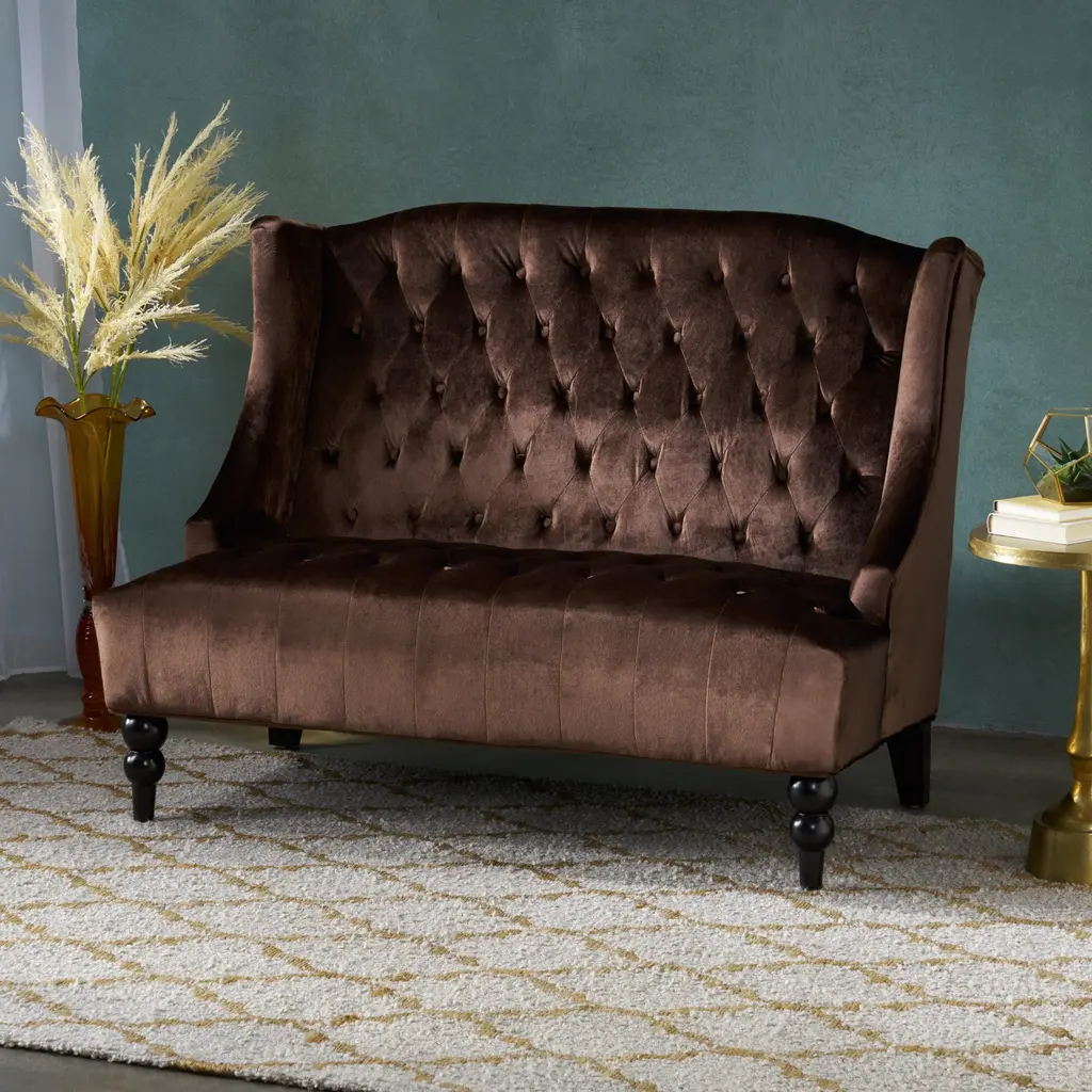 Have a seat on the sumptuous Flax 2-seater loveseat. A solid wood frame construction, foam padding, and velvety fabric upholstery come together to create the modern and contemporary design of the Flax. The gently rolled seat back is also button-tufted, giving this loveseat luxurious details. Adding to the resplendent style of the Flax are espresso-finished, ball-turned wood legs. Bring an air of luxury and traditional style to your living room, private office, or reception area. Made in China, the Flax requires assembly. Dimensions: 28.74" High x 47.24" Wide x 26.77" Deep; Seating Dimensions: 19.69" High (from Floor) x 47.24" Wide x 22.05" Deep; Arm Height: 12.99" High; Height (from Floor to Top of Arms): 28.35" High; Back: 9.06" High; Legs: 9.84" High