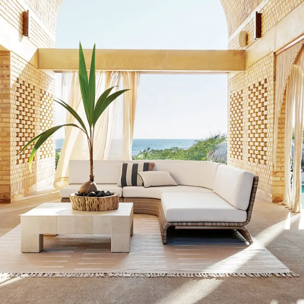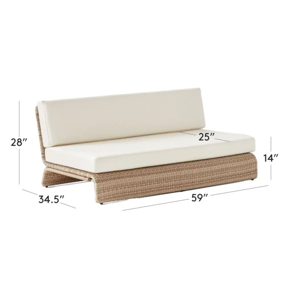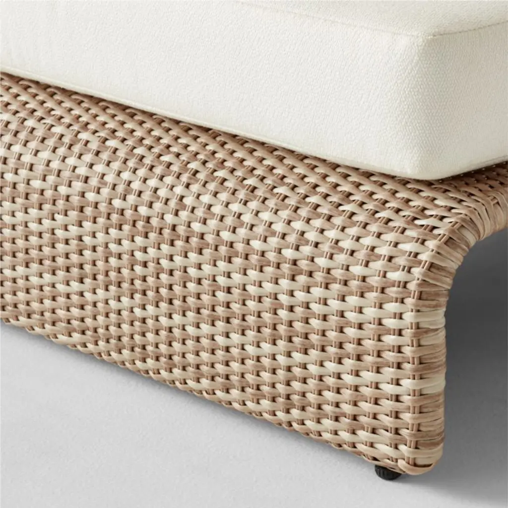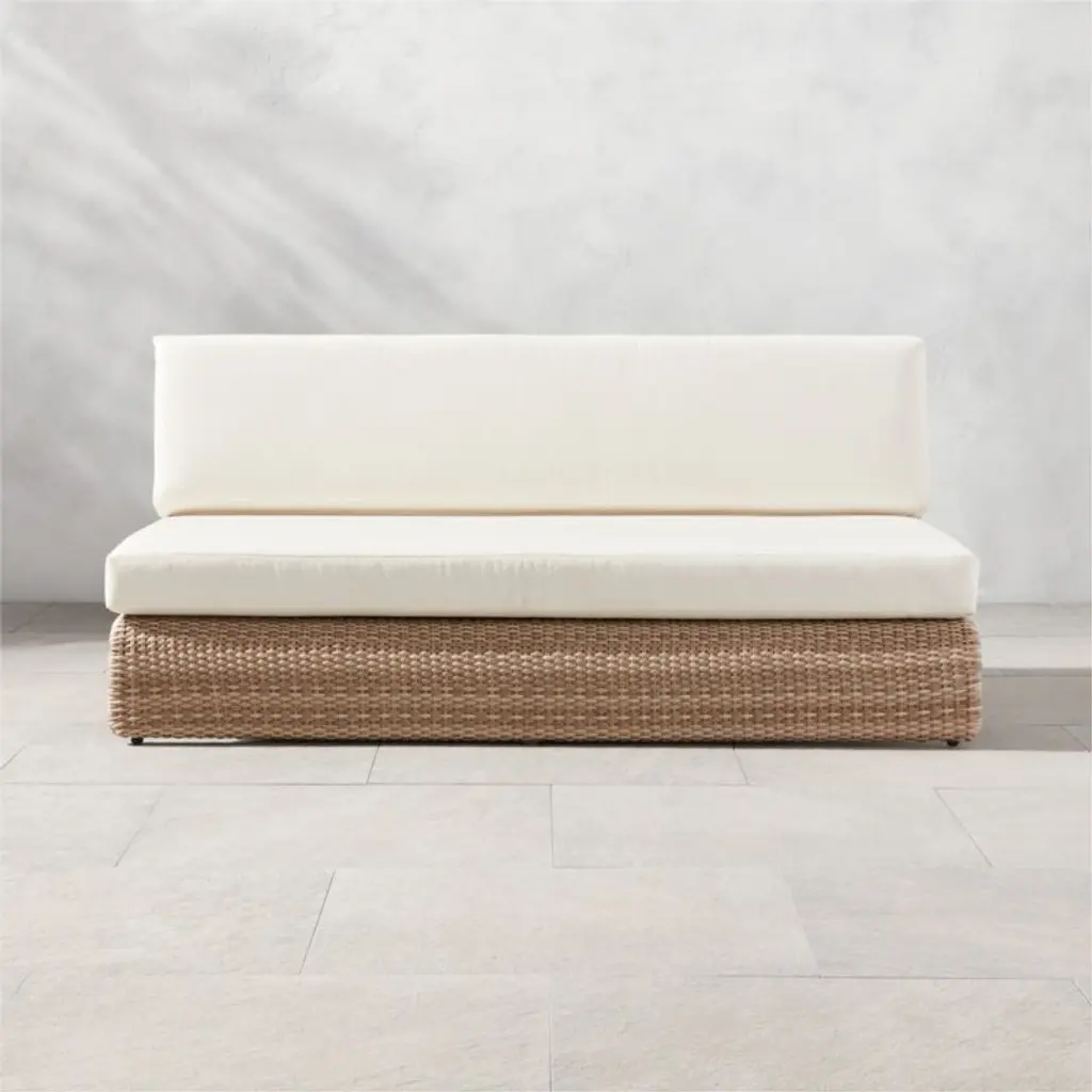 Modern woven loveseat adds personality to any outdoor lounge space. Designed by VUUE, the softly curved frame is wrapped in a woven resin rattan for a look that's both natural and sculptural. Large, plush cushions are sewn from a textured Sunbelievable fabric which is durable, comfortable, easy to clean and color-stable. Everything you want in an outdoor textile. Pair with the armless and corner chair as a sectional or individually for a smaller outdoor area. CB2 exclusive.