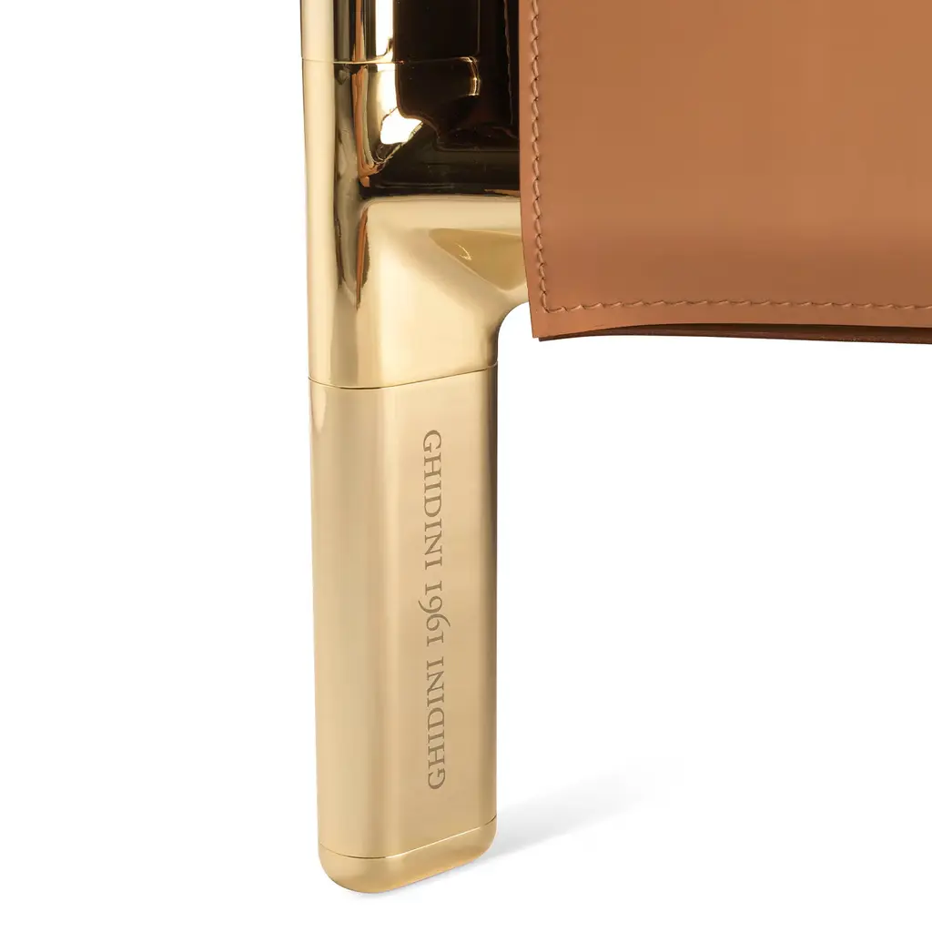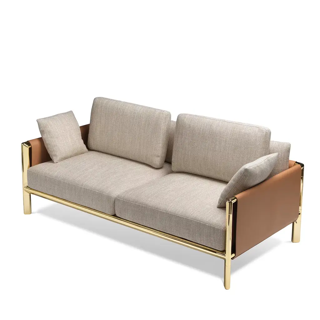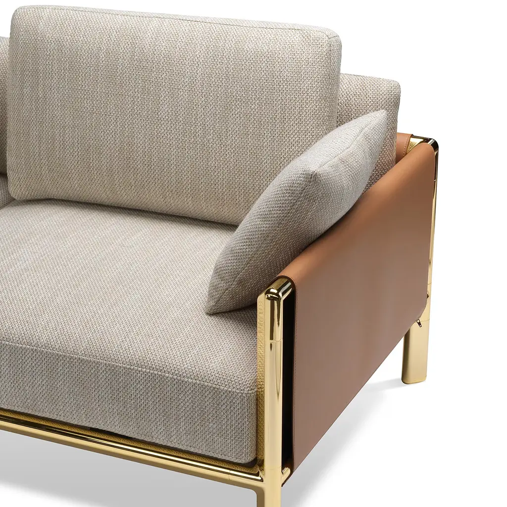A magnificent combination of lines, hues, and materials, this two-seat sofa will make a refined statement in any classic or modern decor. A combination of the two styles, it rests on a polished gold-finished structure enriched on the armrests with two brown leather upholsteries. The seat and back cushions are softly padded and upholstered with a refined beige fabric. Please consult the Concierge for further details and customization options. For the US market, please contact the Concierge for CAL TB 117 certified fabrics.