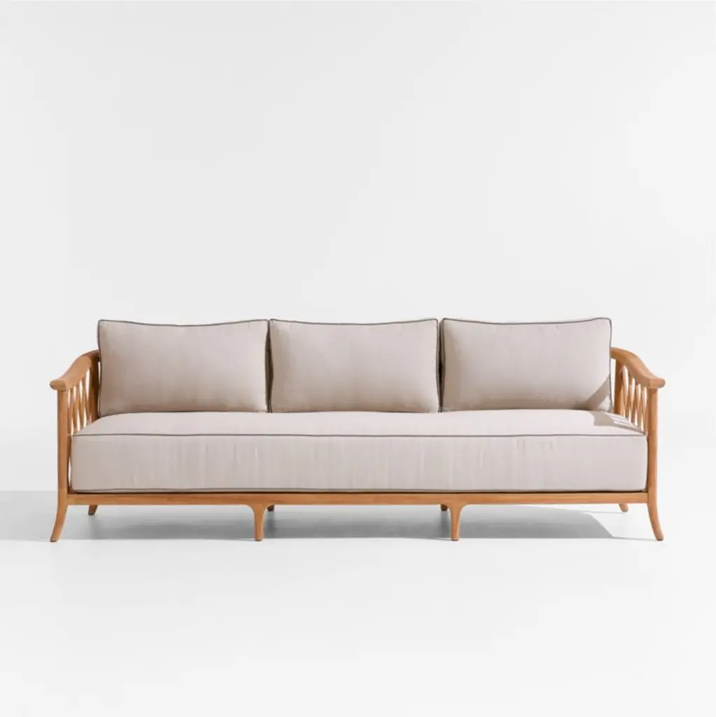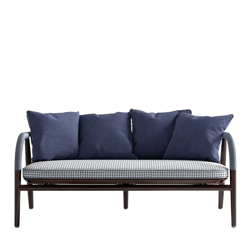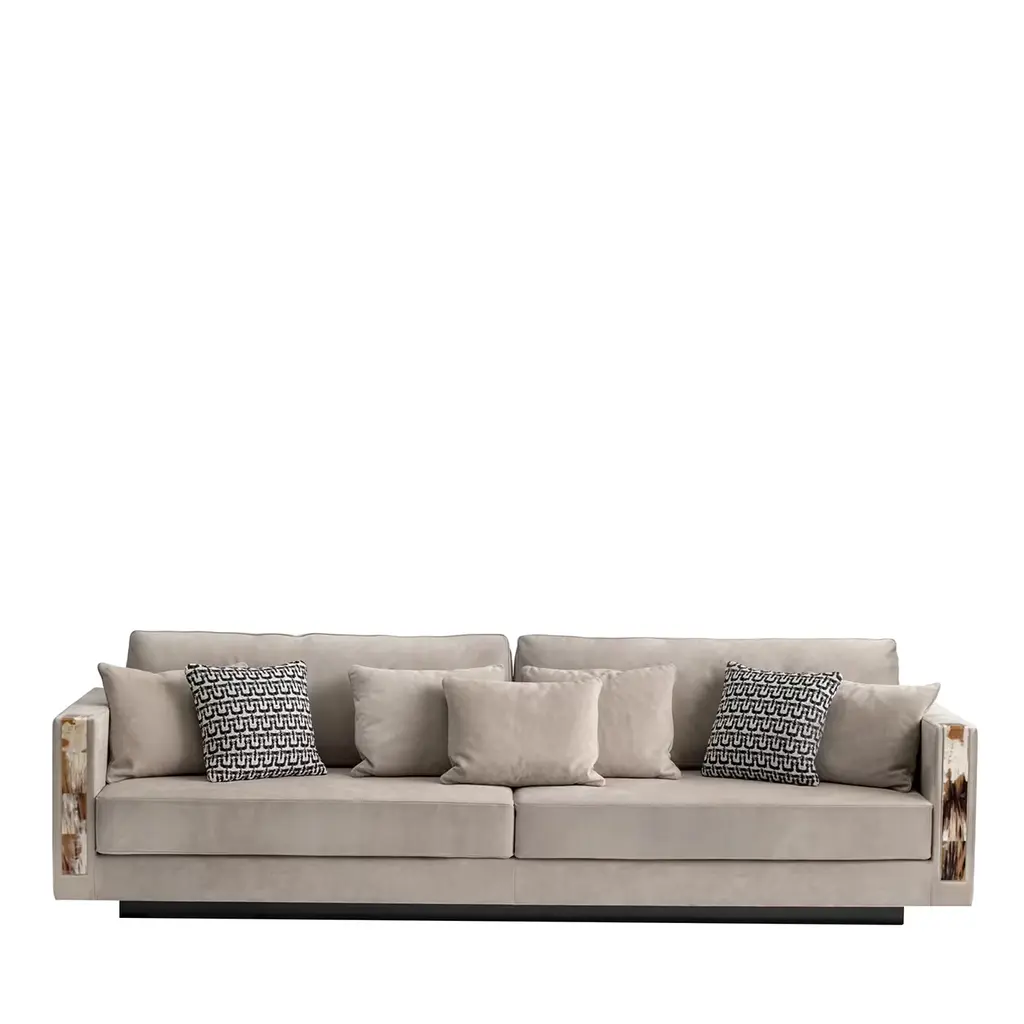 A magnificent combination of lines, hues, and materials, this two-seat sofa will make a refined statement in any classic or modern decor. A combination of the two styles, it rests on a polished gold-finished structure enriched on the armrests with two brown leather upholsteries. The seat and back cushions are softly padded and upholstered with a refined beige fabric. Please consult the Concierge for further details and customization options. For the US market, please contact the Concierge for CAL TB 117 certified fabrics.