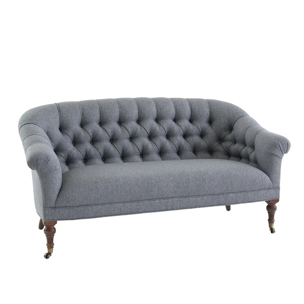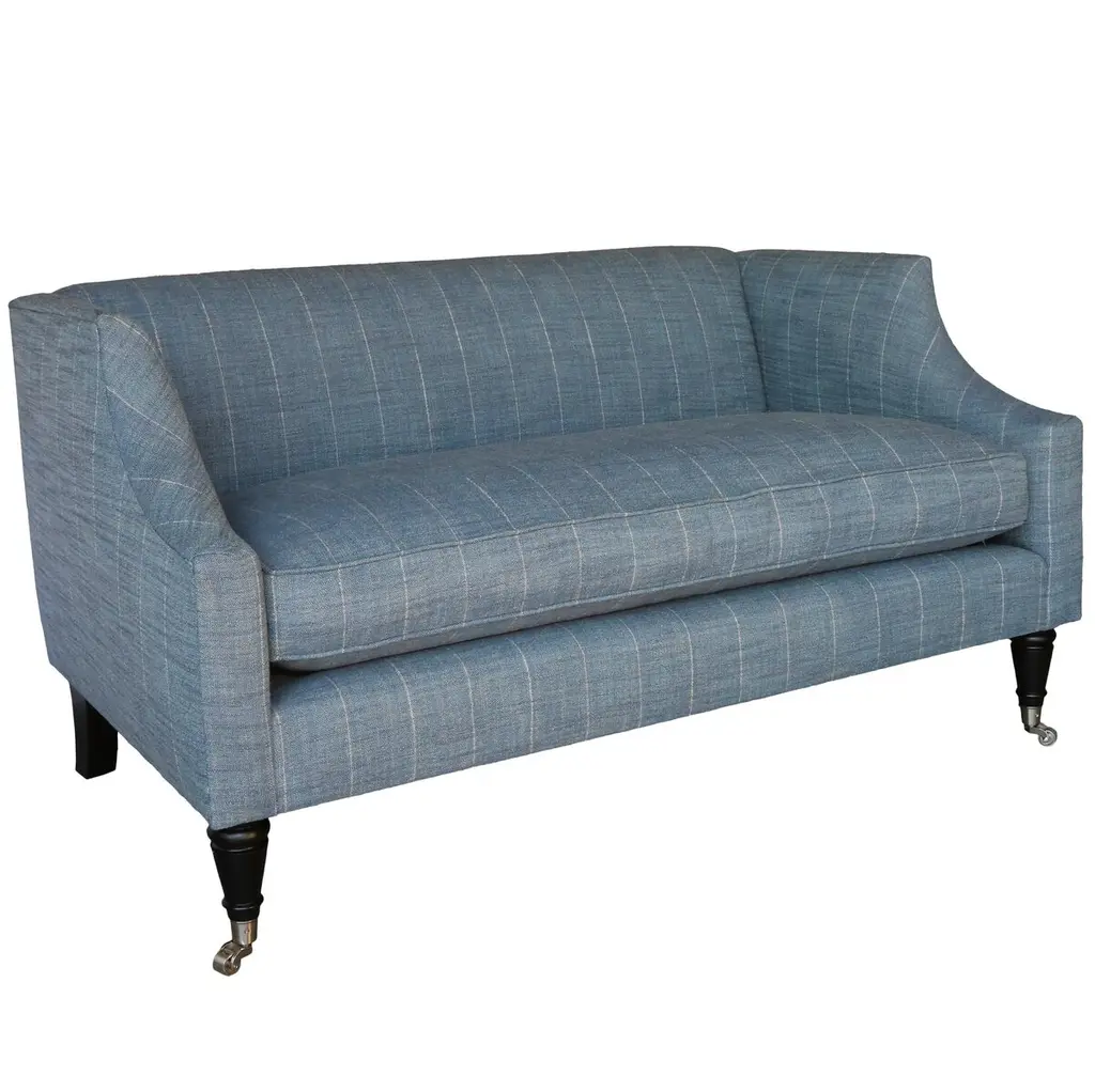This swoop-arm settee boasts a denim-blue linen blend with performance finish and beautifully turned alder legs. Generous foam-and-fiber padding ensures long-lasting comfort and support, while front caster wheels protect sensitive floors from scratching and marring. Handcrafted in the USA.