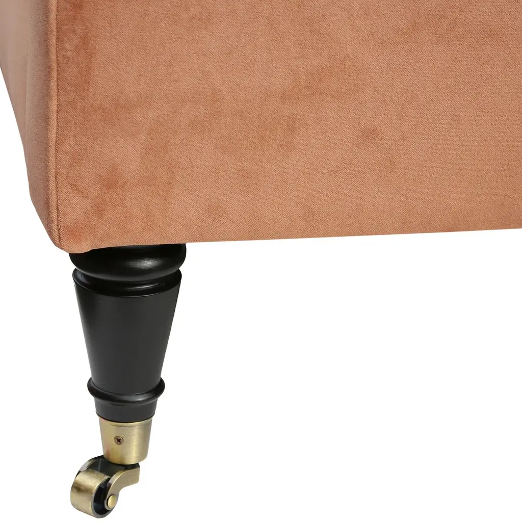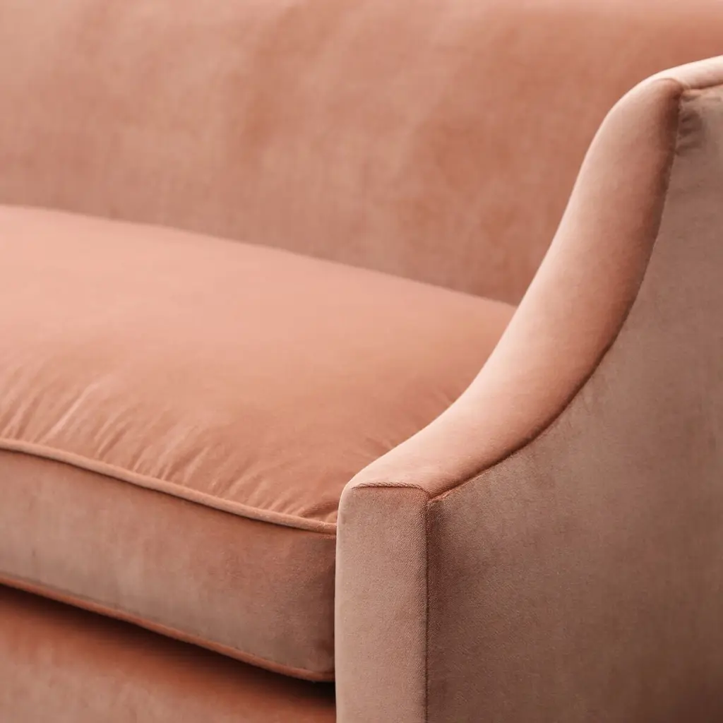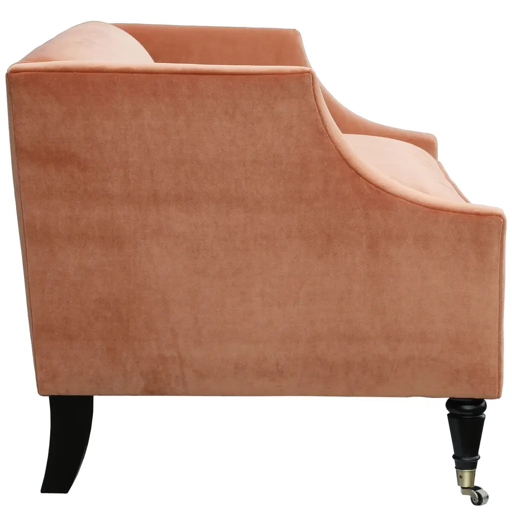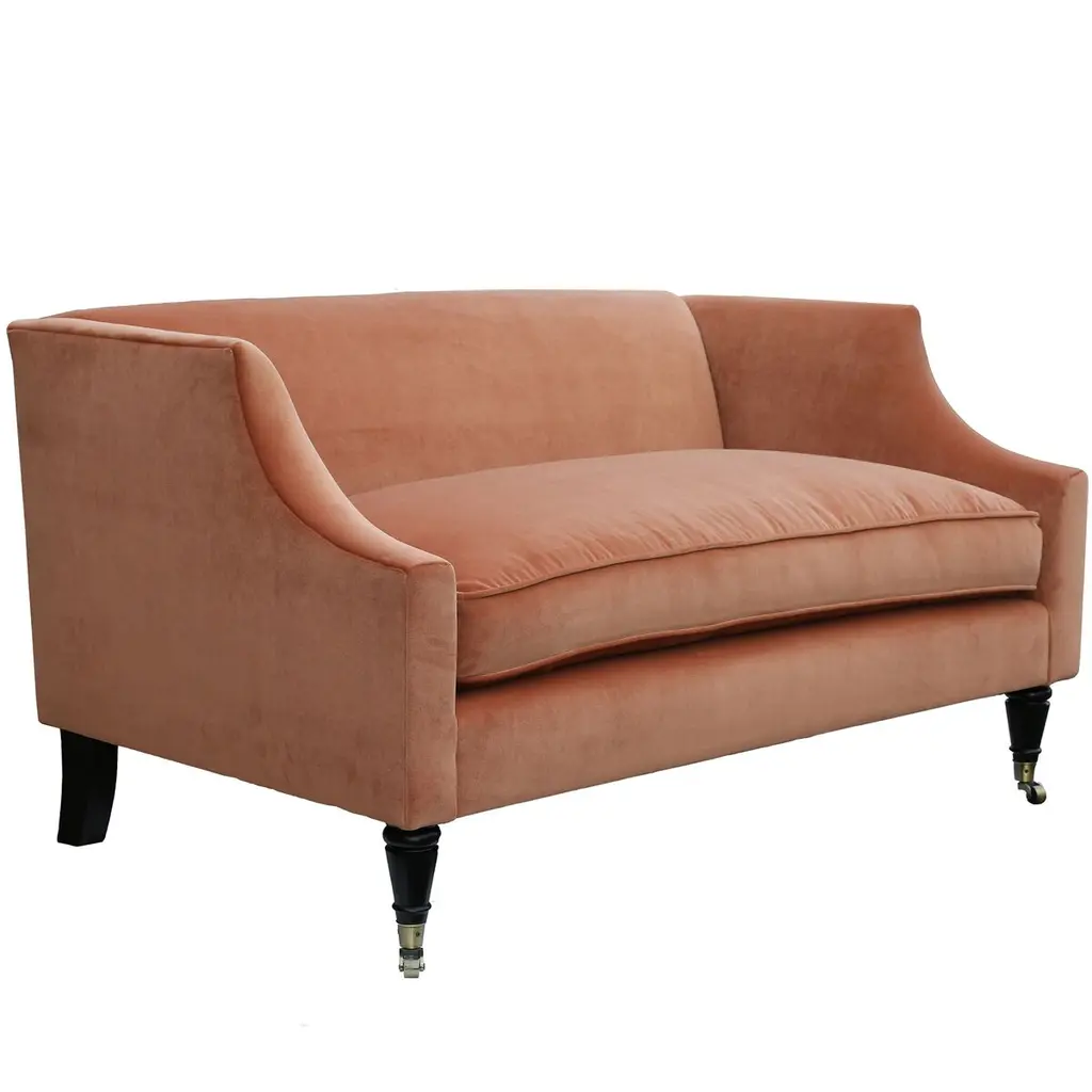 This swoop-arm settee boasts performance velvet upholstery and beautifully turned alder legs. Generous foam-and-fiber padding ensures long-lasting comfort and support, while front caster wheels protect sensitive floors from scratching and marring. Handcrafted in the USA.