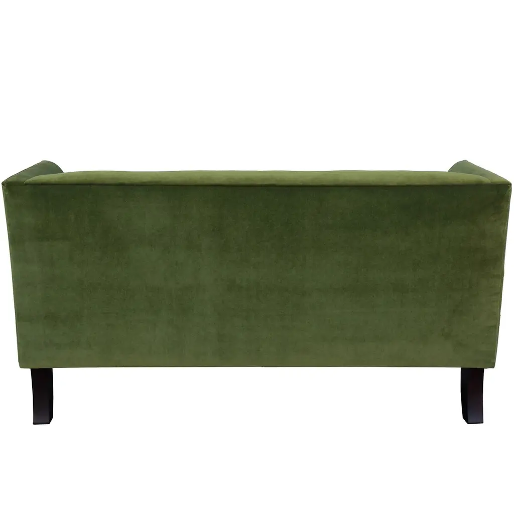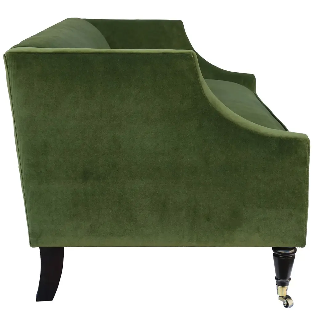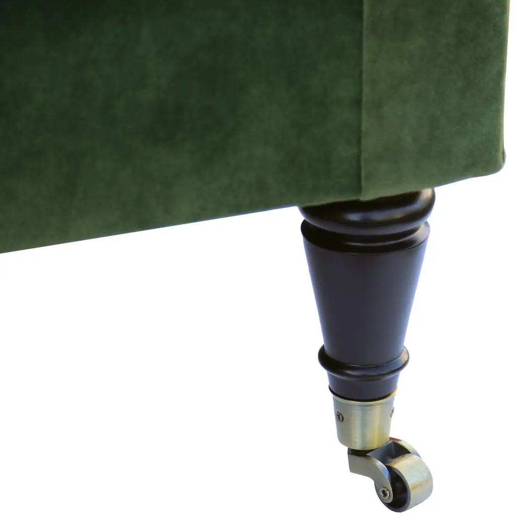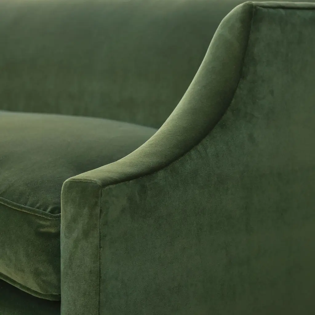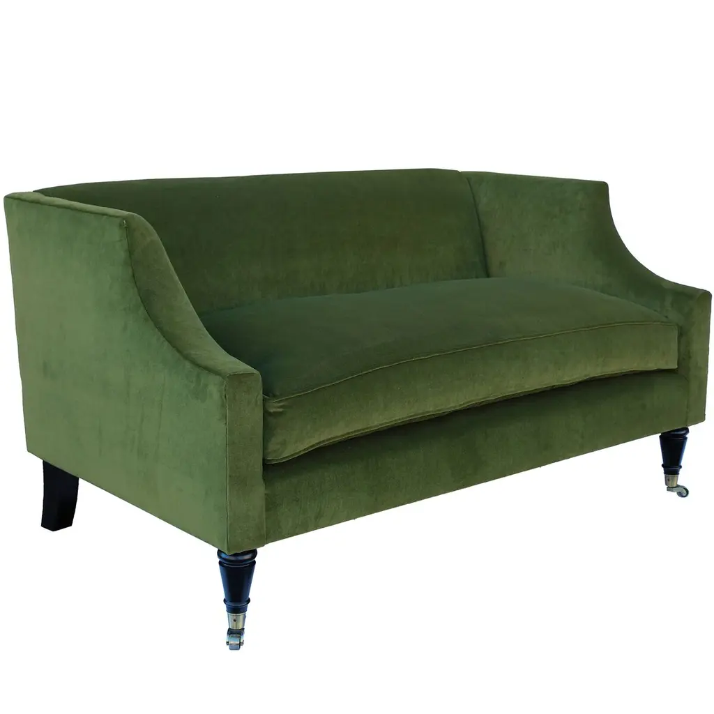 This swoop-arm settee boasts performance velvet upholstery and beautifully turned alder legs. Generous foam-and-fiber padding ensures long-lasting comfort and support, while front caster wheels protect sensitive floors from scratching and marring. Handcrafted in the USA.