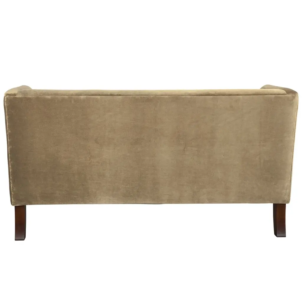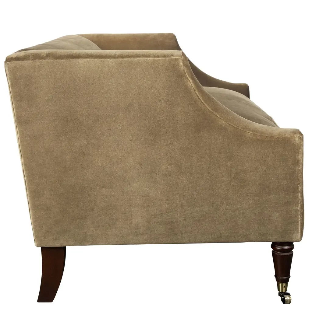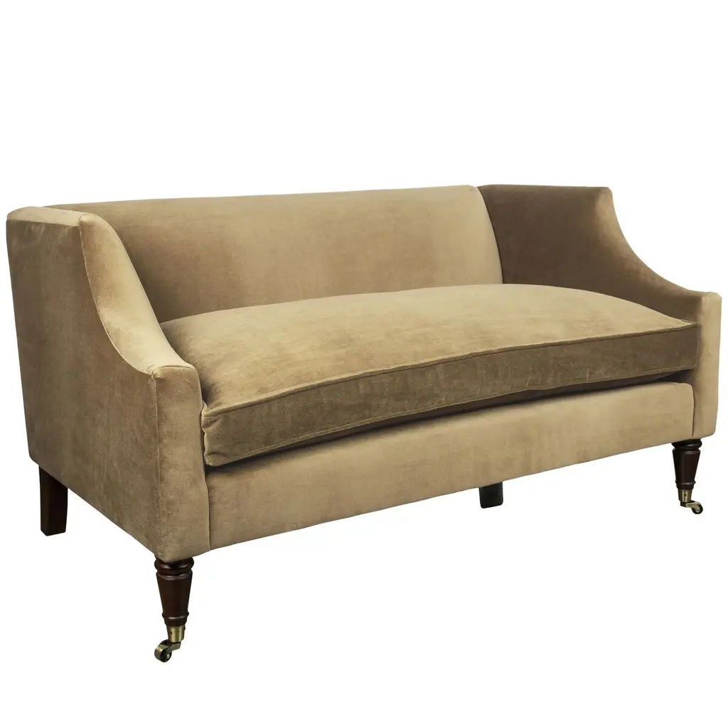 This swoop-arm settee boasts performance velvet upholstery and beautifully turned alder legs. Generous foam-and-fiber padding ensures long-lasting comfort and support, while front caster wheels protect sensitive floors from scratching and marring. Handcrafted in the USA.