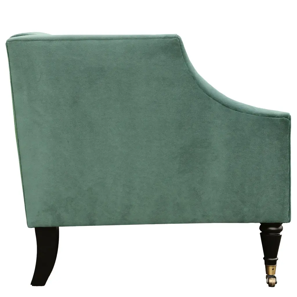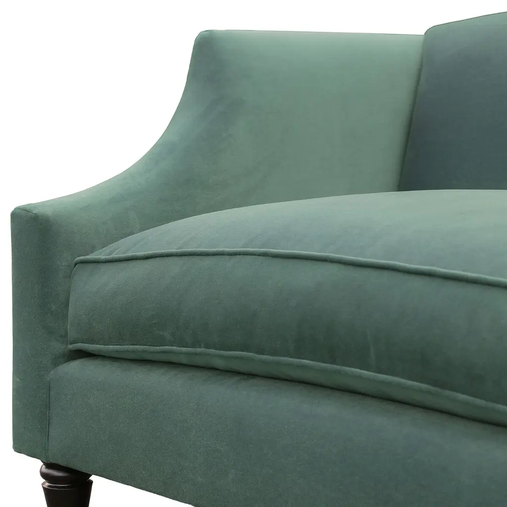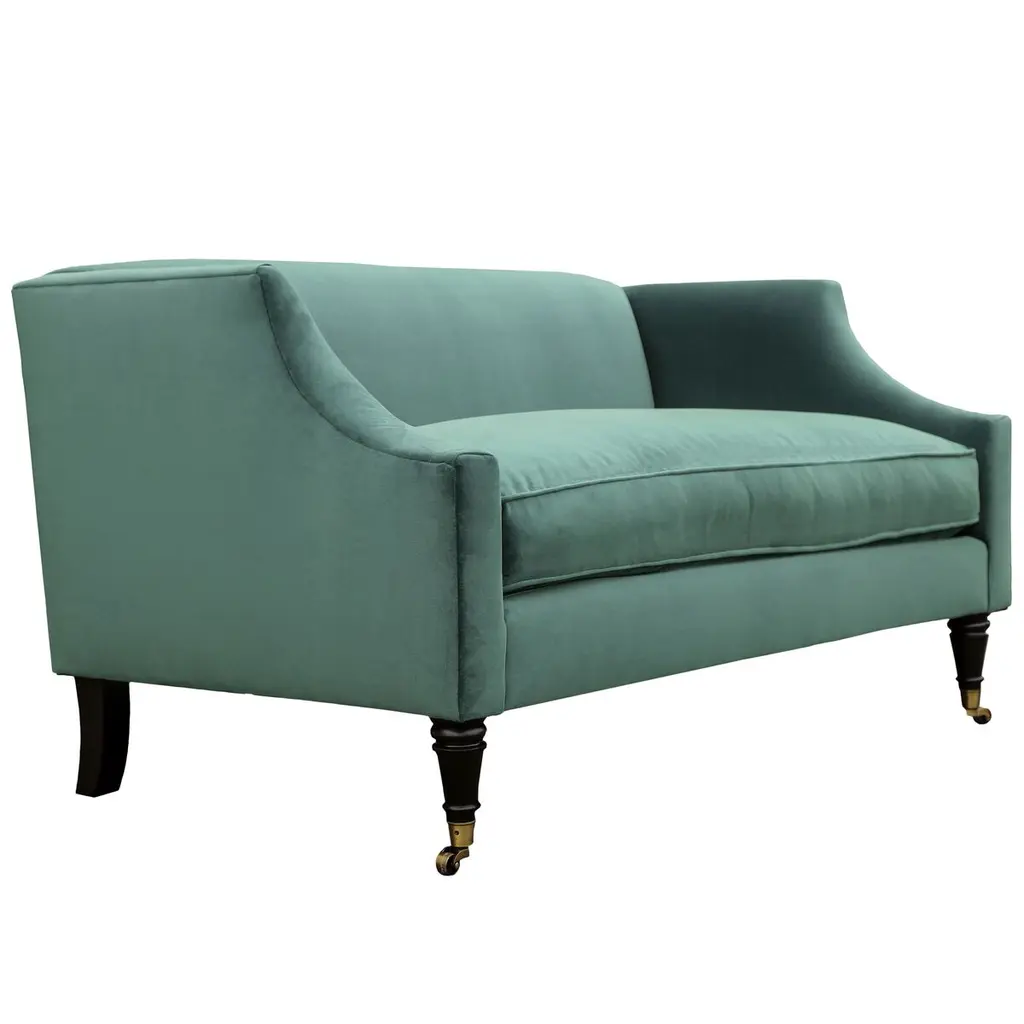 This swoop-arm settee boasts performance velvet upholstery and beautifully turned alder legs. Generous foam-and-fiber padding ensures long-lasting comfort and support, while front caster wheels protect sensitive floors from scratching and marring. Handcrafted in the USA.