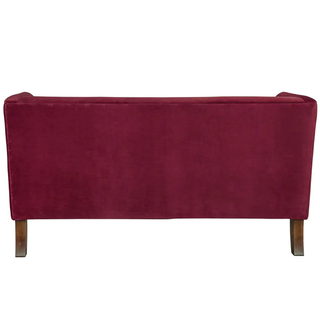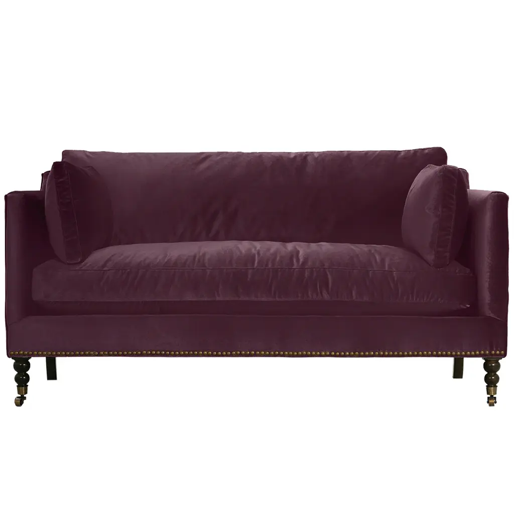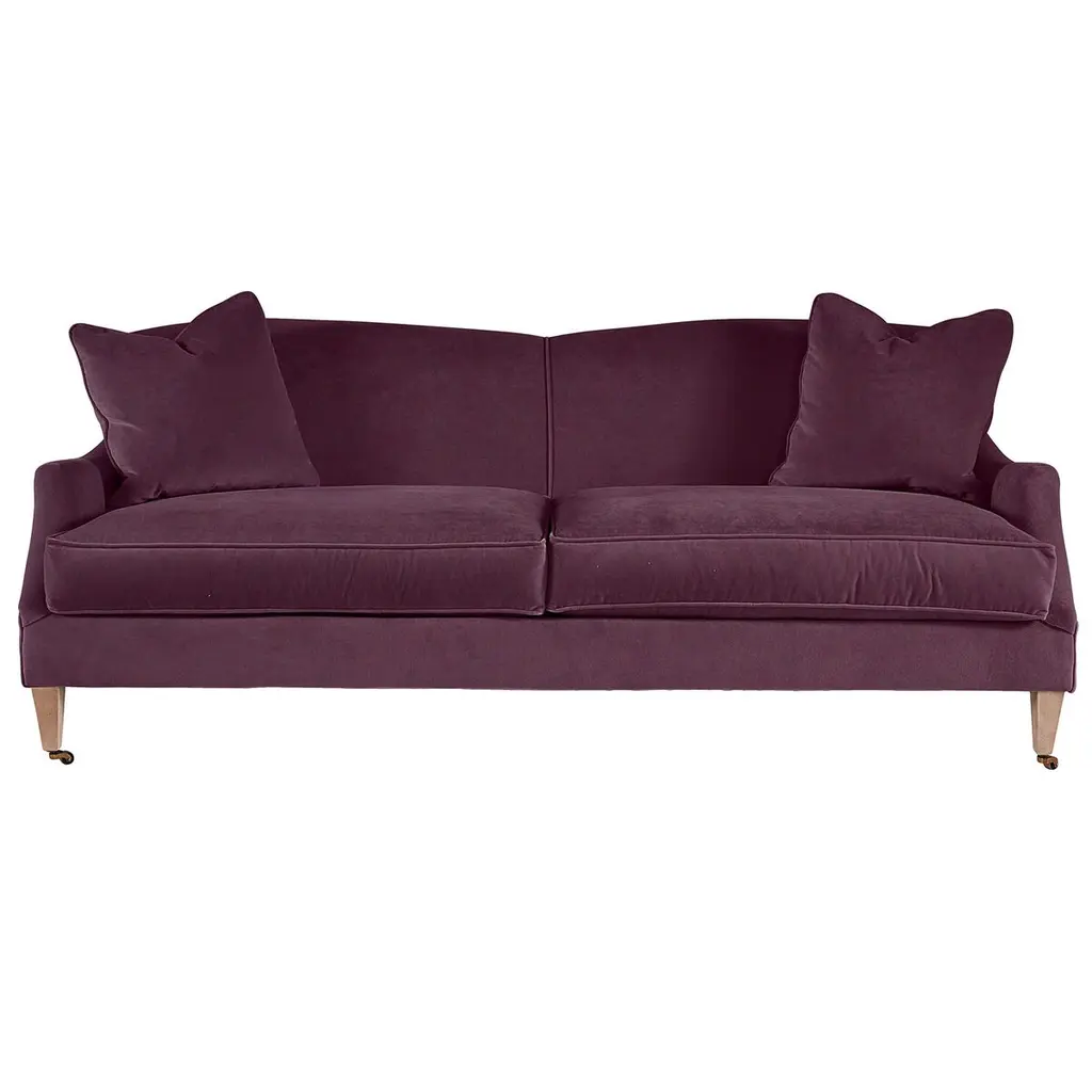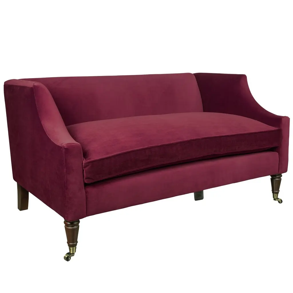 This swoop-arm settee boasts performance velvet upholstery and beautifully turned alder legs. Generous foam-and-fiber padding ensures long-lasting comfort and support, while front caster wheels protect sensitive floors from scratching and marring. Handcrafted in the USA.