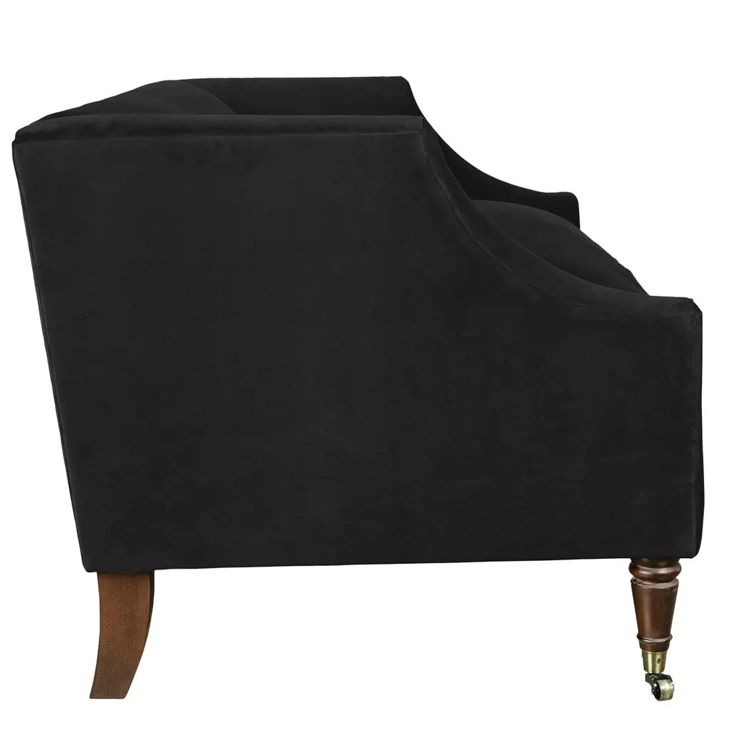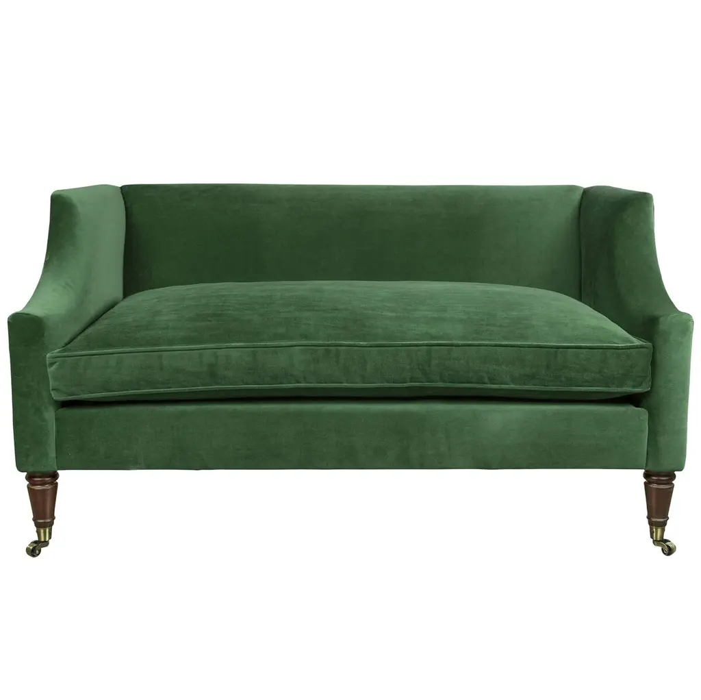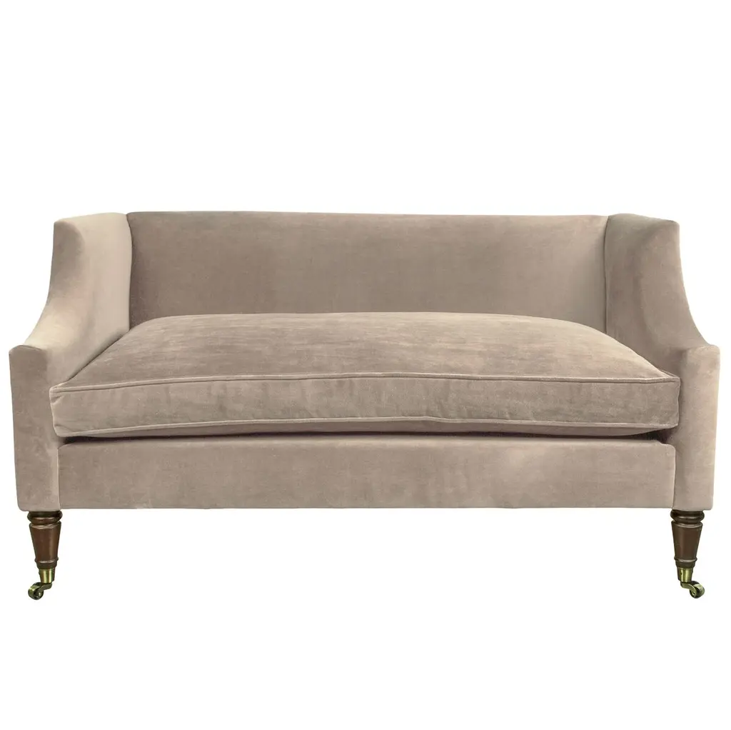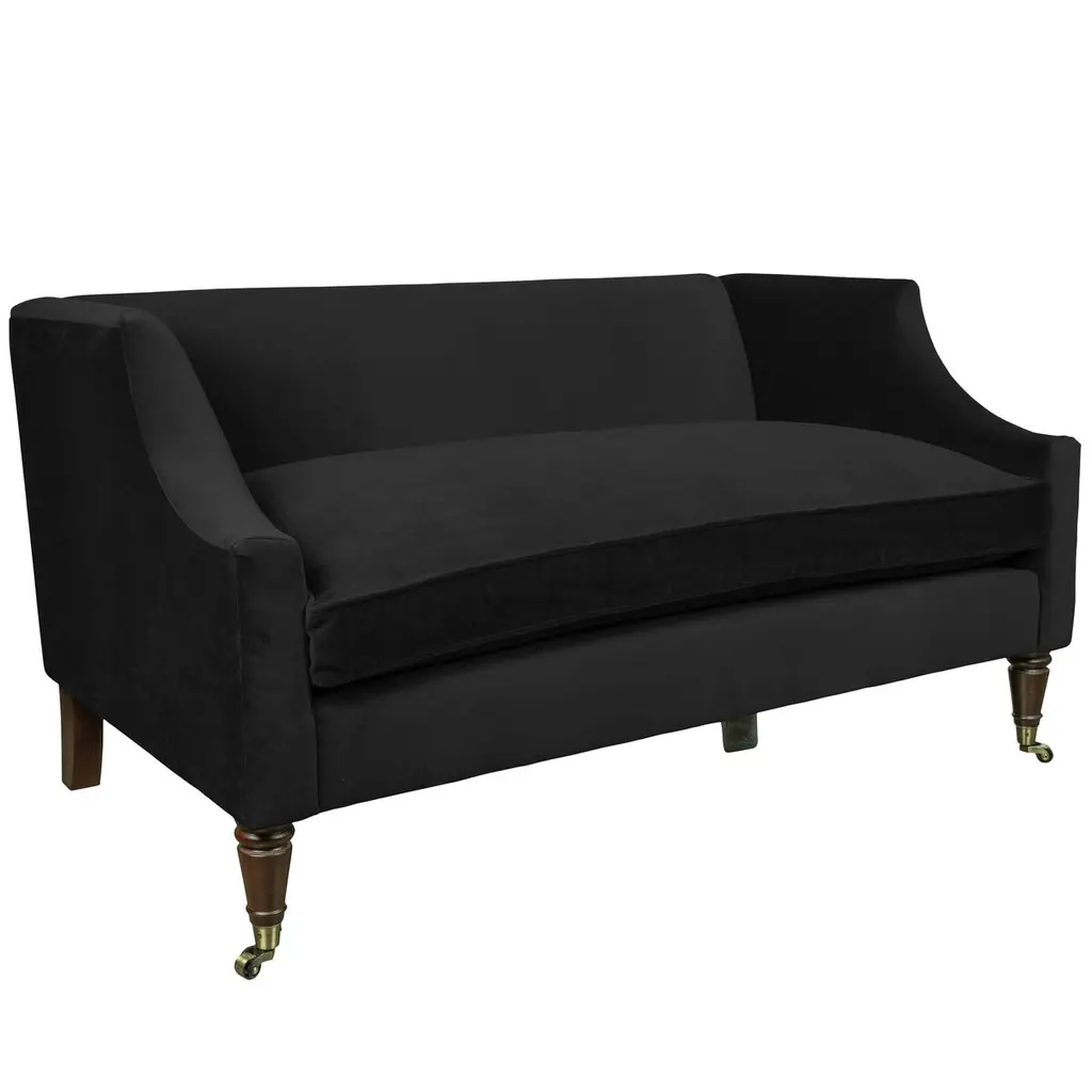 This swoop-arm settee boasts performance velvet upholstery and beautifully turned alder legs. Generous foam-and-fiber padding ensures long-lasting comfort and support, while front caster wheels protect sensitive floors from scratching and marring. Handcrafted in the USA.