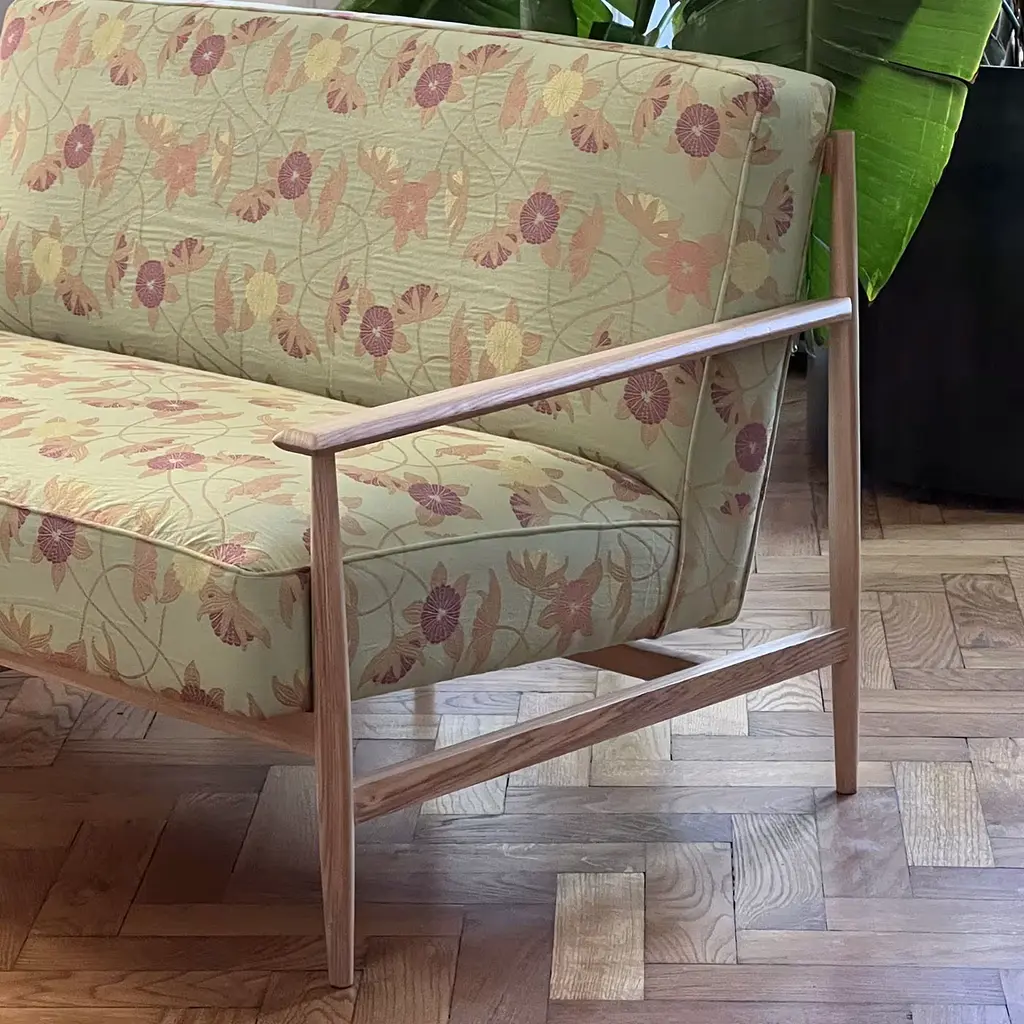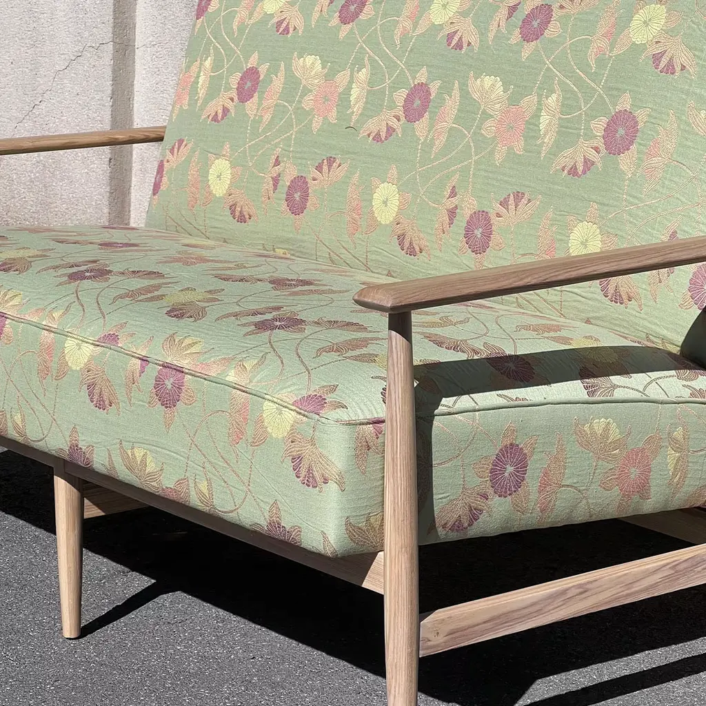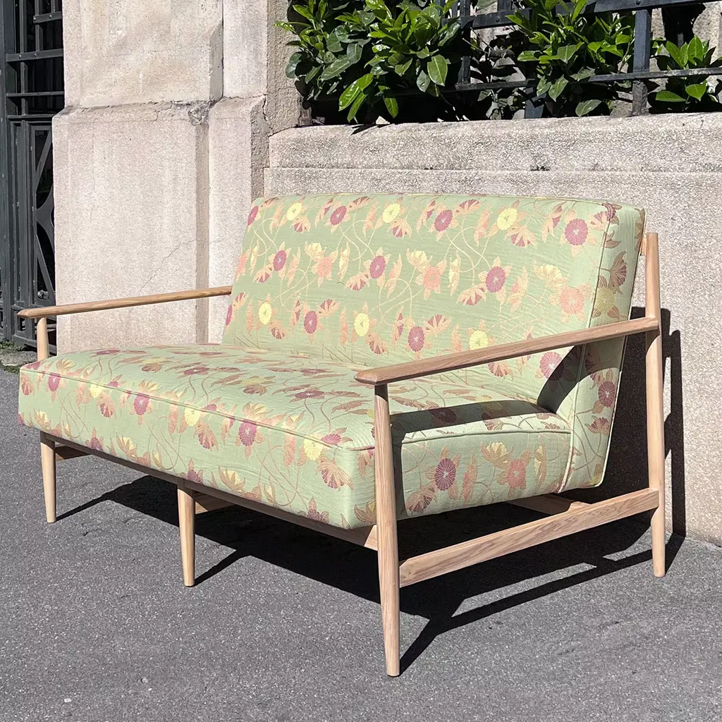 A singular design inspired by 1950s Brazilian style, this loveseat is distinguished by a splendid ash wood structure deftly crafted by Italian craftsmen. Its timeless and elegant shape boasts a softly padded, comfortable seat, supported with elastic straps, and upholstered with linen, also available in velvet or Elmo leather. Please consult the Concierge for customizations and further details.
