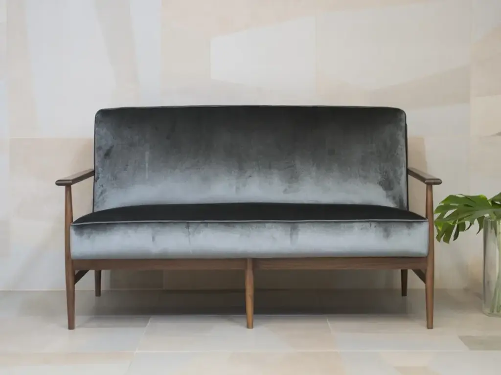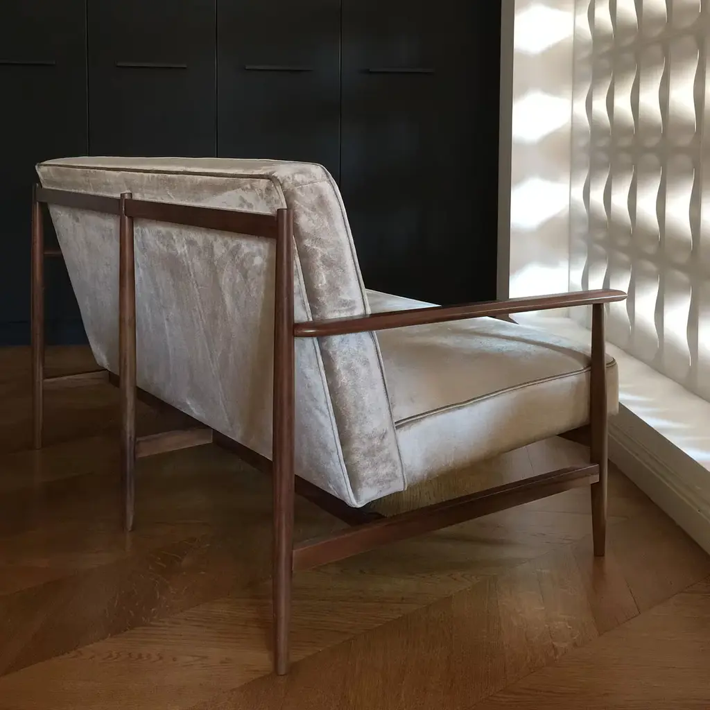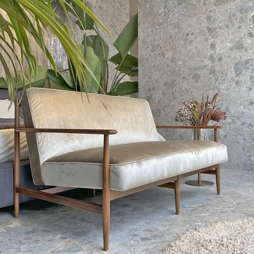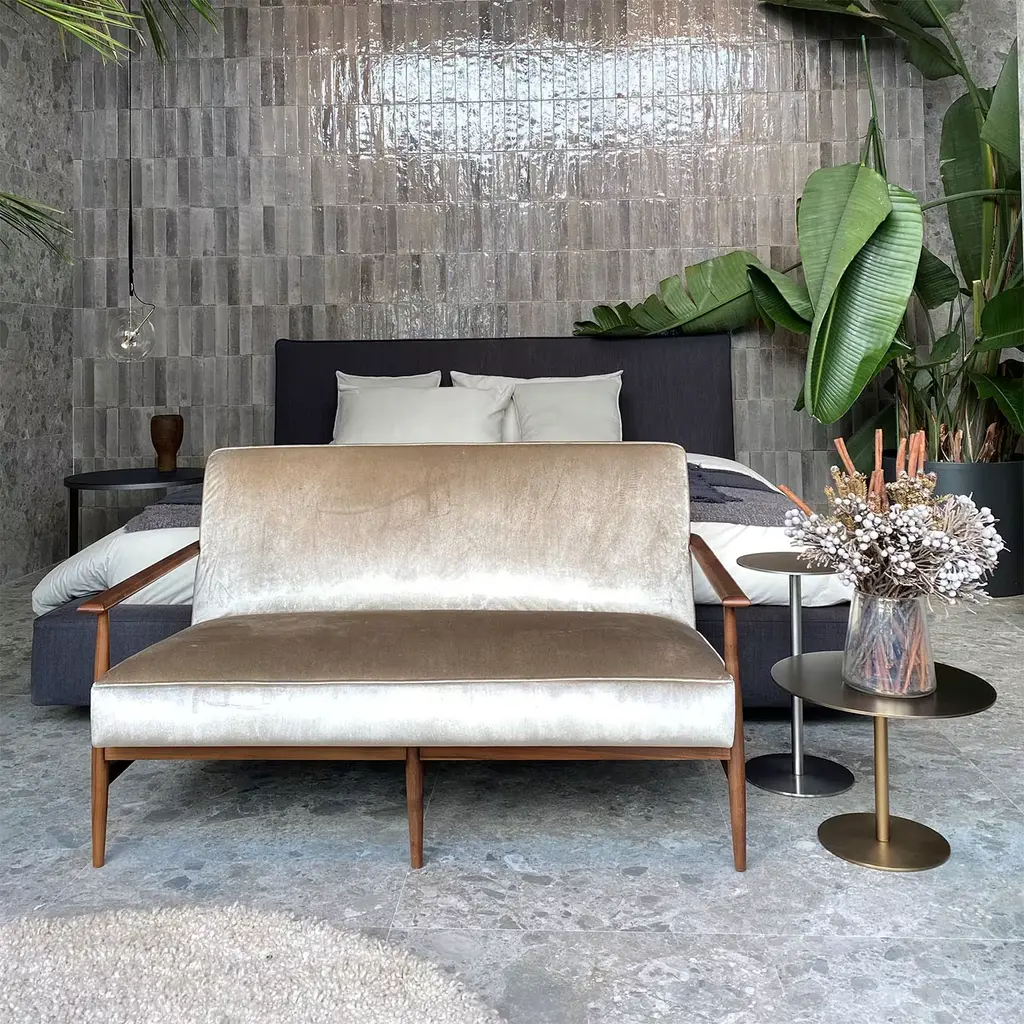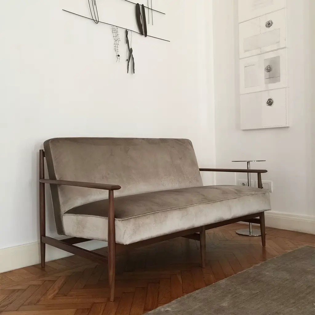 Inspired by 1950s Brazilian design, this splendid loveseat features a unique walnut wood structure deftly crafted by Italian craftsmen. A one-of-a-kind piece with varied wood tones, its timeless and elegant shape boasts a softly padded, comfortable seat, supported with elastic straps, and upholstered with precious beige velvet with a seemingly metallic sheen in the light. Also available in Ashwood or Elmo leather, please consult the Concierge for customizations and further detail