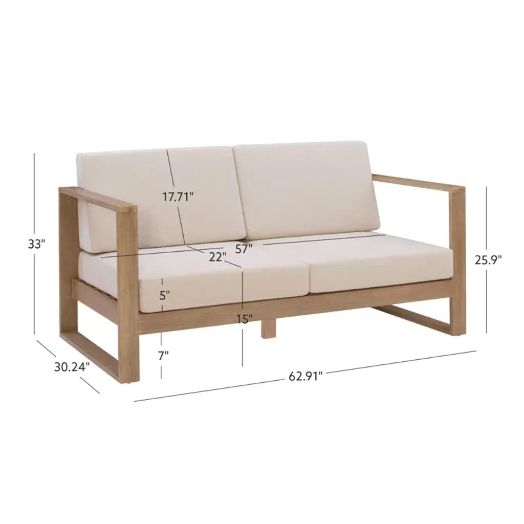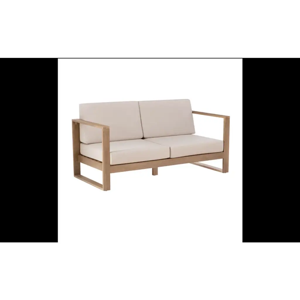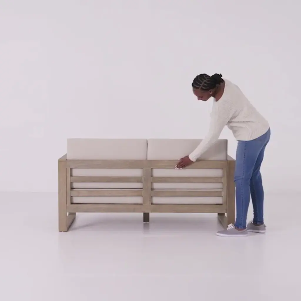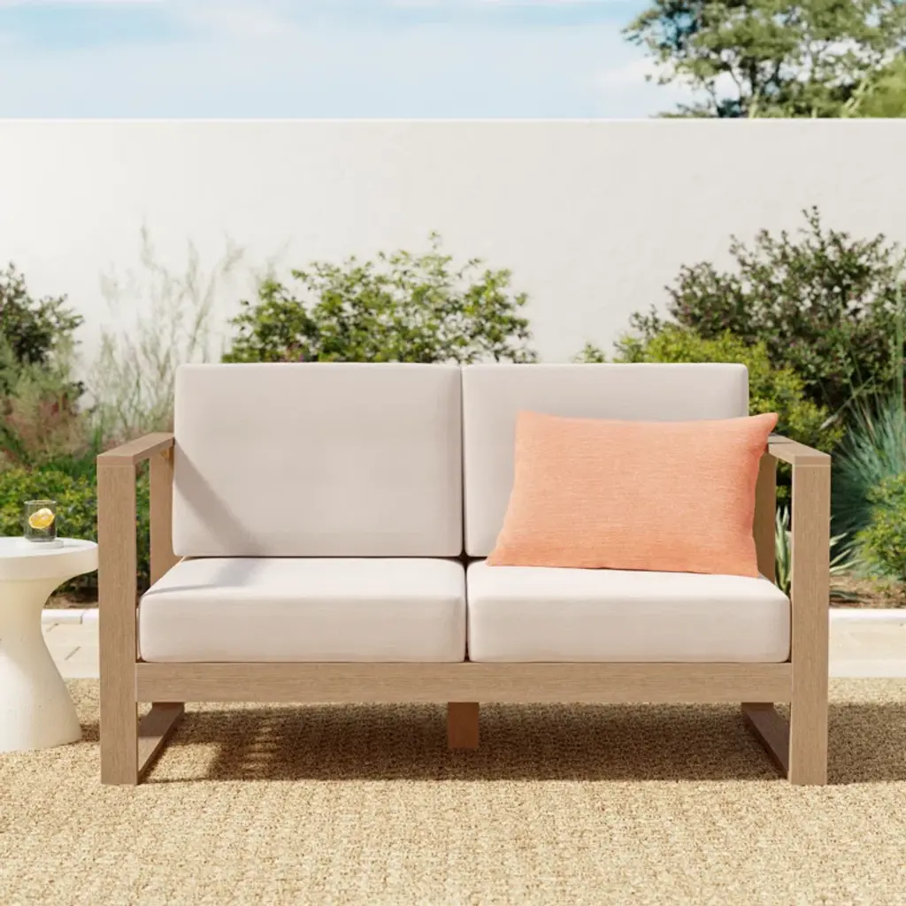 Update your outdoor space with our patio loveseat. It's made from solid eucalyptus wood in a warm finish, and it shows off a clean-lined geometric frame that's both durable and stylish. The squared-off sled legs and slatted back provide lots of support for the olefin-wrapped seat and back cushions, which are UV- and water-resistant. Plus, they stay attached with convenient hook-and-loop fasteners.