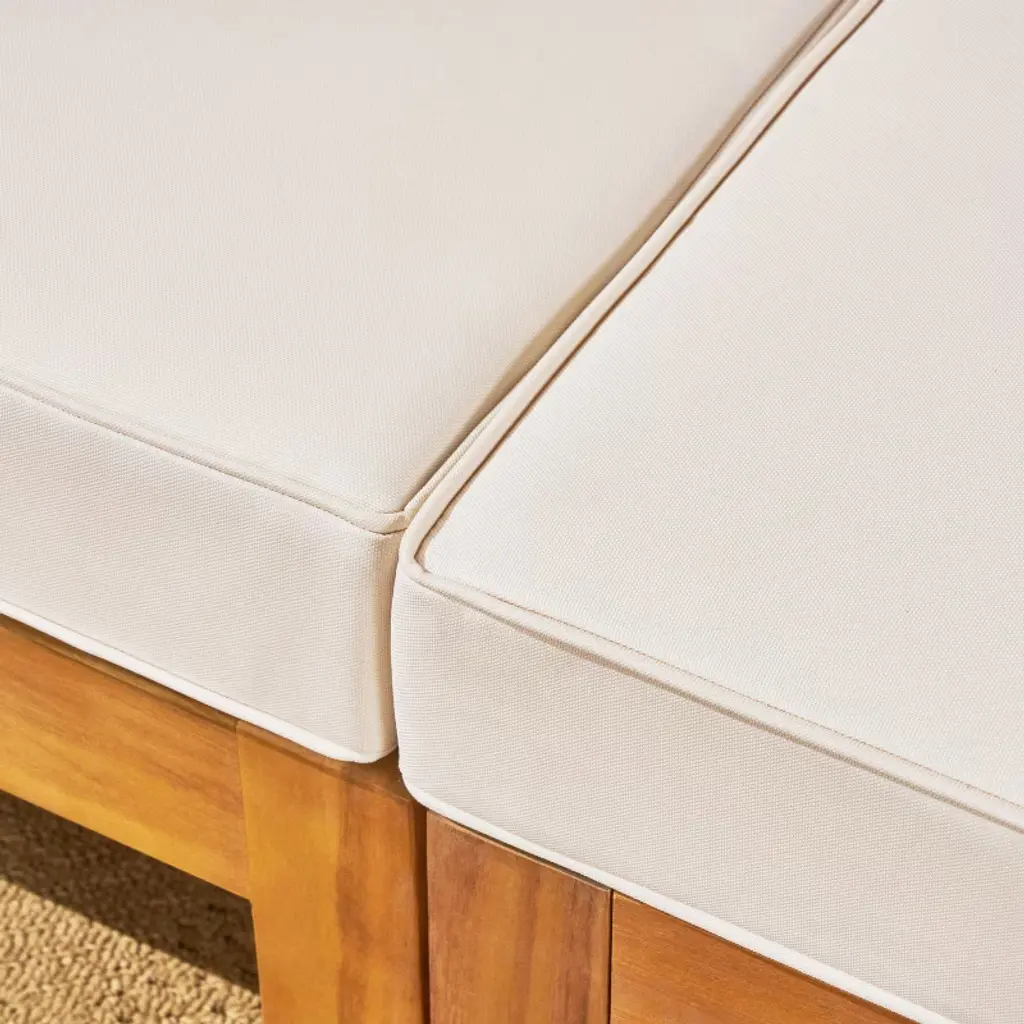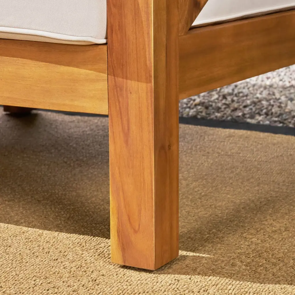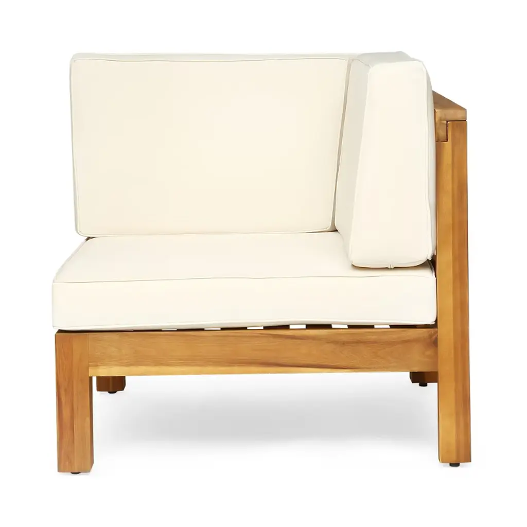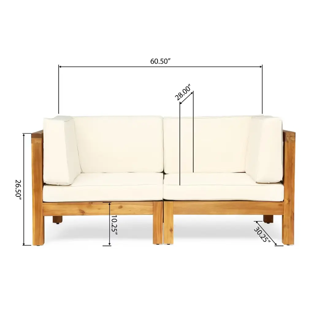 Featuring cross-back acacia wood frames and weather-resistant outdoor cushioning, this modular sectional loveseat will add a luxe, resort-like flair to any outdoor living area it finds itself a part of. Two single-armed components come included, one for the left side and one for the right, forming a seating arrangement comparable to a conventional loveseat when joined at their unarmed ends. The set is completely configurable, able to round out any outdoor living area, whether together, apart, or as an accompaniment to a larger ensemble of sectional outdoor furniture. Frame Material: Acacia Wood Cushion Material: Water Resistant Fabric Multiple Finish Options Multiple Cushion Color Options Assembly Required Right-Side Armchair Dimensions: 30.25 inches deep x 30.25 inches wide x 26.50 inches high Left-Side Armchair Dimensions: 30.25 inches deep x 30.25 inches wide x 26.50 inches high