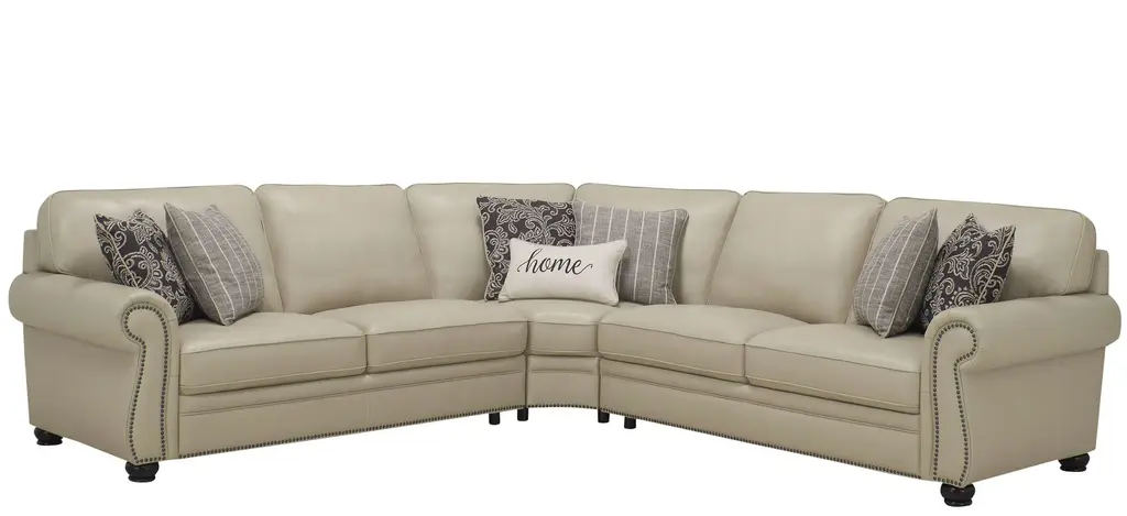 Easygoing yet elegant, the Gilmore makes a grand statement that's timelessly tasteful. Versatile bone leather and a classic silhouette are embellished with touches of exceptional character like gunmetal nail heads on the rolled arm panels and turned bun feet with antiqued ebony finish. Paired with texture and neutral finishes or pops of seasonal color, this sectional is an exceptional showpiece for a modern farmhouse aesthetic.