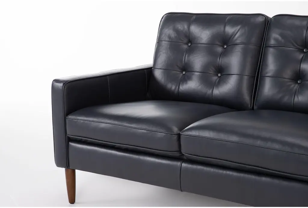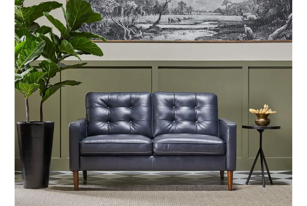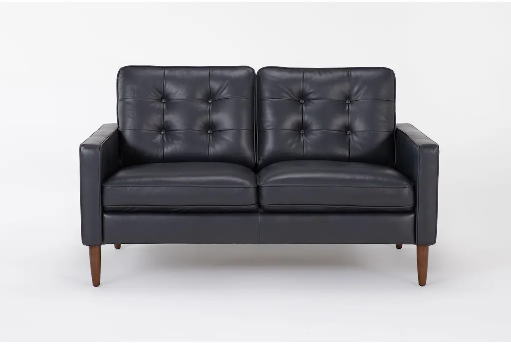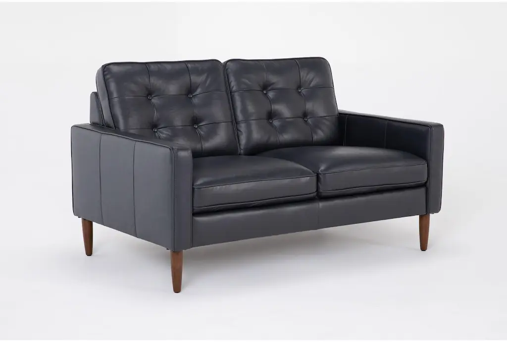 Get a high-end look for less with our Grayson leather collection, which exudes modern sophistication while providing irresistible comfort. Luxurious leather seating sets the stage for five-star lounging, and elevated style details add a sense of finesse. You’ll adore the button tufted backs, cone-shaped legs and thin track arms that bring mid-century flair, plus a deep navy blue/grey hue that enriches each piece. Designed for small space living, these are perfectly scaled for apartments and condos.