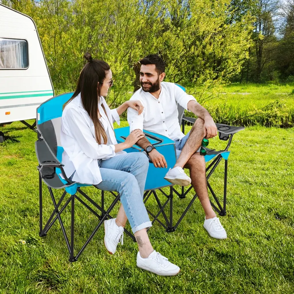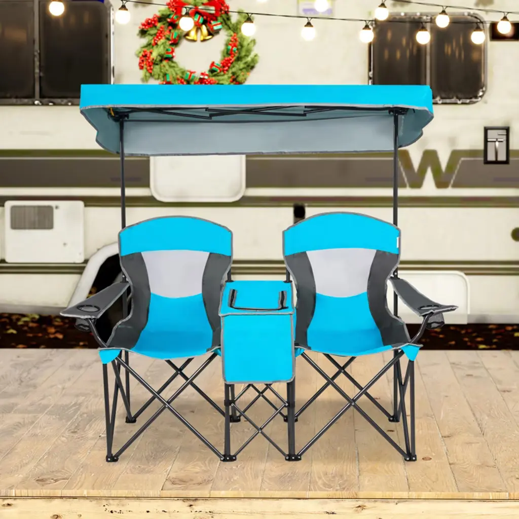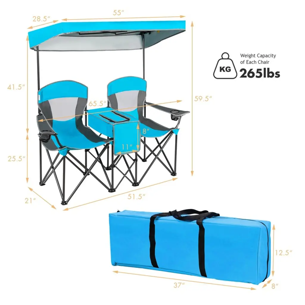 Perfect Loveseat for Outdoor Relaxation with Your Loved One! Our outdoor camping loveseat is designed with 2 seats and each chair can load up to 265 lbs, which is great for enjoying outdoor happy times with your family or friends. Unlike normal camping chairs, our double folding camping chairs feature a detachable canopy with silver coatings inside, which can effectively block harmful sunlight and allow you to enjoy cool shades, and the angle of the canopy can be adjusted within 170 degree. It can also be detached when not in use. Moreover, the supporting frame is made of heavy duty powder coated steel pipes, which are rustproof, sturdy, and durable, ensuring long service life. And the seat is made of premium 600D oxford fabric, which has great weather resistance while providing a comfortable sitting experience. Other than that, there exists a cooler bag in the middle table, providing enough storage space while keeping drinks and food cool even on hot days. This portable outdoor camping chairs can be folded and stored in a carrying bag, so you can easily store the chair in the car trunk and take it for camping, party, picnic, or other outdoor events.FeaturesThe high-strength powder coated steel frame is anti-rust, sturdy, and durable The 8 supporting structure ensures strong stability and large bearing capacity The large footpads protect the chair from slipping or sinking into the soft ground The canopy is made of 210T silver coated fabric, providing great sun protection The canopy can be adjusted within 170 degree, blocking the sun from different angles The canopy can be easily detached by loosening fixing buckles The ergonomic seat provides comfortable support for your waist and spine The cooler bag in the middle can keep food and drinks cool for a long time The side pocket in the mini table allows you to store small items at hands 2 cup holders on the armrests bring convenience for placing drinks Can be easily and quickly folded into a compact size, easy to store The portable carrying bag is easy to store and transportColor: Turquoise/Red/Blue Material: 600D Oxford Fabric, 210T Polyester Fabric, Steel Product Dimensions: 55" x 28.5" x 59.5" (L x W x H) Storage Bag Dimensions: 37" x 12.5" x 8"(L x W x H) Weight Capacity of Each Chair: 265lbs Net Weight: 26.5lbs Package includes: 1 x Folding Loveseat Chair 1 x Carrying Bag 1 x User Guide