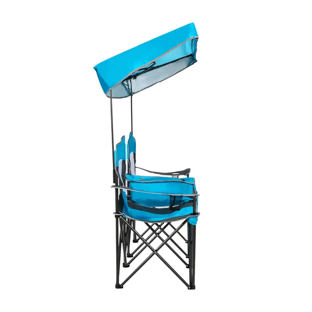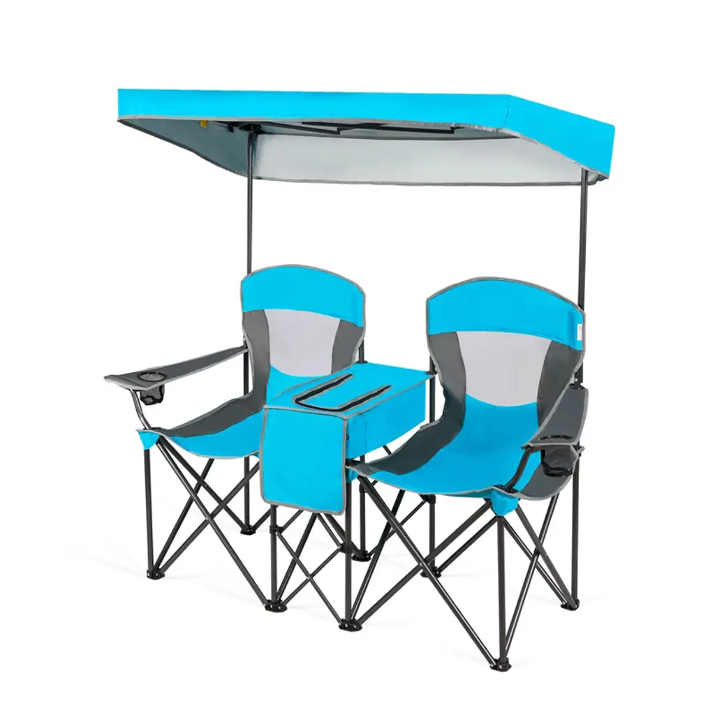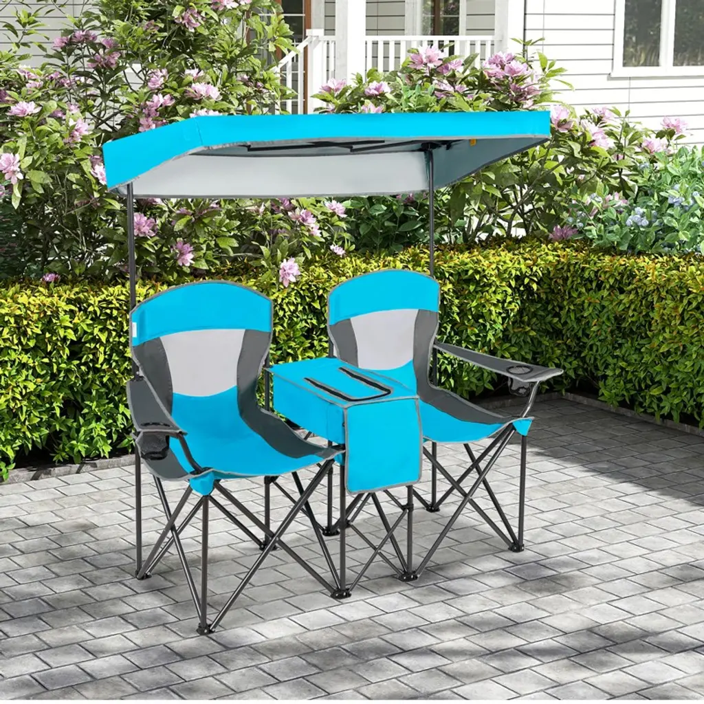 Perfect Loveseat for Outdoor Relaxation with Your Loved One! Our outdoor camping loveseat is designed with 2 seats and each chair can load up to 265 lbs, which is great for enjoying outdoor happy times with your family or friends. Unlike normal camping chairs, our double folding camping chairs feature a detachable canopy with silver coatings inside, which can effectively block harmful sunlight and allow you to enjoy cool shades, and the angle of the canopy can be adjusted within 170 degree. It can also be detached when not in use. Moreover, the supporting frame is made of heavy duty powder coated steel pipes, which are rustproof, sturdy, and durable, ensuring long service life. And the seat is made of premium 600D oxford fabric, which has great weather resistance while providing a comfortable sitting experience. Other than that, there exists a cooler bag in the middle table, providing enough storage space while keeping drinks and food cool even on hot days. This portable outdoor camping chairs can be folded and stored in a carrying bag, so you can easily store the chair in the car trunk and take it for camping, party, picnic, or other outdoor events.FeaturesThe high-strength powder coated steel frame is anti-rust, sturdy, and durable The 8 supporting structure ensures strong stability and large bearing capacity The large footpads protect the chair from slipping or sinking into the soft ground The canopy is made of 210T silver coated fabric, providing great sun protection The canopy can be adjusted within 170 degree, blocking the sun from different angles The canopy can be easily detached by loosening fixing buckles The ergonomic seat provides comfortable support for your waist and spine The cooler bag in the middle can keep food and drinks cool for a long time The side pocket in the mini table allows you to store small items at hands 2 cup holders on the armrests bring convenience for placing drinks Can be easily and quickly folded into a compact size, easy to store The portable carrying bag is easy to store and transportColor: Turquoise/Red/Blue Material: 600D Oxford Fabric, 210T Polyester Fabric, Steel Product Dimensions: 55" x 28.5" x 59.5" (L x W x H) Storage Bag Dimensions: 37" x 12.5" x 8"(L x W x H) Weight Capacity of Each Chair: 265lbs Net Weight: 26.5lbs Package includes: 1 x Folding Loveseat Chair 1 x Carrying Bag 1 x User Guide