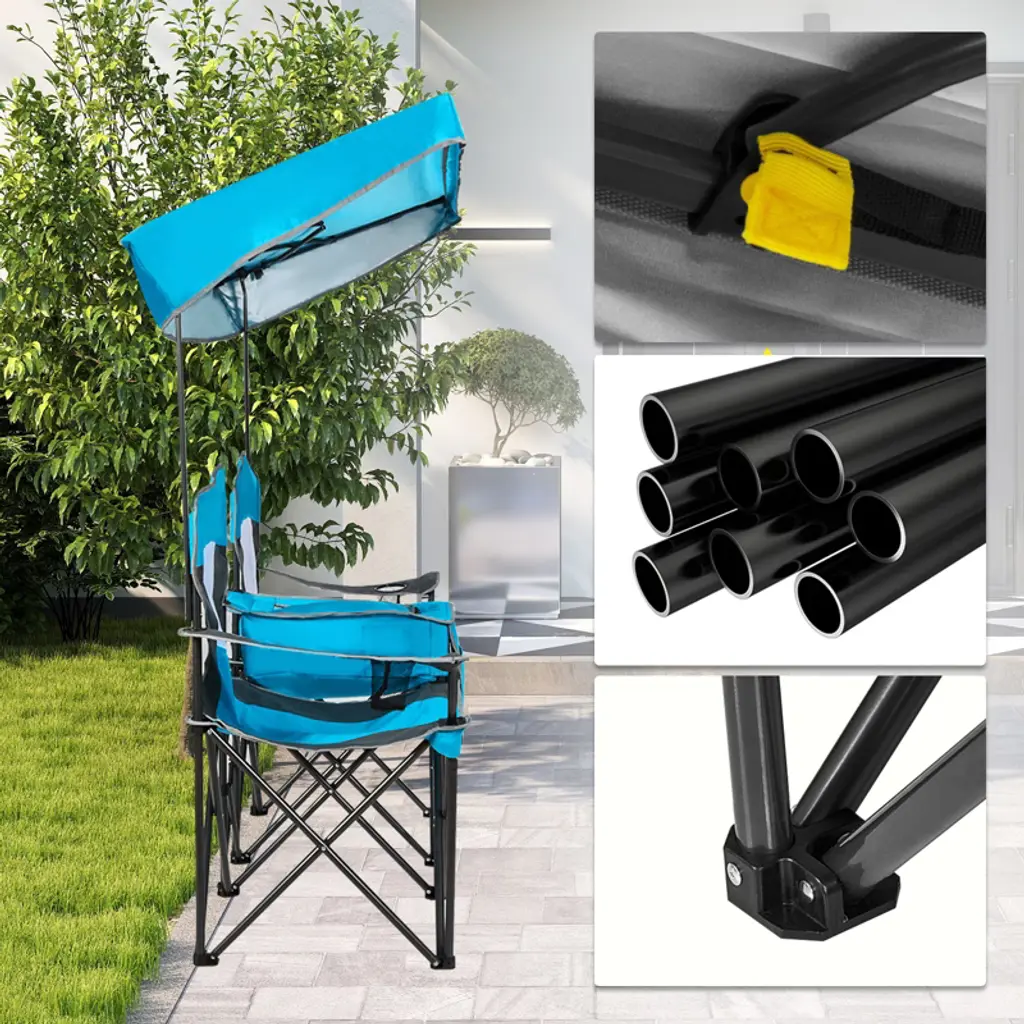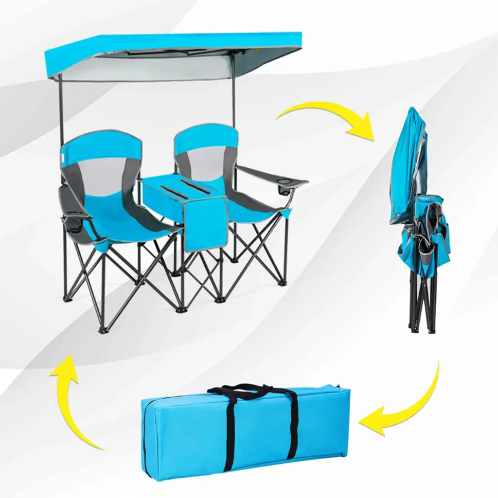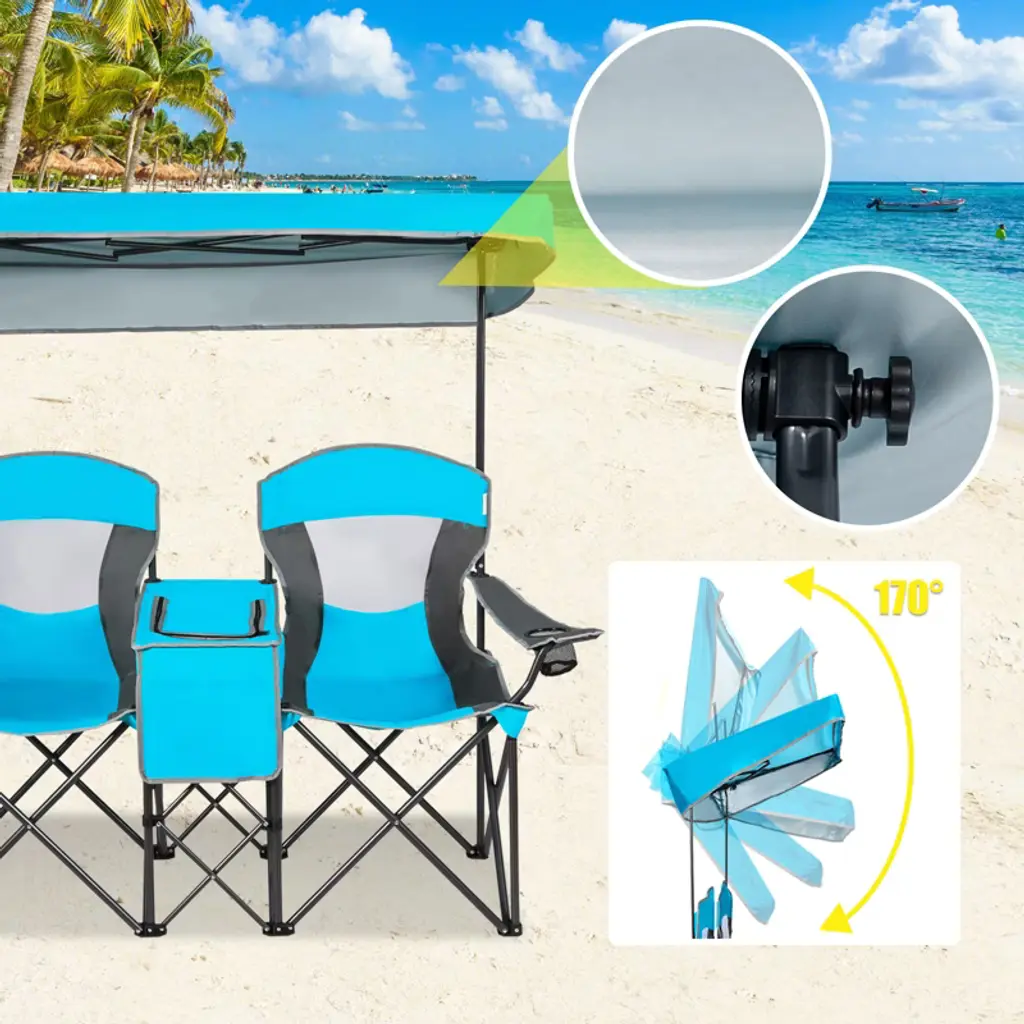 Gymax Double Folding Camping Chairs W/ Carrying Bag Outdoor 2-seat Picnic Chair W/ Adjustable & Detachable Canopy Portable & Foldable Loveseat Blue
