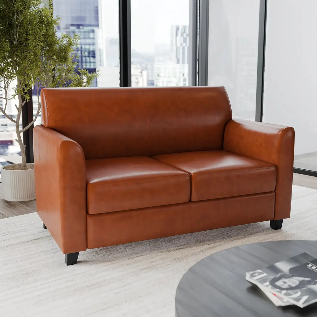 Your lobby or reception area is the forefront of your business and provides that ever important first impression. Providing distinguished and comfortable seating lets your clients know that you value their business. The modern appeal of this soft and durable LeatherSoft upholstered collection will make a lasting impression. Not only does this loveseat feature comfortable cushions, flared arms and raised feet, the hardwood construction frame will give you many years of use. The raised block feet look great and make it easier to clean the flooring beneath. This reception loveseat is perfect for the office as well as waiting room seating. The contemporary design of this furniture adapts in several different settings. This upholstered loveseat will not only fit in a professional environment, but will add a modern look to your home.
