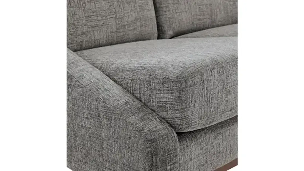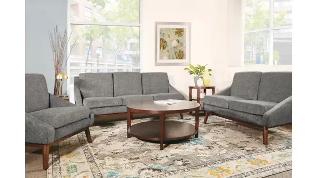 Mid Century modern looking furniture with solid wood legs stained to a coffe finish. Available in two fabric colors. Ships assembled simply screw the legs in on arrival.