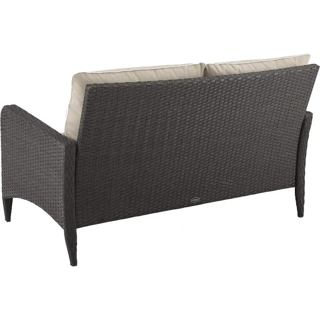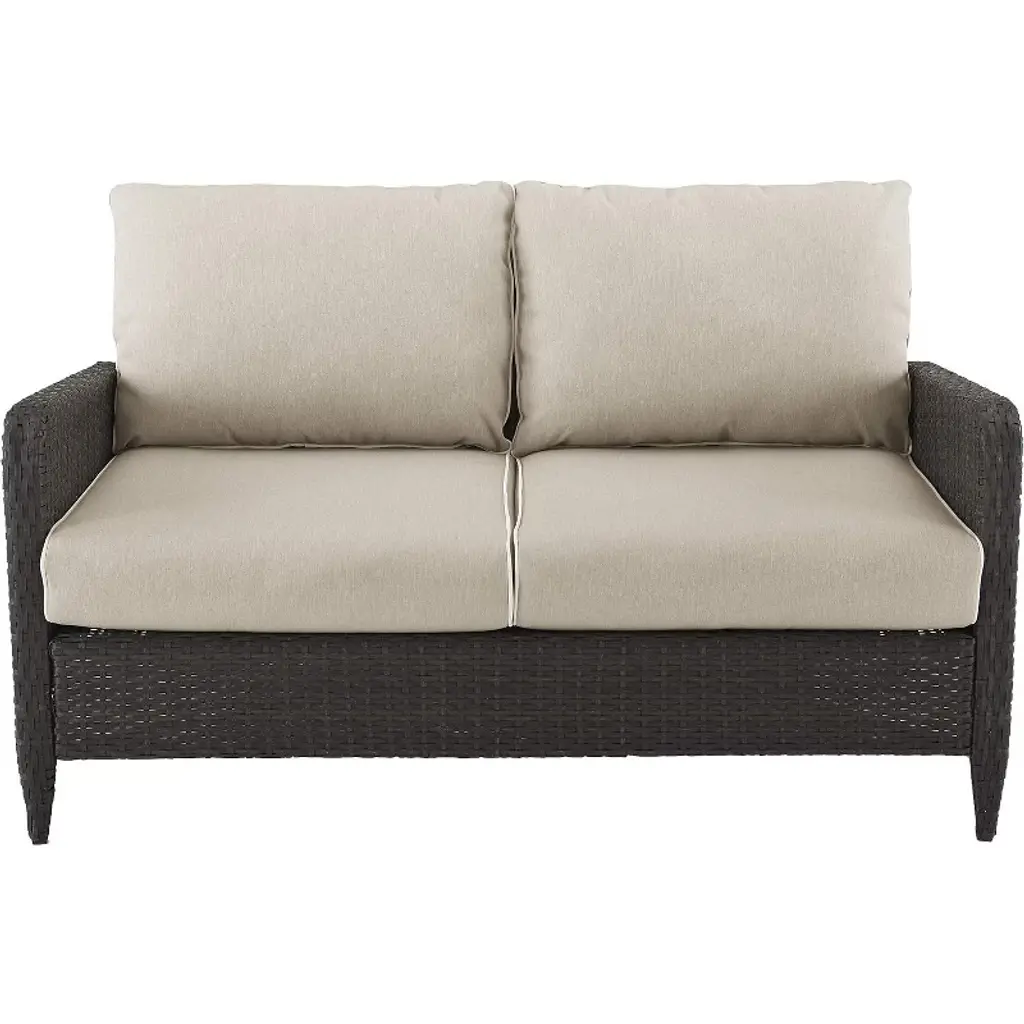 Kick back and relax in the comfort of the Kiawah Outdoor Loveseat. Enjoy the deep seating and plush weather-resistant piped cushions, plus all-weather resin wicker elegantly woven over durable powder-coated steel. On its own or paired with other outdoor seating, this two-seat outdoor sofa is a fantastic addition to your patio or deck.