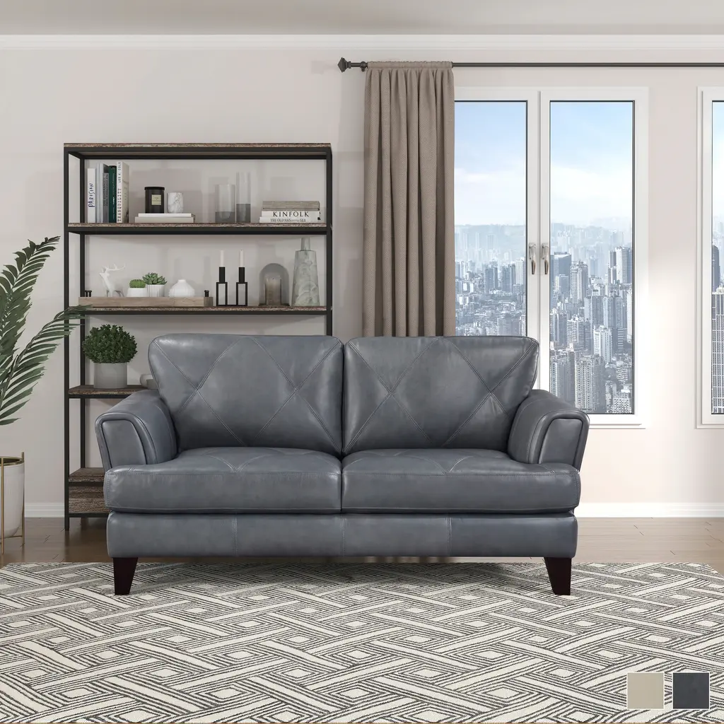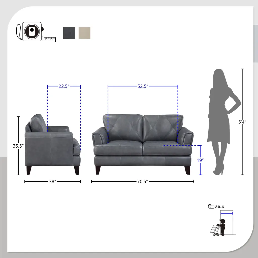 || Fremont & Park - Howe Collection ||With subtle inspiration from modern European design, the contemporary style of the Howe Collection pairs understated elegance with defining lines resulting in a sophisticated look for your living room. The burnish gray and cream hue of the love seat’s top grain leather covering – with split-grain leather match – is a neutral decorative selection for your space. Geometric stitching accents the seats of the love seat, while the flare of the track arm completes the modern profile.HighlightsAbout CushionsProduct DimensionExplore Howe CollectionCare InstructionBuyer disclaimer