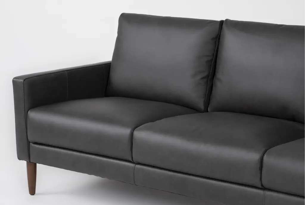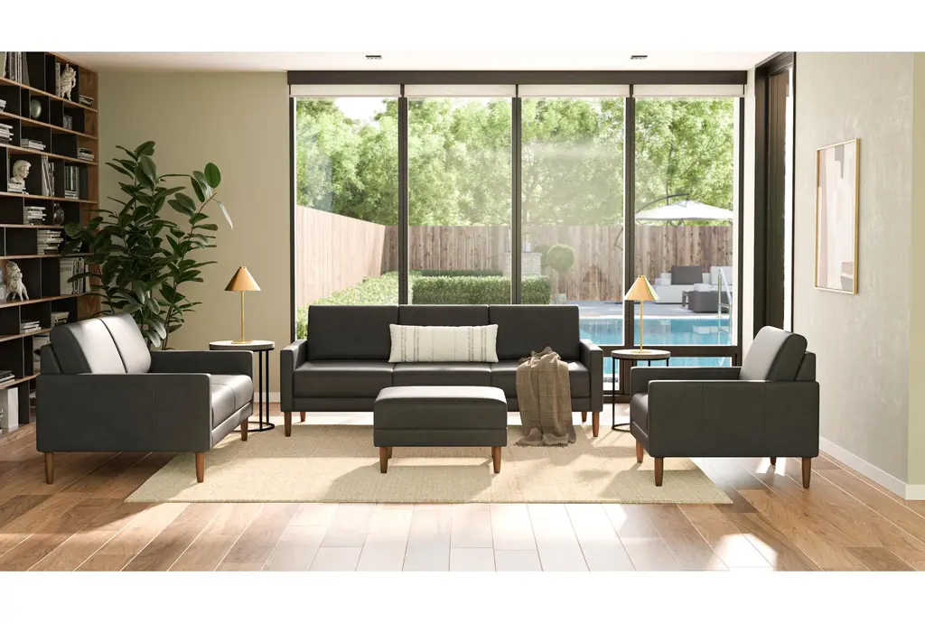 Introducing the Ian Grey Leather 4 Piece Sofa Loveseat Chair & Rectangle Ottoman Set, a stunning addition to any living room. This modern set in Volcano Grey offers both style and comfort, making it perfect for entertaining or relaxing at home.