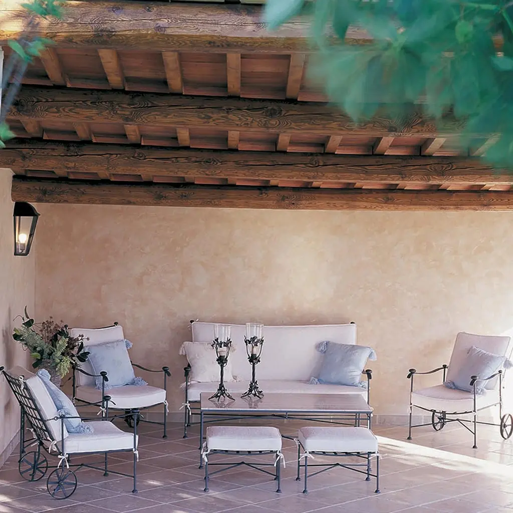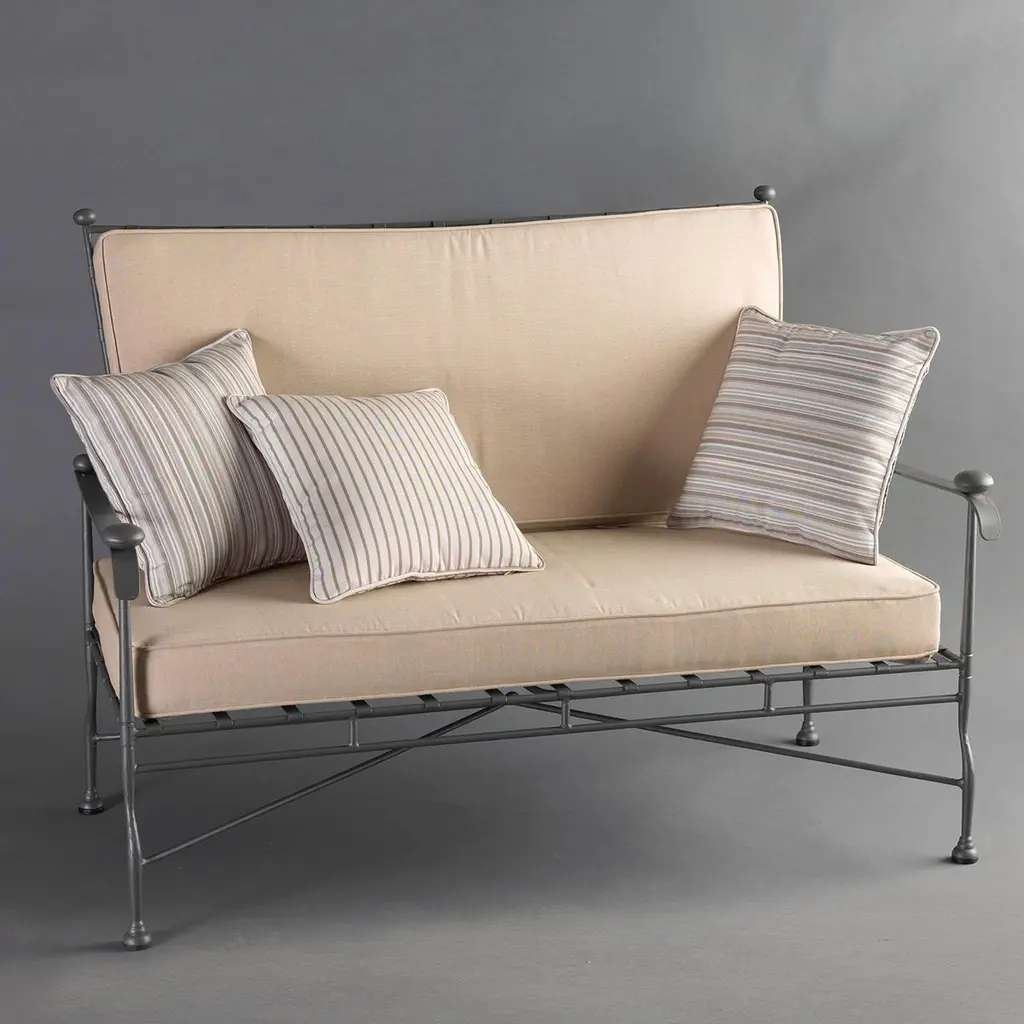 A superb addition to a patio, pool area, or terrace, this two-seat sofa is the result of masterful metalworking skills. Entirely made of stainless steel, this lovely piece evokes the relaxing charm and timeless elegance of the Tuscan countryside. Its elements create a harmonious design, whose highlight is the pattern of open squares that graces seat and back. The metal is treated with zinc and varnished with powder for outdoor use while its cushions are upholstered with weather-resistant fabric, making this chair the perfect outdoor accent piece.