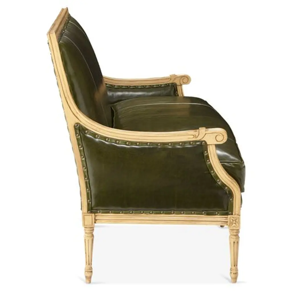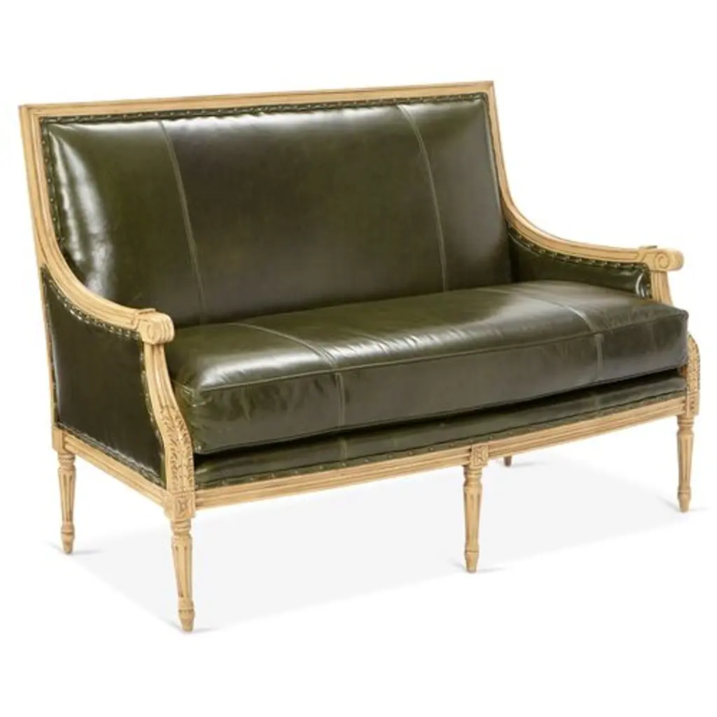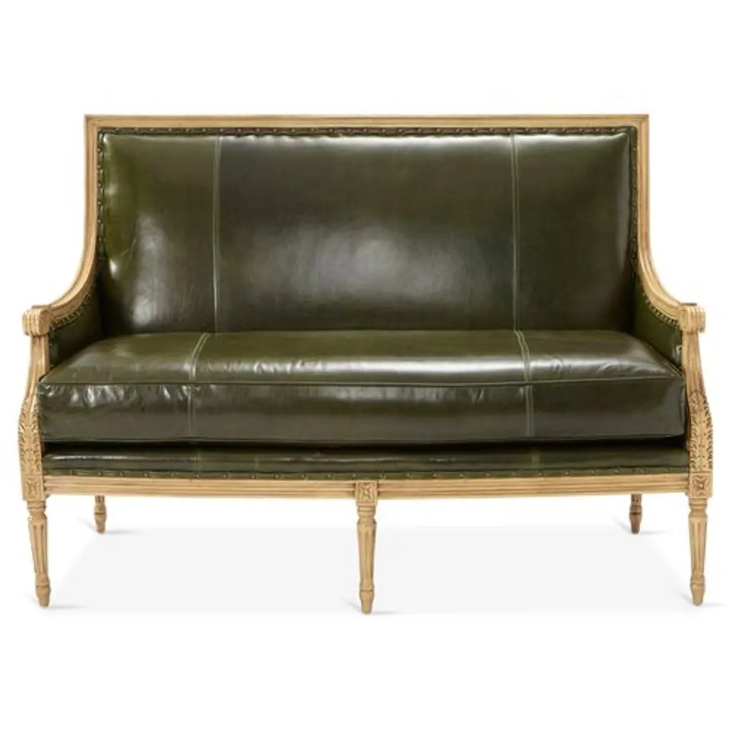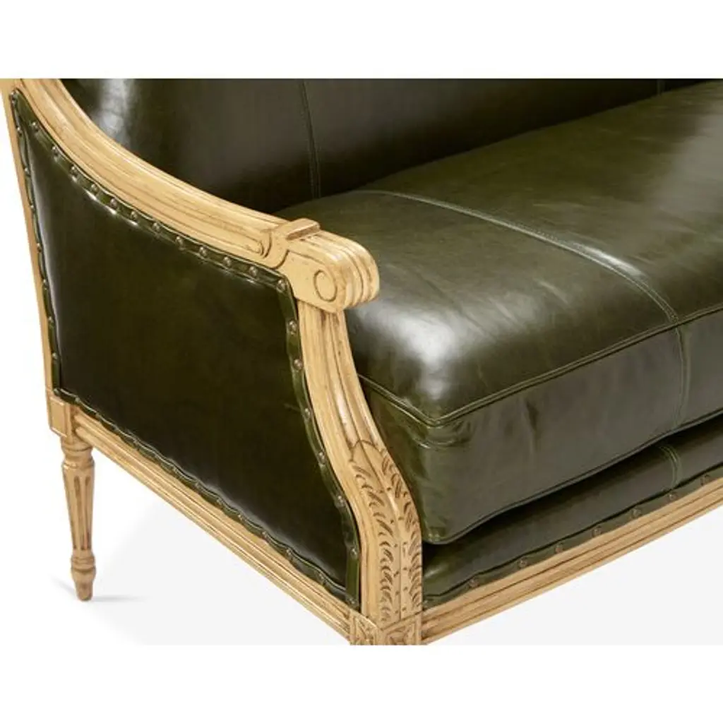 Designed by us and available only at One Kings Lane: This French-inspired settee features a masterfully carved Italian beech frame with sloping arms and graceful detailing. The piece is upholstered on both sides in rich evergreen leather and trimmed with gleaming nailheads. A generous seat fill of down-wrapped foam with a cotton duck core ensures lasting comfort and support. Made in the USA.