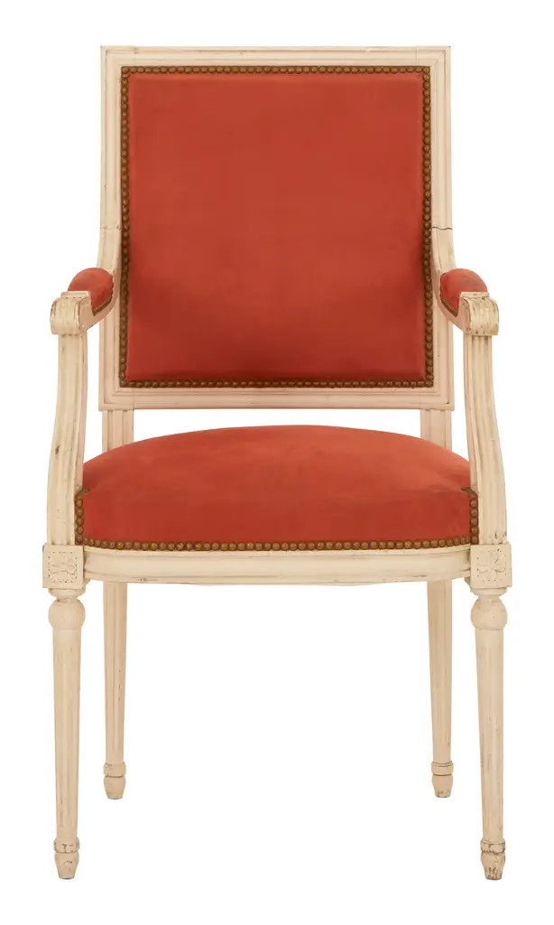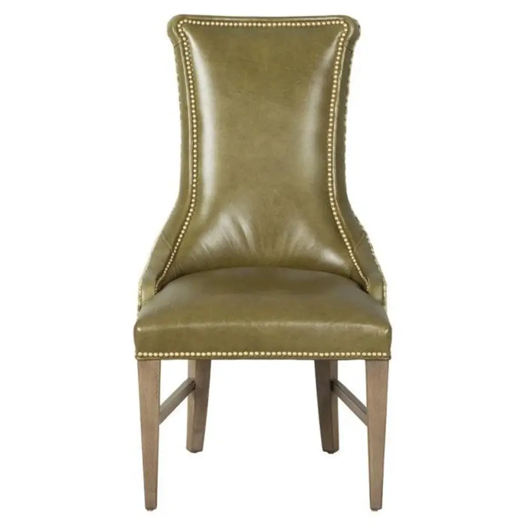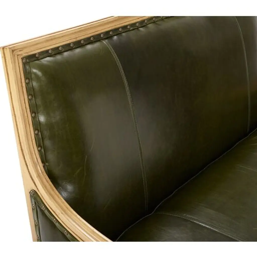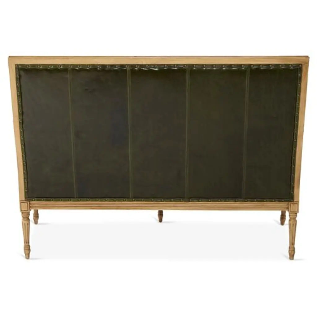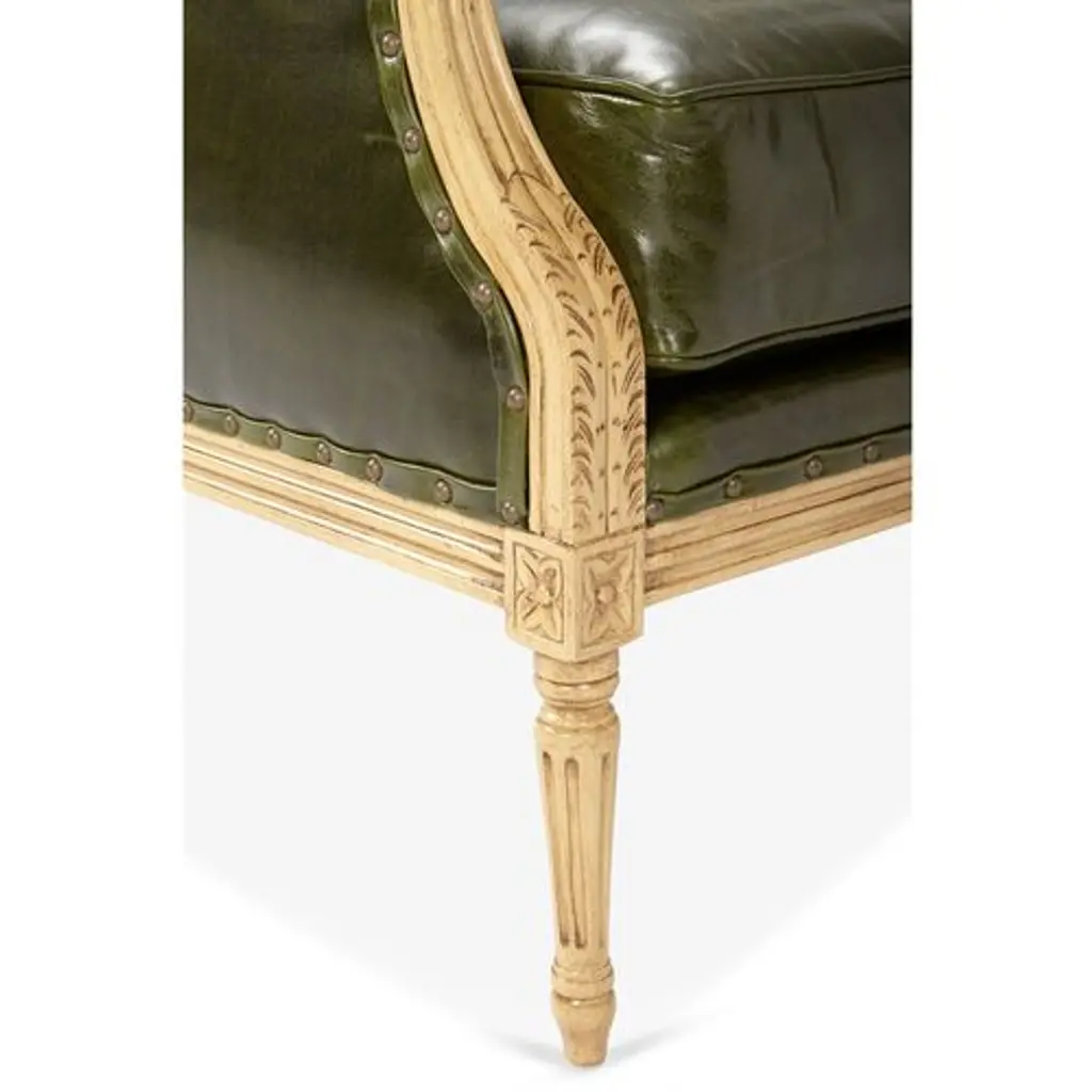 Designed by us and available only at One Kings Lane: This French-inspired settee features a masterfully carved Italian beech frame with sloping arms and graceful detailing. The piece is upholstered on both sides in rich evergreen leather and trimmed with gleaming nailheads. A generous seat fill of down-wrapped foam with a cotton duck core ensures lasting comfort and support. Made in the USA.