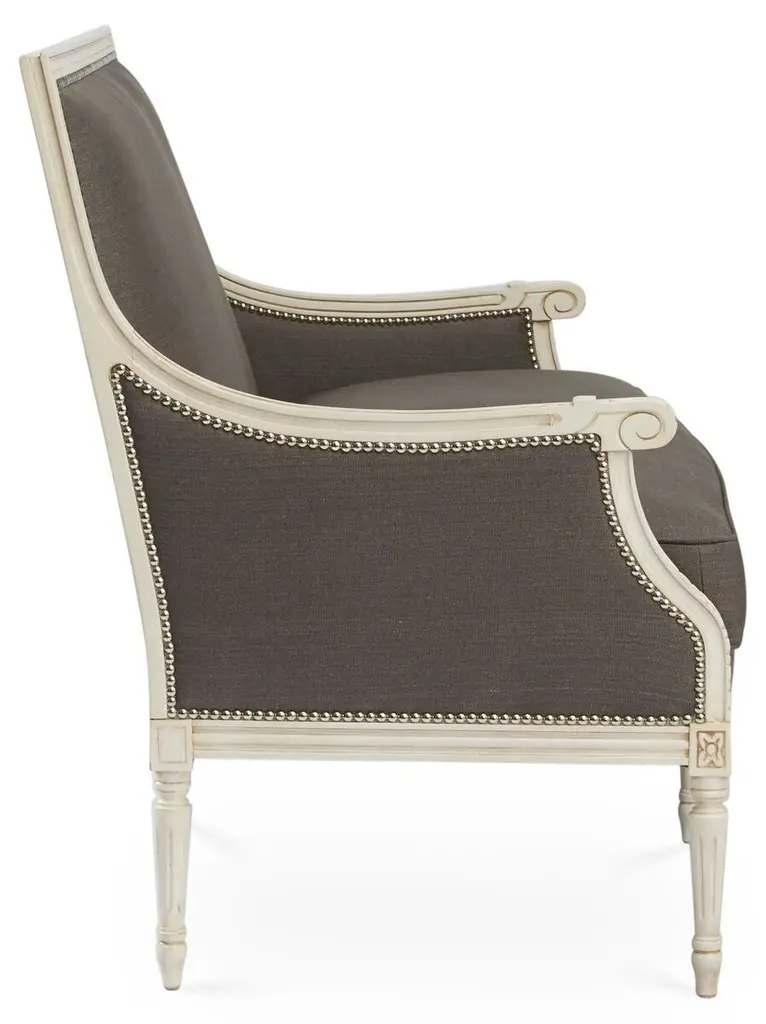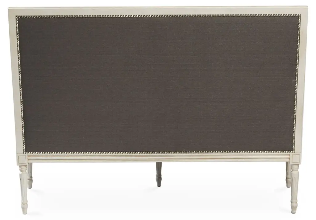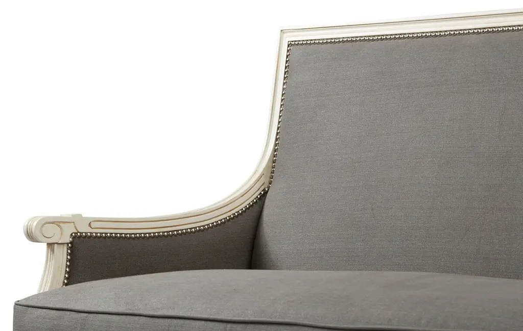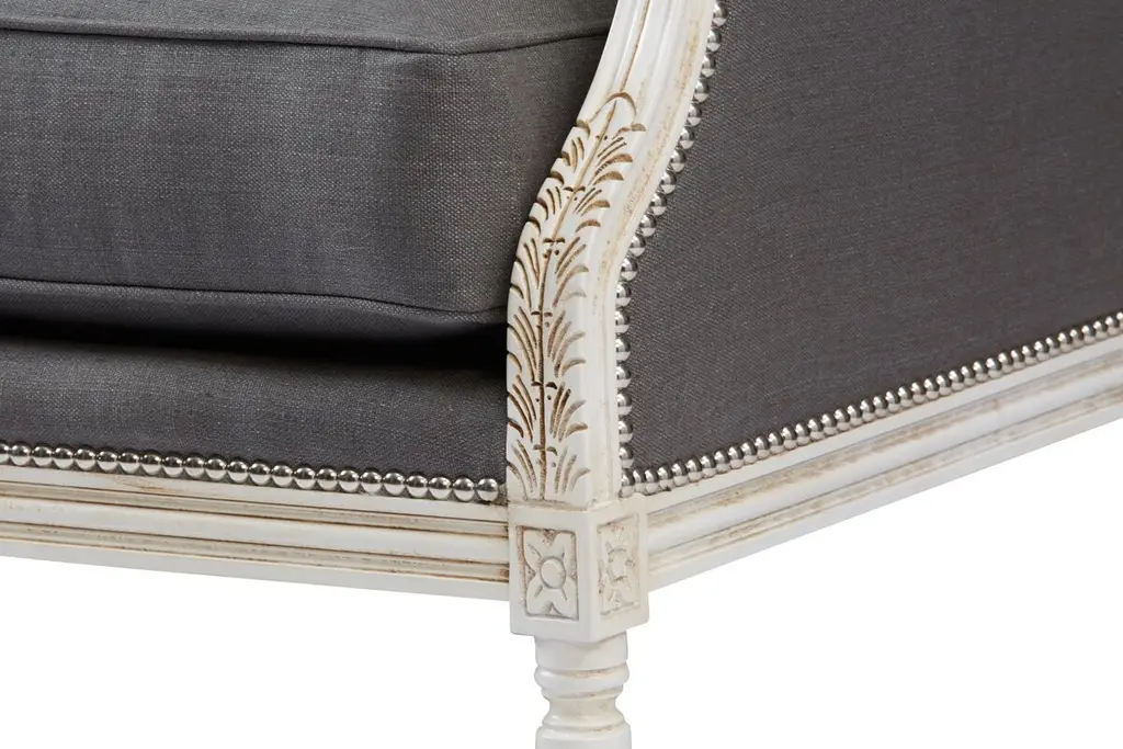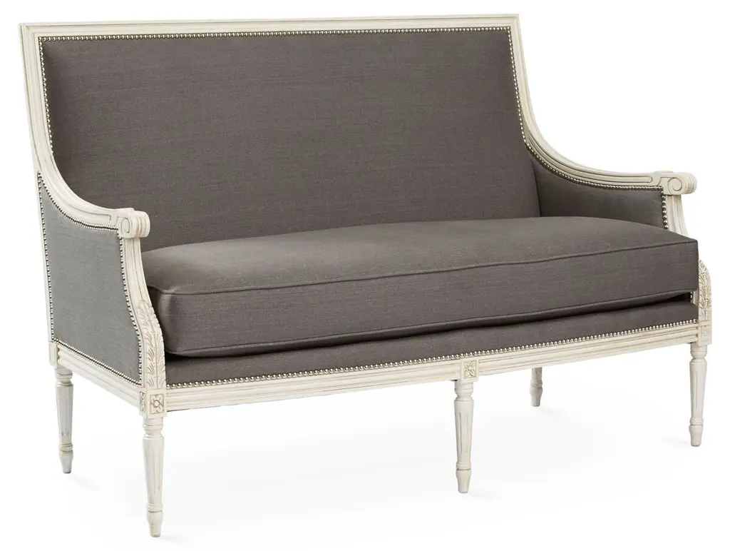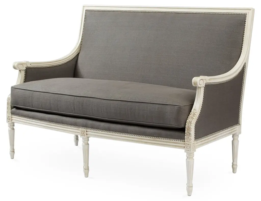 Designed by us and available only at One Kings Lane: Upholstered in graphite linen with a classically carved frame in an antiqued white finish, this settee will add timeless style to any room. The frame is made of beech, a wood favored by furniture makers for its strength and stability. A generous down-wrapped foam fill ensures lasting support and comfort. Handcrafted in the USA.
