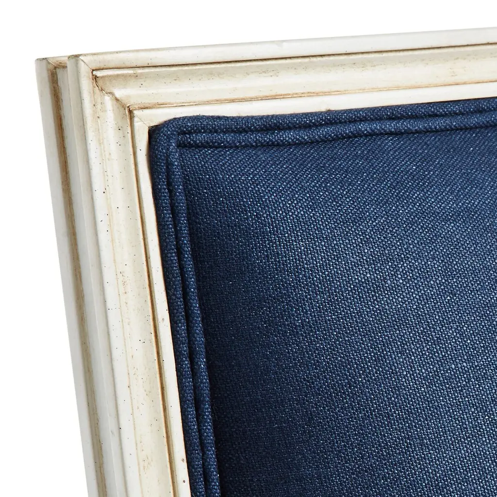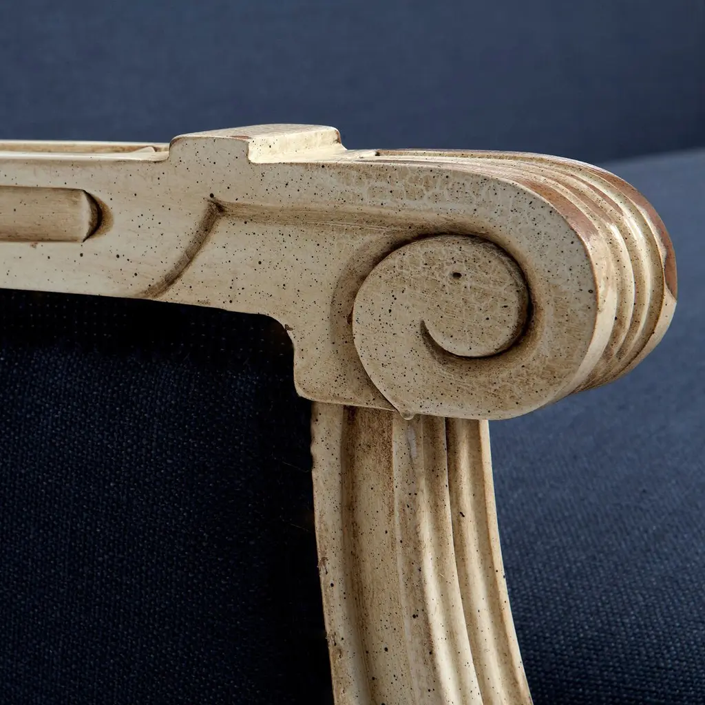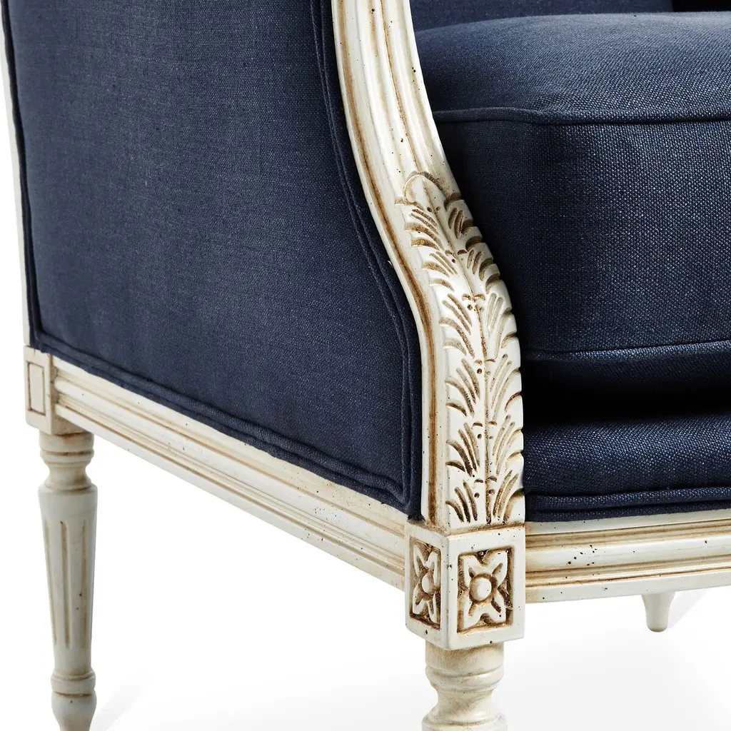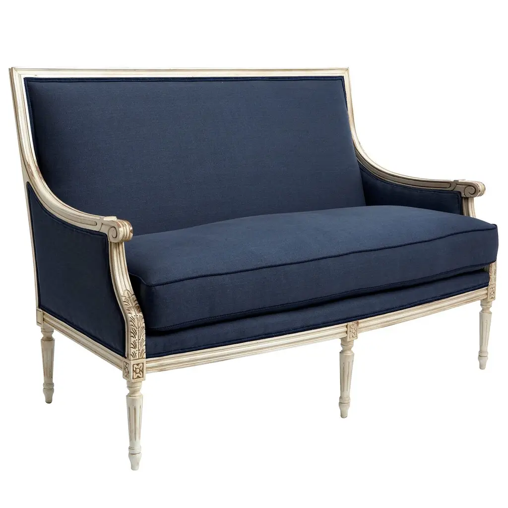 Designed by us and available only at One Kings Lane: Upholstered in navy linen with a classically carved frame in an antiqued white finish, this settee will add timeless style to any room. The frame is made of beech, a wood favored by furniture makers for its strength and stability. A generous down-wrapped foam fill ensures lasting support and comfort. Handcrafted in the USA.