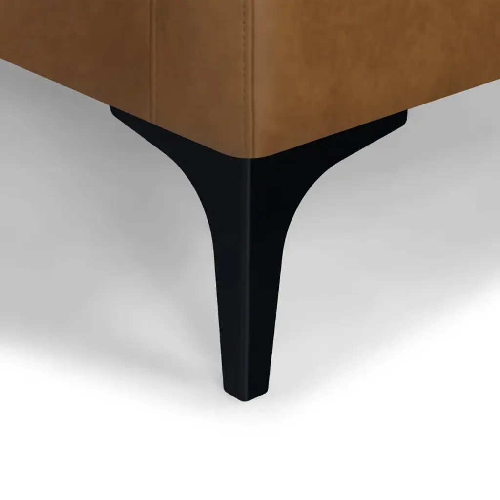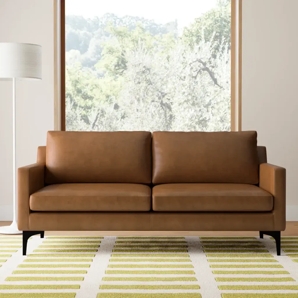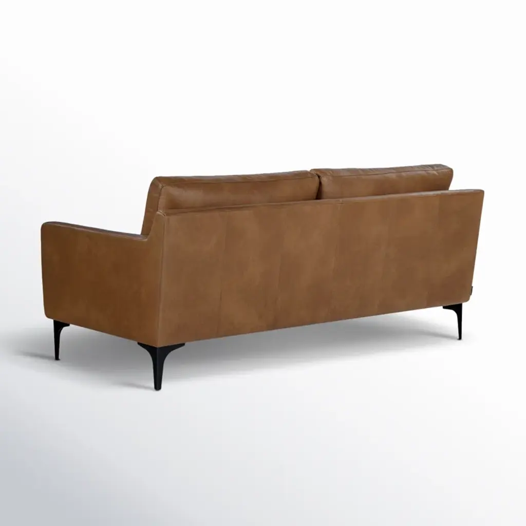 With a bold silhouette accented by contoured track arms and contrasting black metal bracket feet, this loveseat draws inspiration from modern Scandi design. A solid wood frame adds durability, and it's wrapped in richly hued + resilient genuine leather for an inviting vintage feel. Fiber-wrapped foam gives you ample support as you lounge.