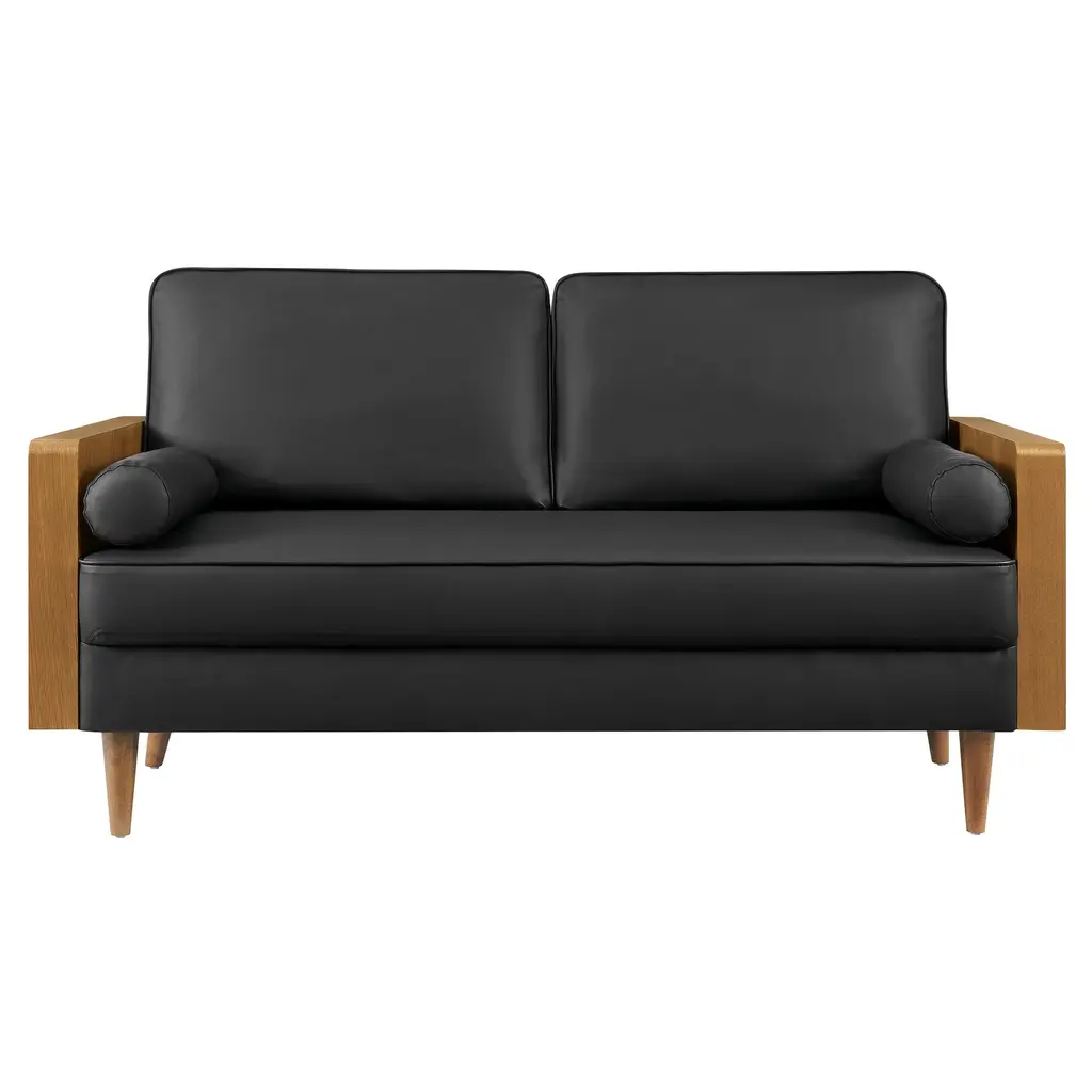 A statement piece for the discerning home, the Kellan Faux Leather Loveseat brings together style and comfort in an updated retro design. This loveseat sofa is upholstered in smooth vegan leather, offering a chic, sleek look that fits perfectly in small spaces. The beautiful wood grain armrests, crafted from rich veneer, add a touch of natural warmth to its mid century modern contemporary aesthetic. Supported by tapered wood legs with non-marking floor glides, this small space loveseat offers both style and practicality, protecting your flooring while enhancing the ambiance of a living room, bedroom, office, or reception area. High-density foam padding and zigzag spring support provide a premium seating experience, while the down feather blend of the back and bolster cushions add an extra layer of luxury. Whether as a loft loveseat or a comfortable living room sofa for relaxing, the Kellan is a versatile studio couch that will elevate your space with its refined style and supportive comfort. Assembly required. 2 Seater Loveseat Weight Capacity: 800 lbs.Vegan Leather Upholstery Wood Veneer Armrests Sinuous Spring Support Dense Foam Padding Down Blend Cushions Tapered Wood Legs Non-Marking Floor Glides Assembly RequiredOverall Product Dimensions: 31.89"L x 61.22"W x 33.86"HSeat Dimension: 26.7"L x 55.75"W x 18.31"HArmrest Dimension: 29.22"L x 2.96"W x 23.62"HBackrest Dimension: 2.76"L x 54.33"W x 10.04"HLeg Dimension: 2.17"L x 50"W x 6.3"HOne - Kellan Vegan Leather Loveseat
