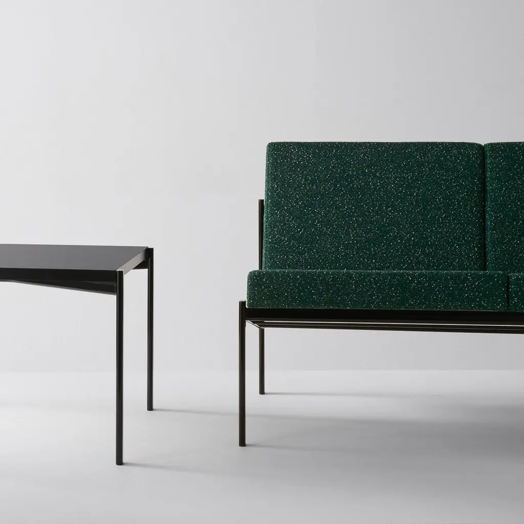 The Kiki Sofa has a frame made of distinctive oval steel tubing. The upholstery offers clean, smooth-edged contours that provide comfort and support. Compact in size and, like a mannequin, appealing in any color or fabric, its overall effect is one of memorable simplicity. The collection also includes the Kiki Bench, Lounge Chair, and Low Table. Modular in nature, the pieces in the collection can be combined in any number of configurations, while their compact size means they fit naturally into smaller spaces. Announcing a departure from designer Ilmari Tapiovaara's earlier work, Kiki employs a clean-cut design idiom.