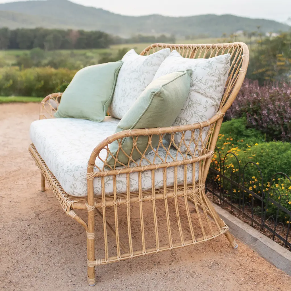 An updated version of mid-twentieth century rattan seating, Savannah preserves a balance between casual and formal design. Aluminum frames are antiqued to look like genuine rattan. They are then handwoven with all-weather wicker in a classic pattern. Fabrics Note: Additional fabric options are available upon request. Please contact us for a quote: 800-762-5374 or customercare@frontera.com. Please Note: Kingsley Bate fabrics, canopies, cushions, covers, special order sling colors, and special order finishes are considered customized and may have longer lead times. These items cannot be cancelled, returned, or exchanged. WARNING: This product can expose you to chemicals including Toluene, which is known to the State of California to cause cancer or birth defects or other reproductive harm. For more information go to www.P65Warnings.ca.gov/furniture.