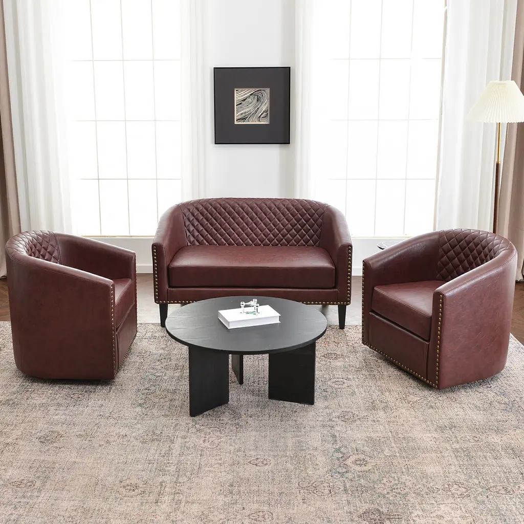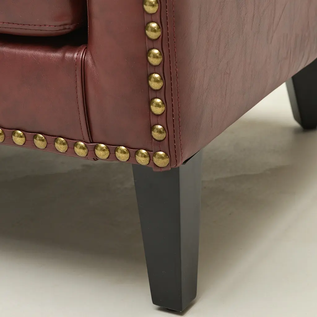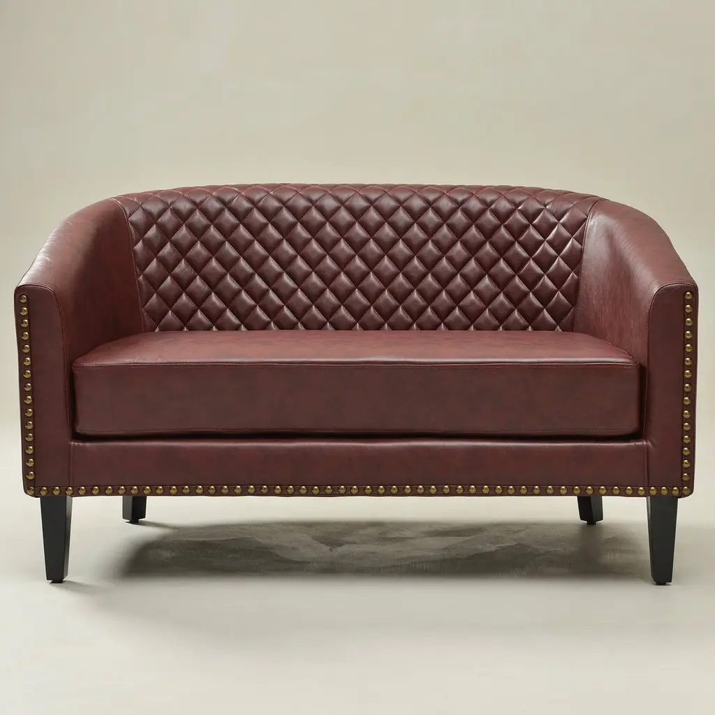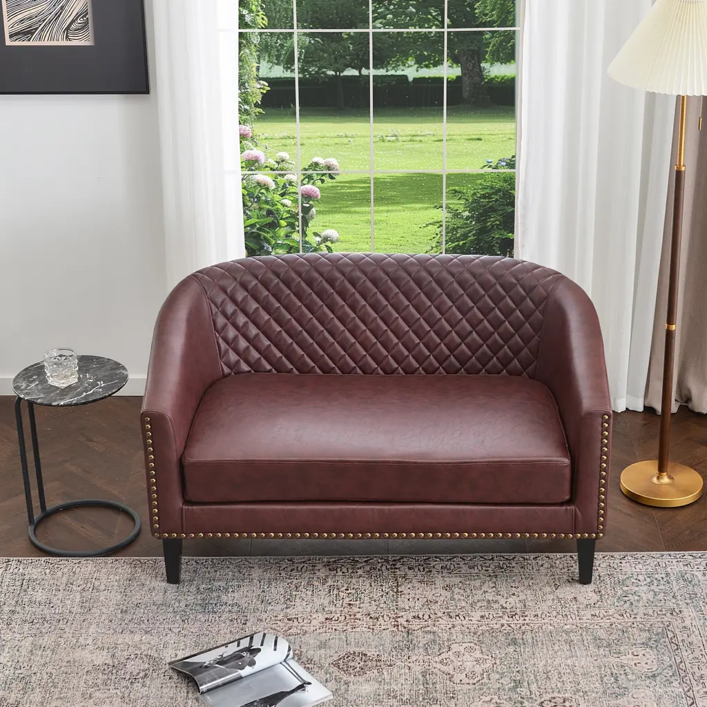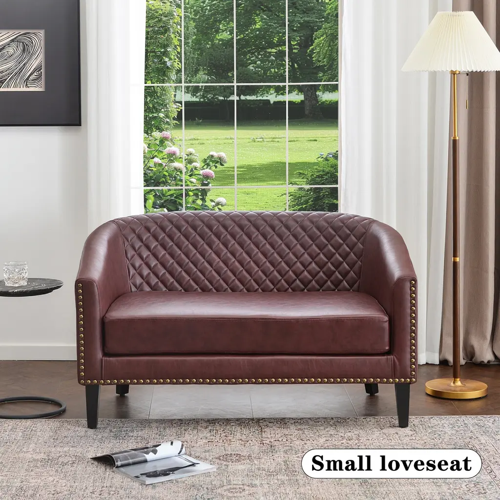 This exquisite barrel-shaped loveseat is the perfect choice for modern homes, particularly those with limited space. Crafted from high-quality PU material, it is waterproof, stain-resistant, and easy to clean. The diamond button tufted upholstery adds a touch of luxury, while the plump diamond pattern on the backrest and the serpentine spring cushioning ensure a comfortable, soft, and bouncy seating experience. The ample seat depth allows for full relaxation. The barrel silhouette, adorned with brass rivets, adds a vintage charm that makes it a focal point in any setting. Whether used as a single-seater or a loveseat, this sofa adapts perfectly, and its compact size makes it ideal for small spaces.FeaturesDimensions: