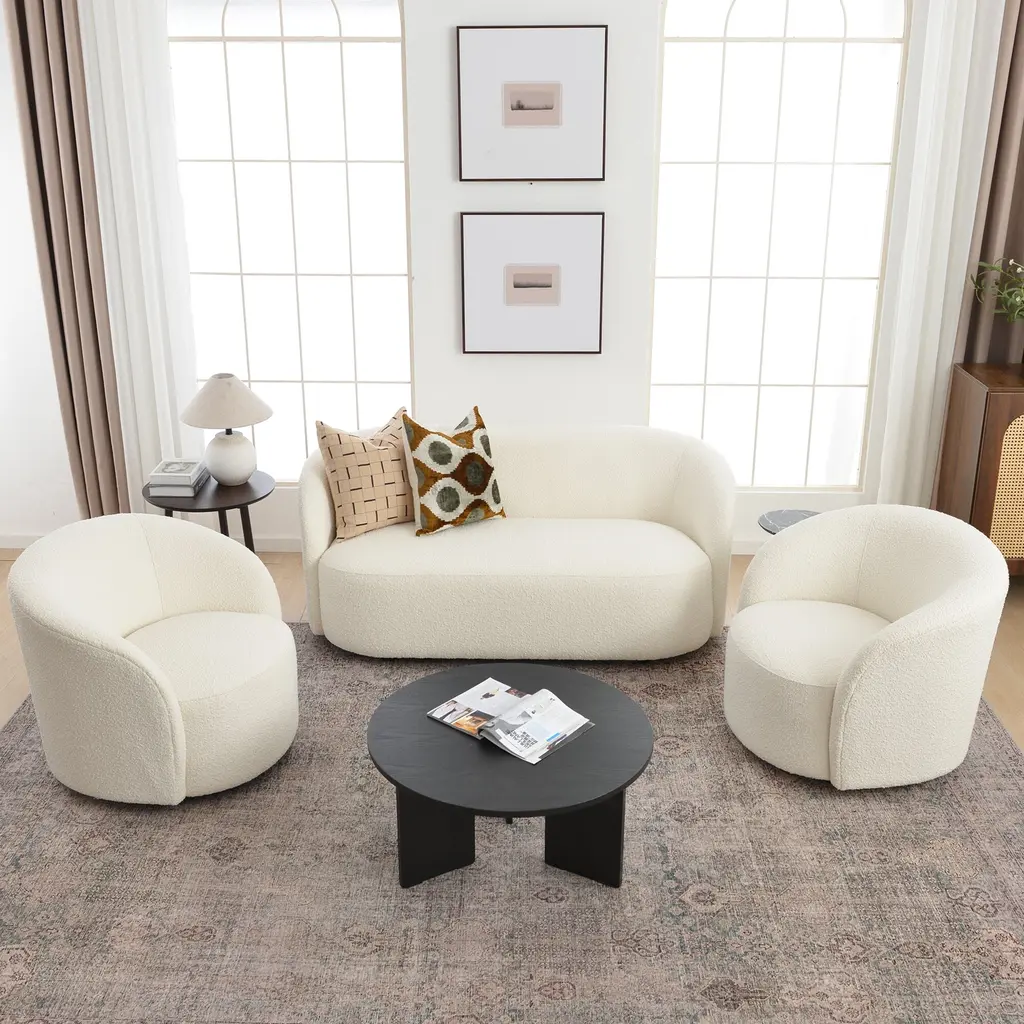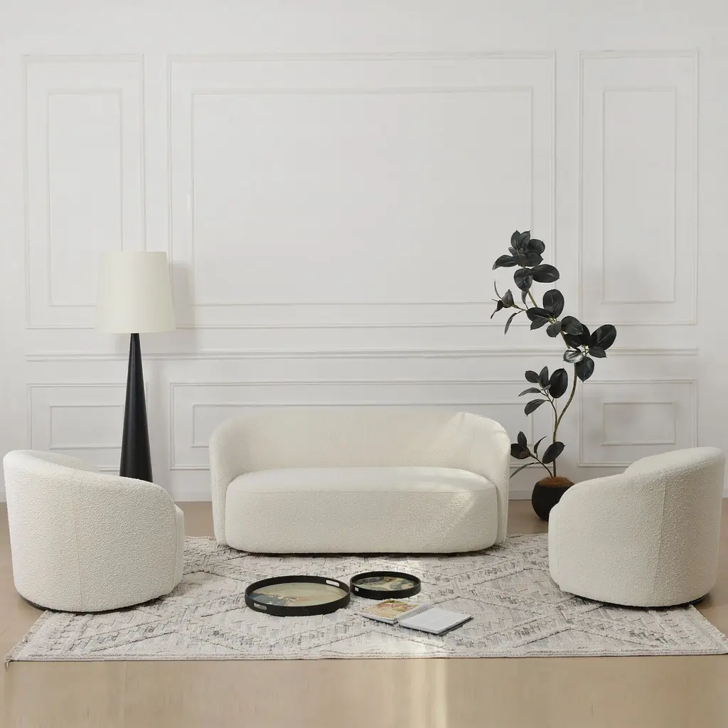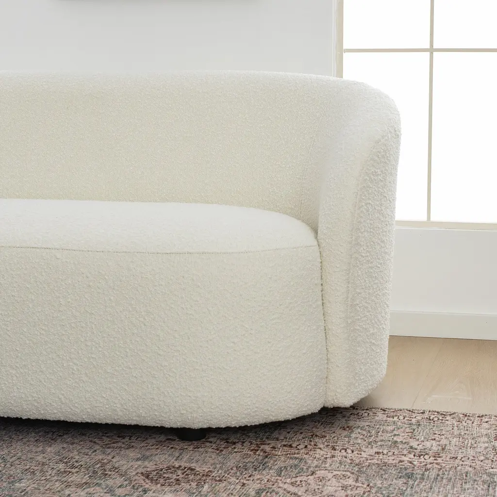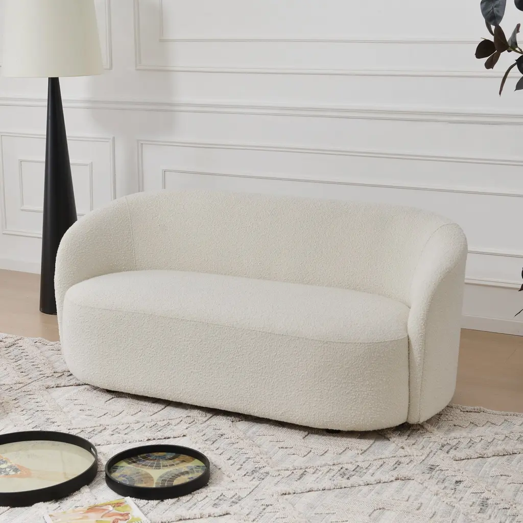Introducing our 68-inch wide Loveseat Sofa, where comfort meets elegance. Upholstered in luxurious Bouclé fabric, this sofa not only feels soft and cozy but adds a sophisticated texture to your living space. The frame is crafted from a sturdy combination of solid pine and plywood, ensuring long-lasting durability.The tight back design provides firm support, while the flared arms add a touch of modern style. The seat cushions are constructed with 7 springs, offering the perfect balance of comfort and resilience, making it the ideal spot to relax after a long day.No assembly is required—simply unpack and enjoy! Plus, you can customize the height to your preference with the included 4-inch replacement legs, in addition to the standard 2-inch legs. Whether you prefer a low-profile look or a higher stance, the choice is yours.Transform your home with this stylish and versatile loveseat, designed for both comfort and convenience.FeaturesDimensionsWhat's Included?