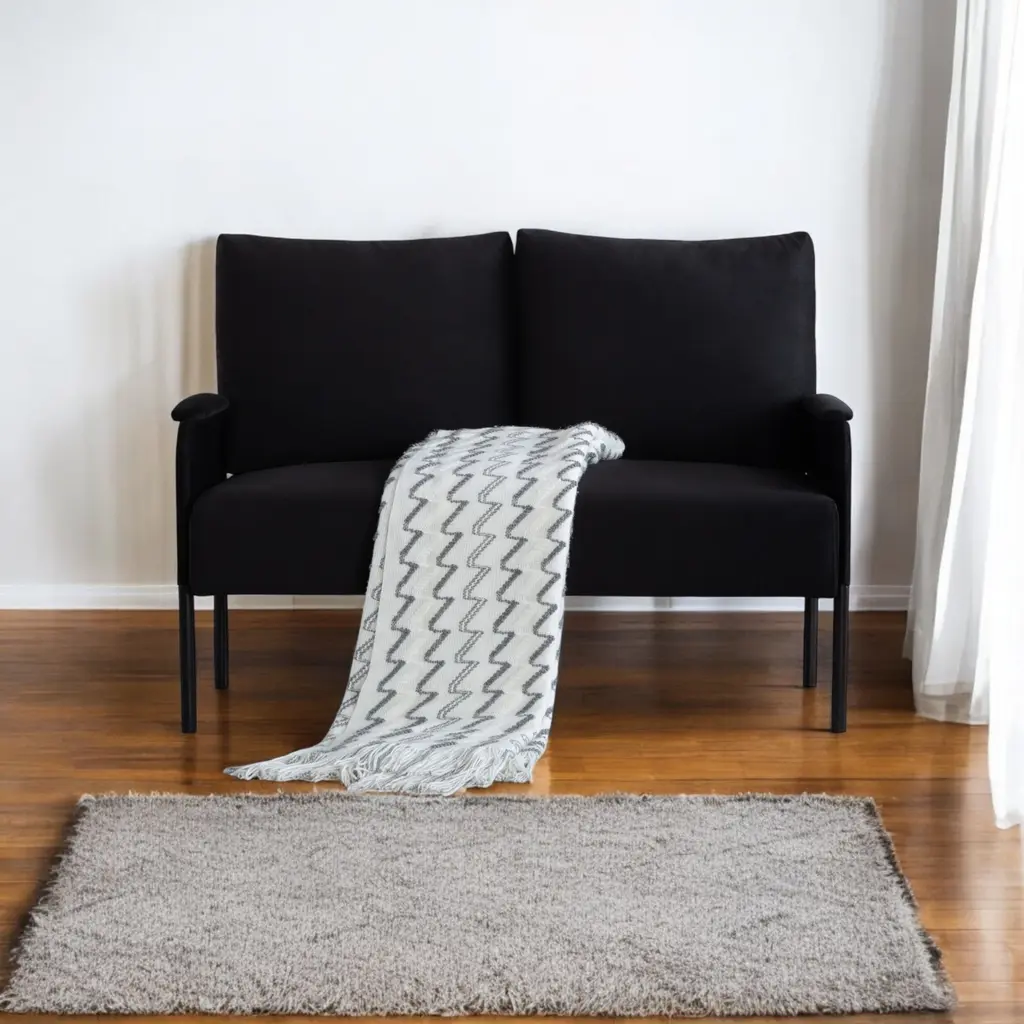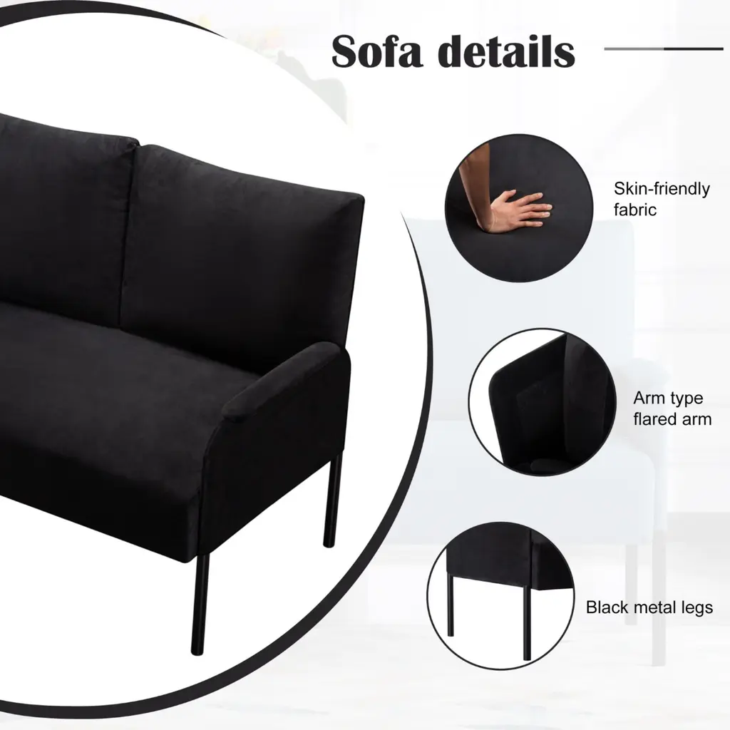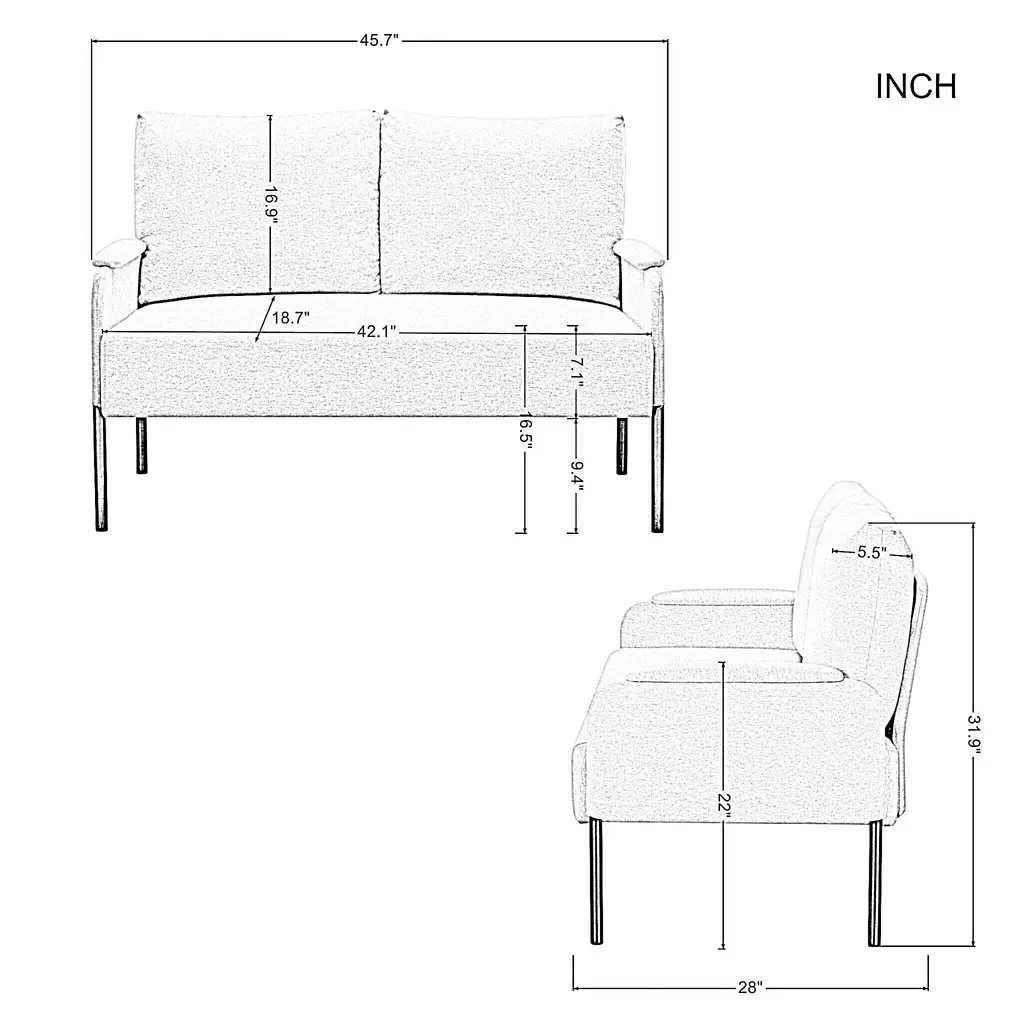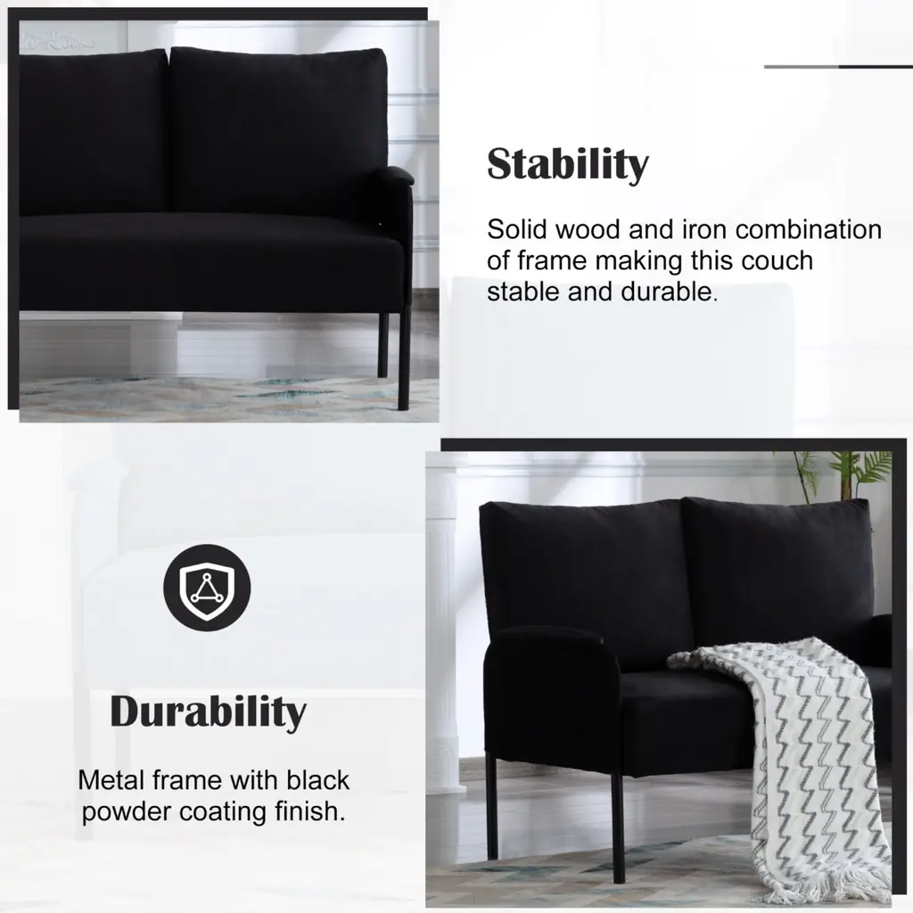 - 45.7" Metal Frame Loveseat Couch, designed with simple lines and black metal legs, it complements any decor and provides a cozy spot for relaxation. - Stability & Durability: solid wood and iron combination of frame making this couch stable and durable, metal frame with black powder coating finish; - Seat filled with high-density form which makes the couch more comfortable, and soft. And Square arms with padding brings extra comfortable feeling. - This loveseat is perfect for small spaces. It fits well in apartments or rooms with limited space, making it ideal for reading, watching TV, etc. - Back cushion cover is removable and washable. - The non-slip rubber pads on the bottom of legs ensure stability and avoid scratching the floor. - Easy to assemble, all parts, tools & instructions come in box, takes 10~15 minutes to assemble it. - Compressed package of back cushion. Please rebound 72 hours after opening the package for your perfect use. Caution - Please do not open the compressed packaging until your sofa frame is completely assembled, otherwise it can't be repacked in original packing way to return. - Please review the product dimension and check if it's suitable for your room. - It might be have color difference due to photograph lighting, or computer monitor displayed. It's not quality issue.