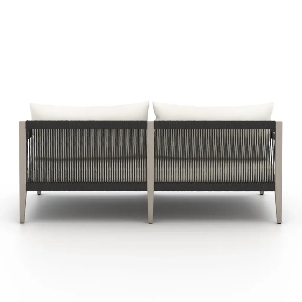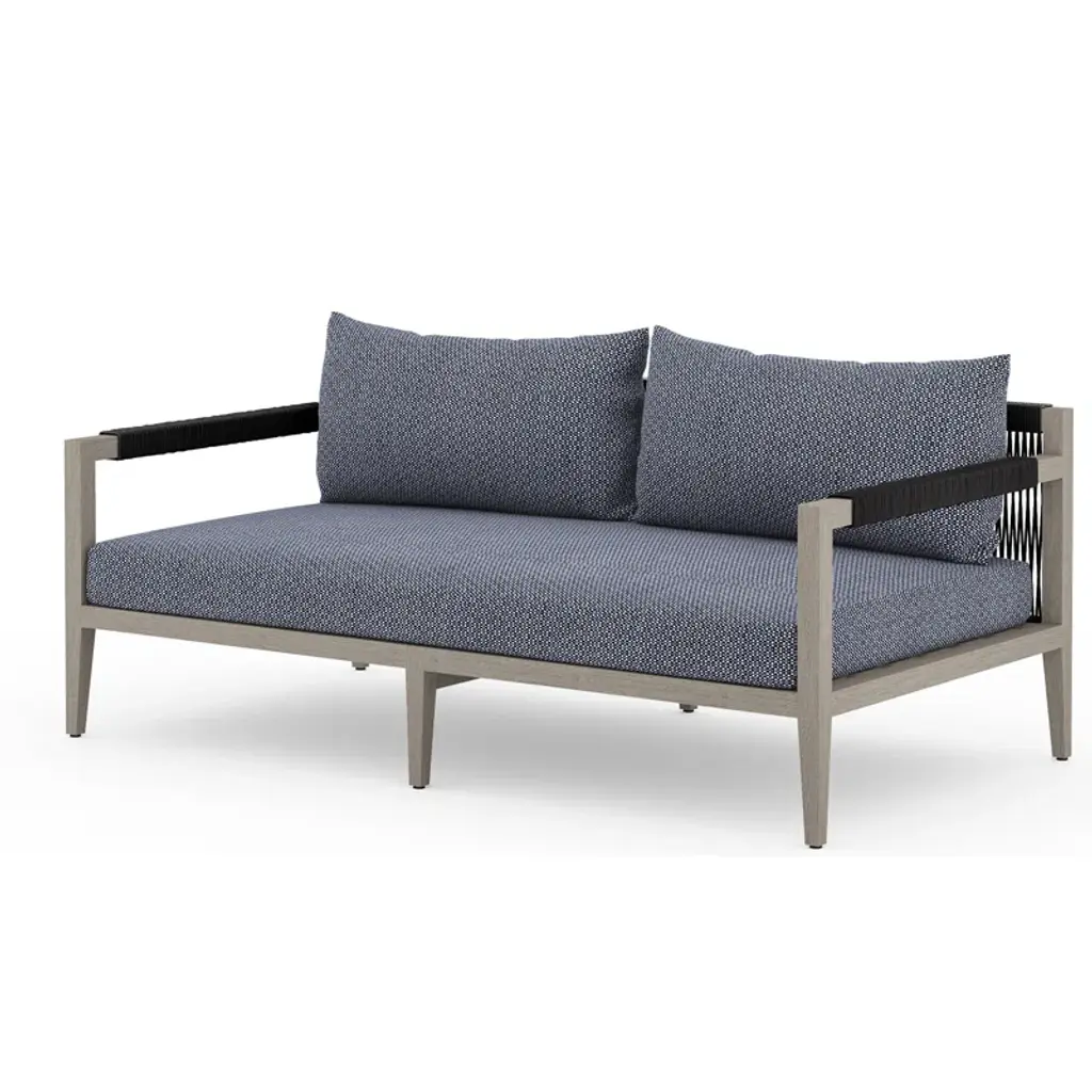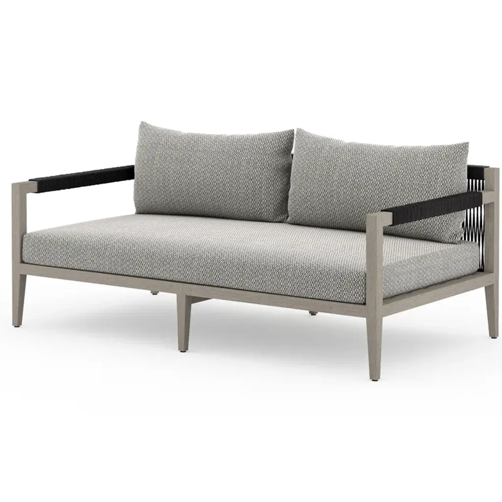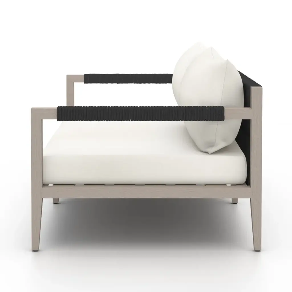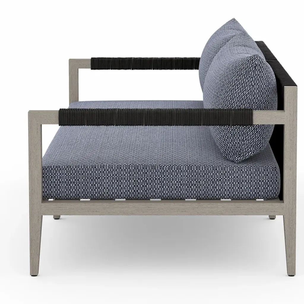 Modern materials ready a stylish silhouette for the outdoors. Teak forms a linear frame for UV-resistant and water-repellent sunproof fabric. Rope-wrapped armrests and rear cotton-weaving add a textured finishing touch. Cover or store indoors during inclement weather.